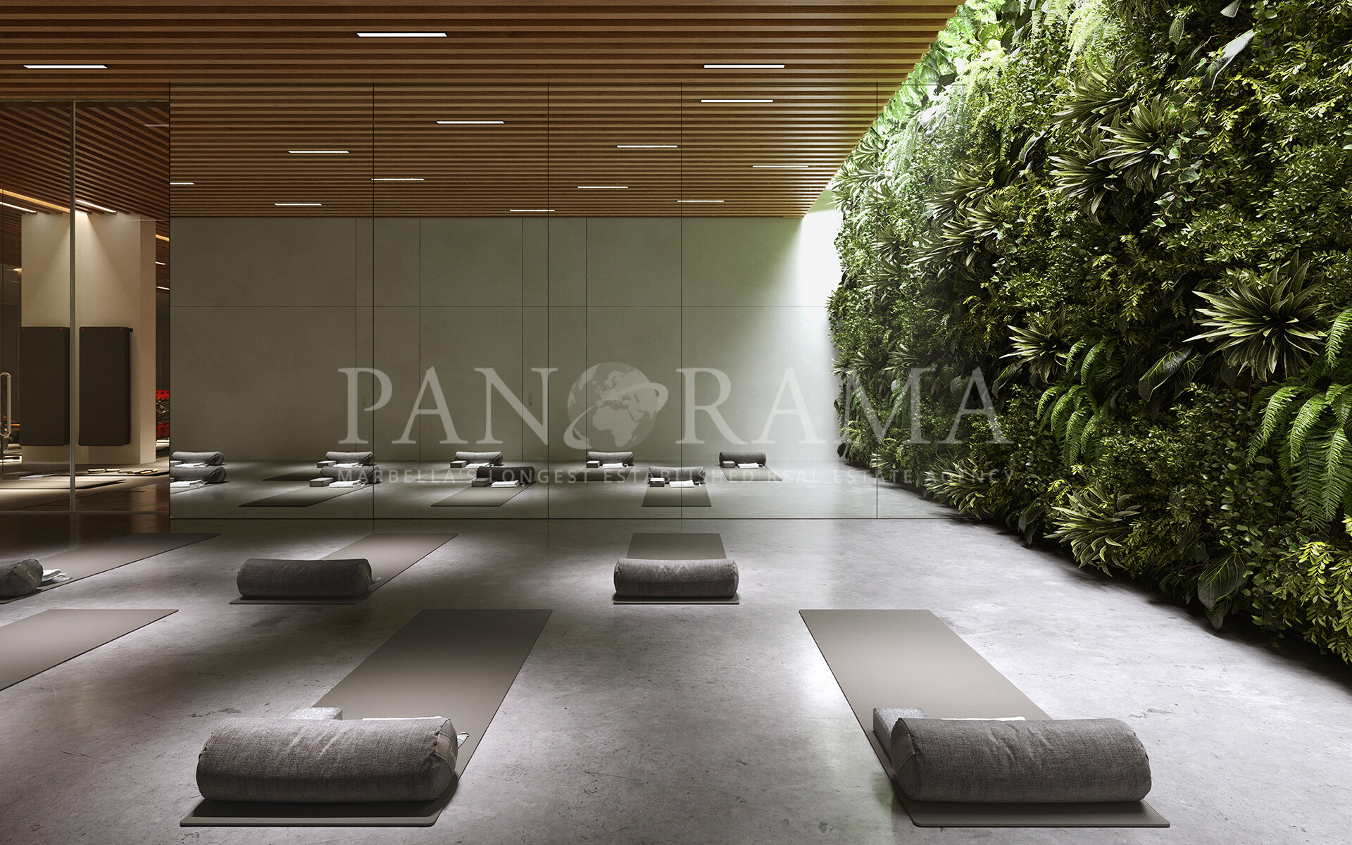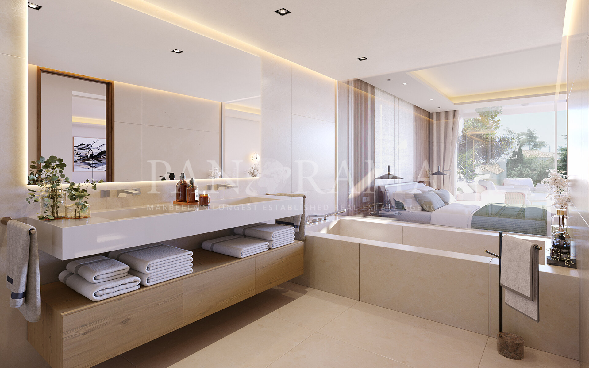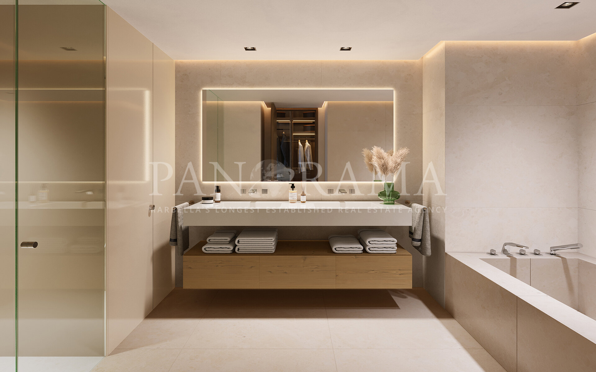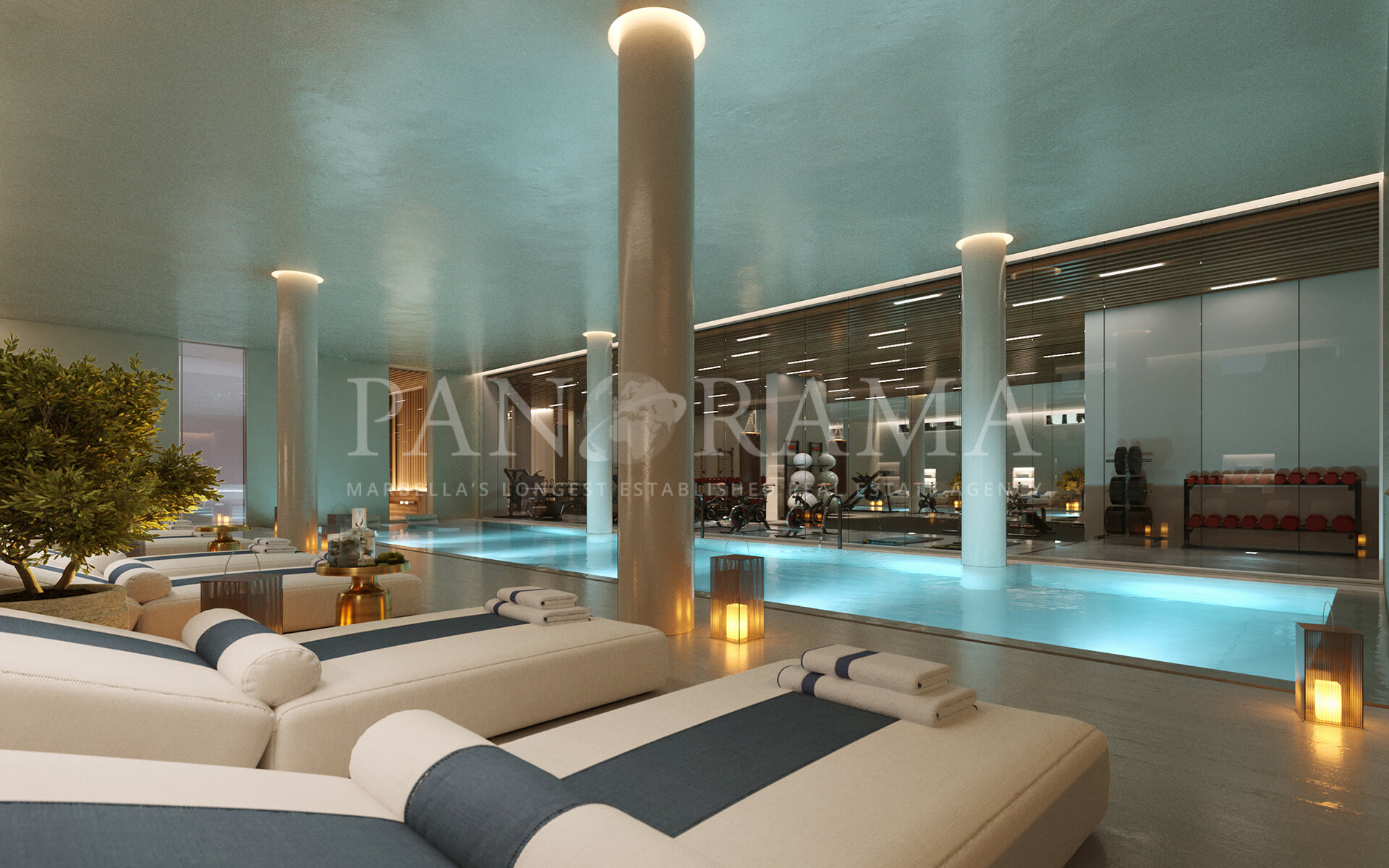Nouveau projet situé dans le meilleur emplacement à Marbella, sur le Golden Mile, à quelques minutes du légendaire Marbella Club Hotel, du Puente Romano Resort et de la plage. Une communauté fermée de 28 appartements et penthouses ultra-modernes de 3 à 4 chambres avec salles de bains attenantes répartis sur quatre blocs – Eau, Pierre, Bois et Sable. Des appartements au rez-de-chaussée avec jardin privé et terrasses étendues, des appartements au premier étage, des penthouses semi-duplex au premier étage et des penthouses en duplex de taille double, tous avec une grande terrasse et un solarium avec piscine privée. Ces résidences sont conçues pour offrir une vie contemporaine dans une communauté fermée privée, avec une surveillance 24/7 qui définit la norme en termes de sécurité. Le design moderne et luxueux des appartements, construits selon les plus hautes qualités, est équilibré par l’utilisation de tons chauds et une ample lumière naturelle. Ils offrent de beaux espaces de vie ouverts, des cuisines haut de gamme de Modulnova et bien plus encore. Chaque résidence est équipée d’une domotique sophistiquée. Toutes les résidences comprennent deux places de parking souterrain et une salle de stockage ainsi qu’une pré-installation pour la recharge des voitures électriques. Outre la grande piscine extérieure d’eau salée située dans les magnifiques jardins, un spa impressionnant avec une grande piscine intérieure chauffée avec une cascade donnant sur la salle de sport entièrement équipée. Une salle de yoga dédiée et un choix de saunas secs et humides offrent un refuge serein. Ses plus jeunes résidents profiteront de leur propre club pour enfants et piscine. Il s’agit de la meilleure offre de maisons modernes et durables exclusives disponibles dans le meilleur emplacement à Marbella aujourd’hui. La construction a déjà commencé et devrait être terminée au printemps 2025.