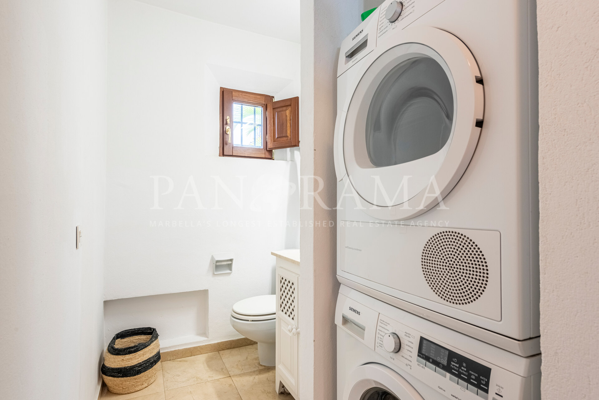 La propriété bénéficie de finitions de haute qualité, notamment des sols blancs dans les principales zones de vie et des sols en marbre élégants dans les salles de bains pour une touche de luxe. Le design global harmonise le charme traditionnel andalou avec une modernité fonctionnelle.