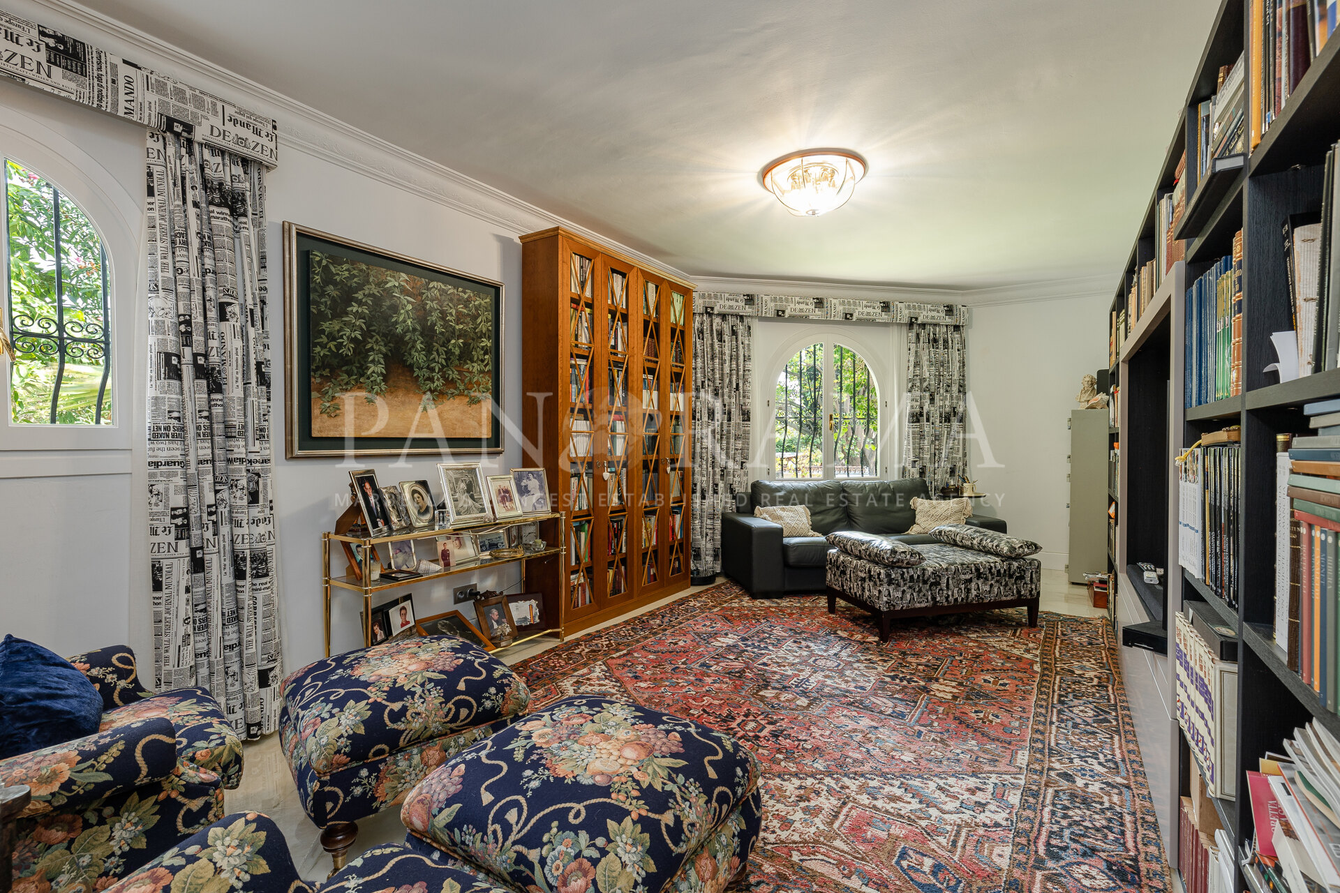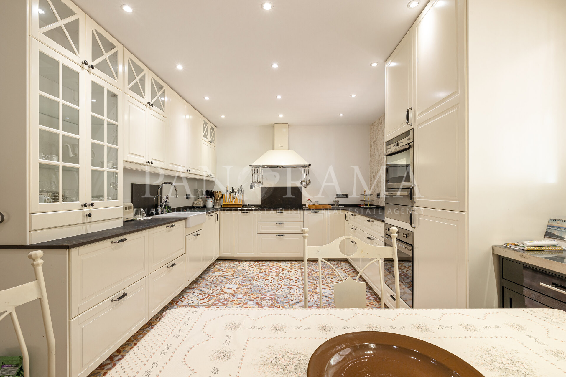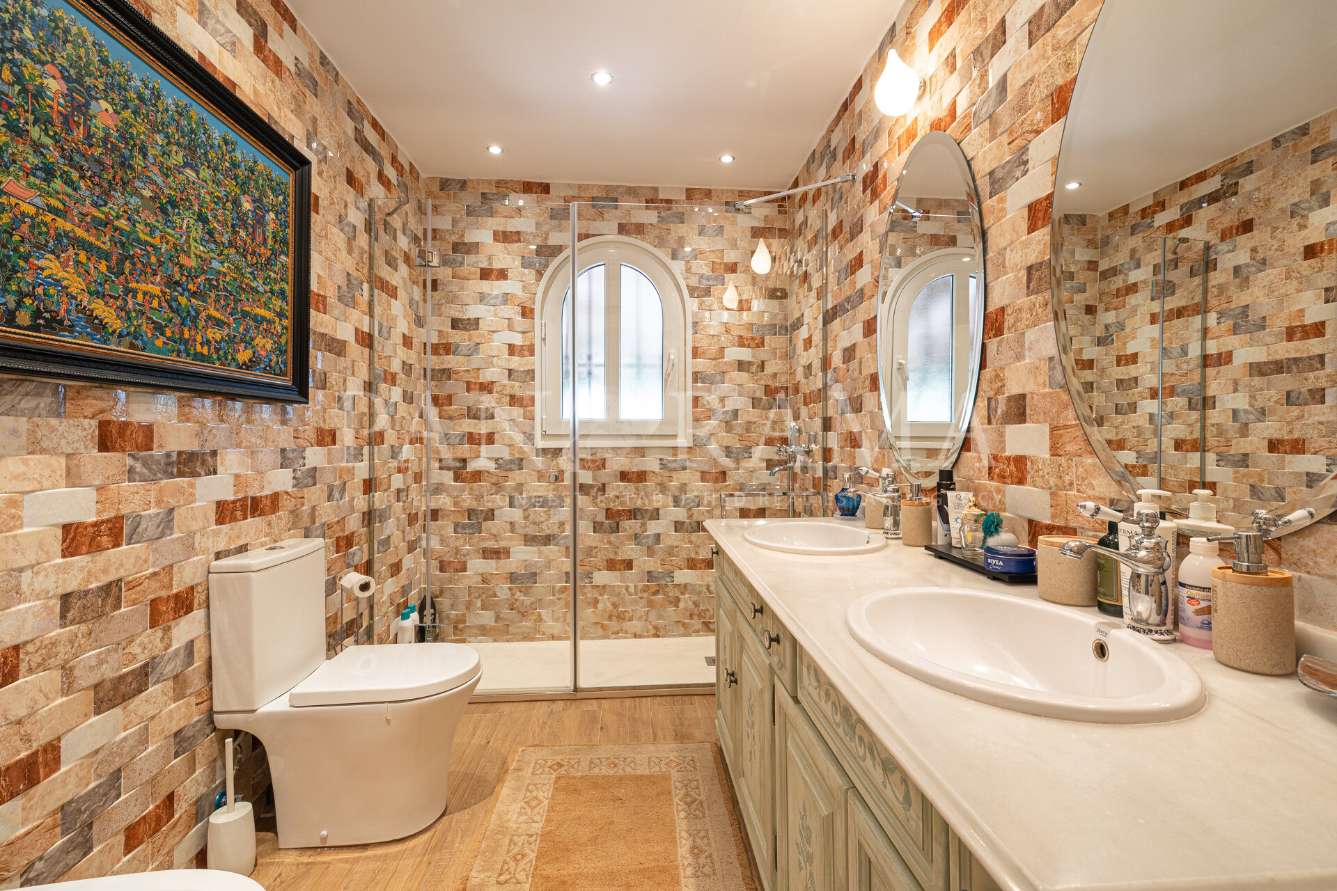 La villa dispose de six chambres spacieuses et de quatre salles de bains, dont trois en suite, en plus d’un toilette invité. L’intérieur est conçu pour maximiser le confort, avec une cuisine entièrement rénovée et équipée, un grand salon confortable comprenant une cheminée et de grandes fenêtres. Les sols en marbre et en bois ajoutent une touche d’élégance, tandis que le système de climatisation et de chauffage central assure un environnement agréable tout au long de l’année.