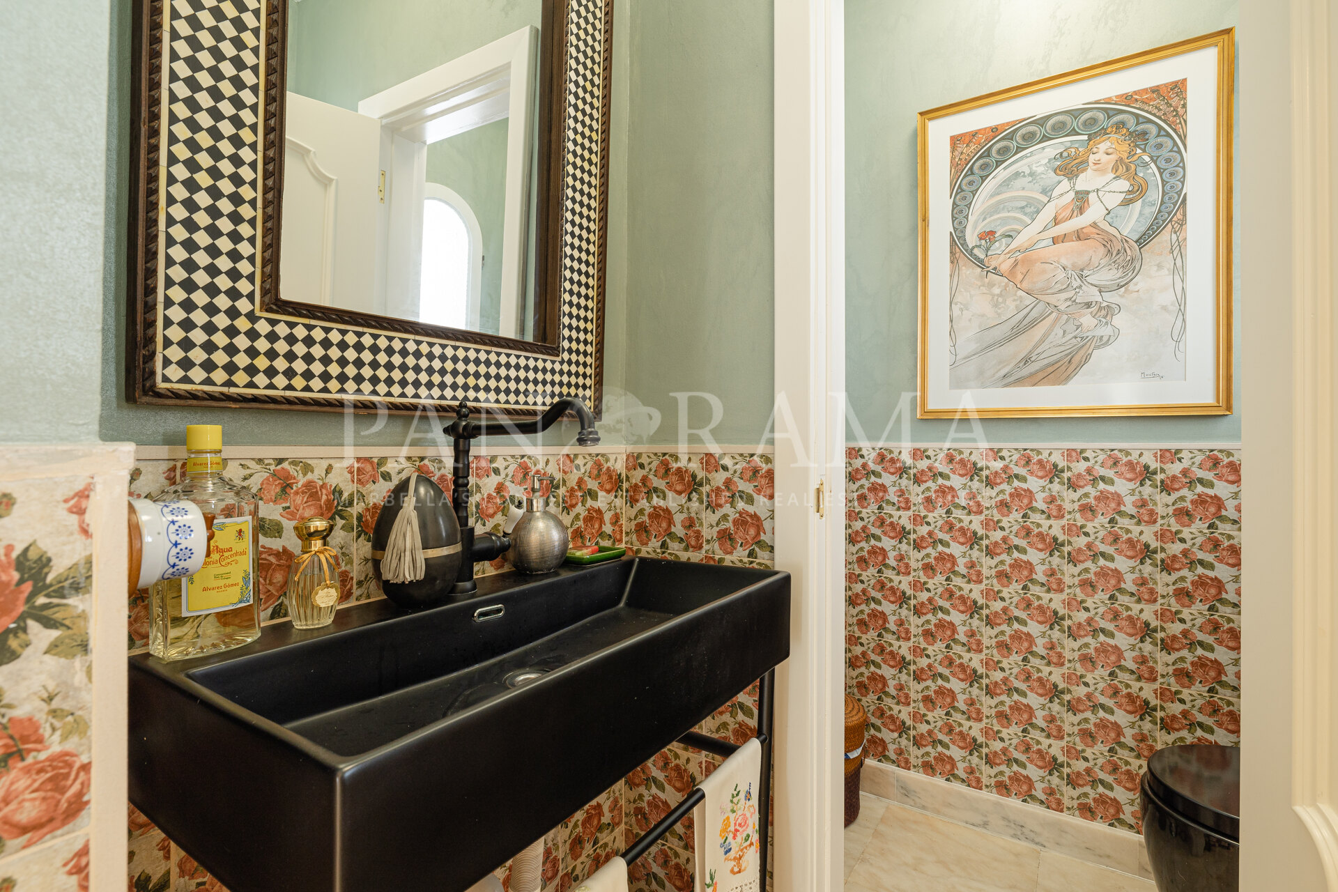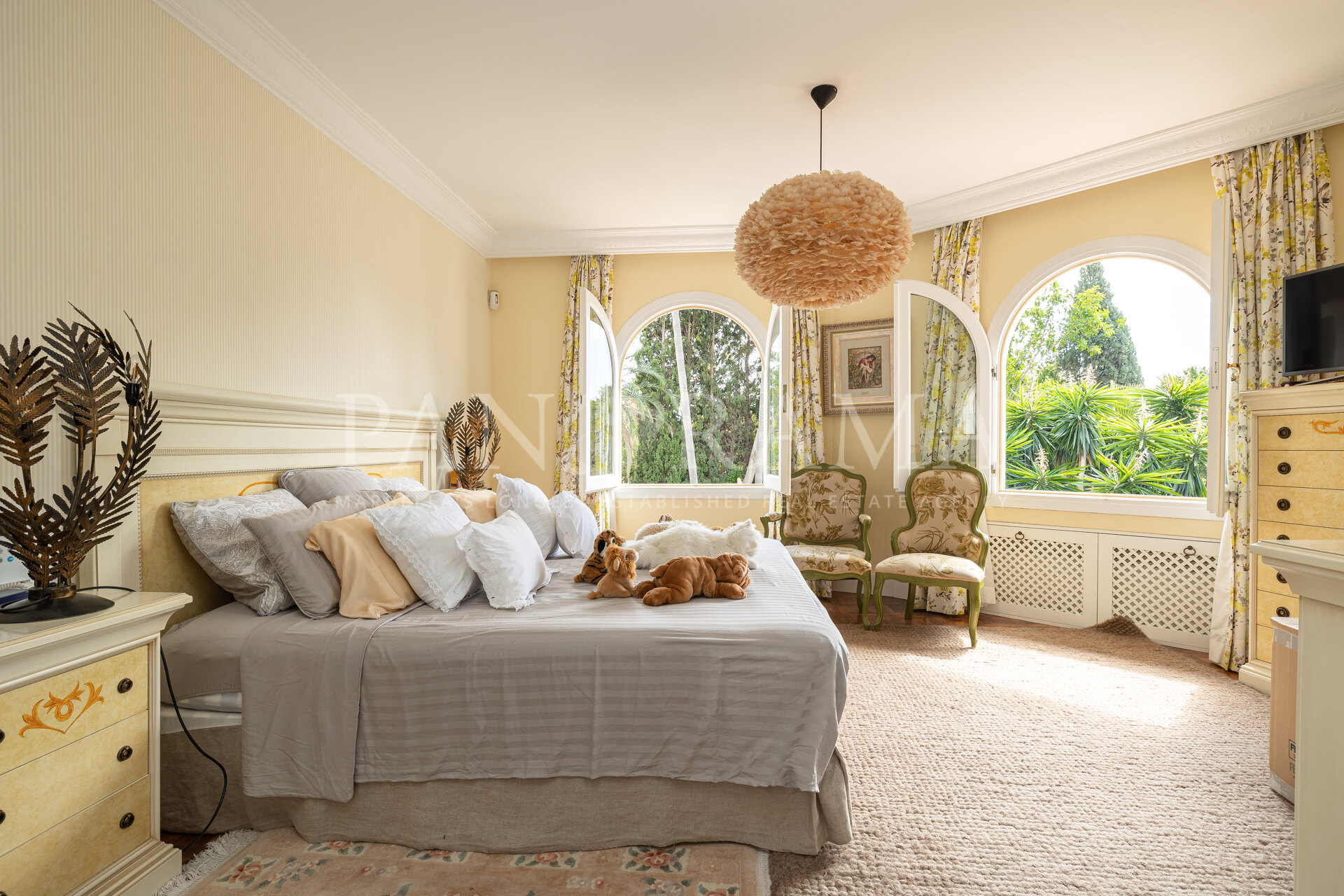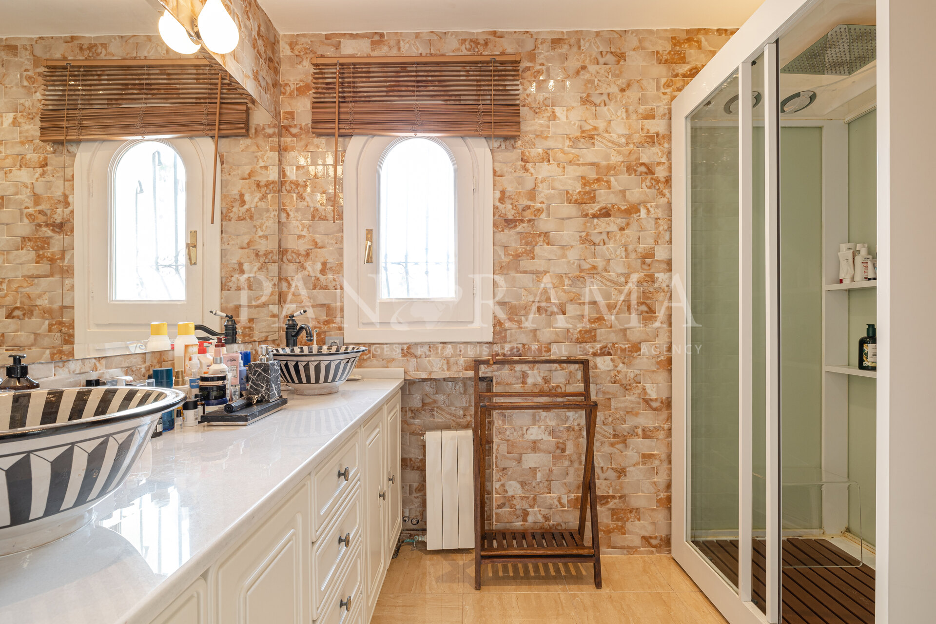 La villa dispose de six chambres spacieuses et de quatre salles de bains, dont trois en suite, en plus d’un toilette invité. L’intérieur est conçu pour maximiser le confort, avec une cuisine entièrement rénovée et équipée, un grand salon confortable comprenant une cheminée et de grandes fenêtres. Les sols en marbre et en bois ajoutent une touche d’élégance, tandis que le système de climatisation et de chauffage central assure un environnement agréable tout au long de l’année.