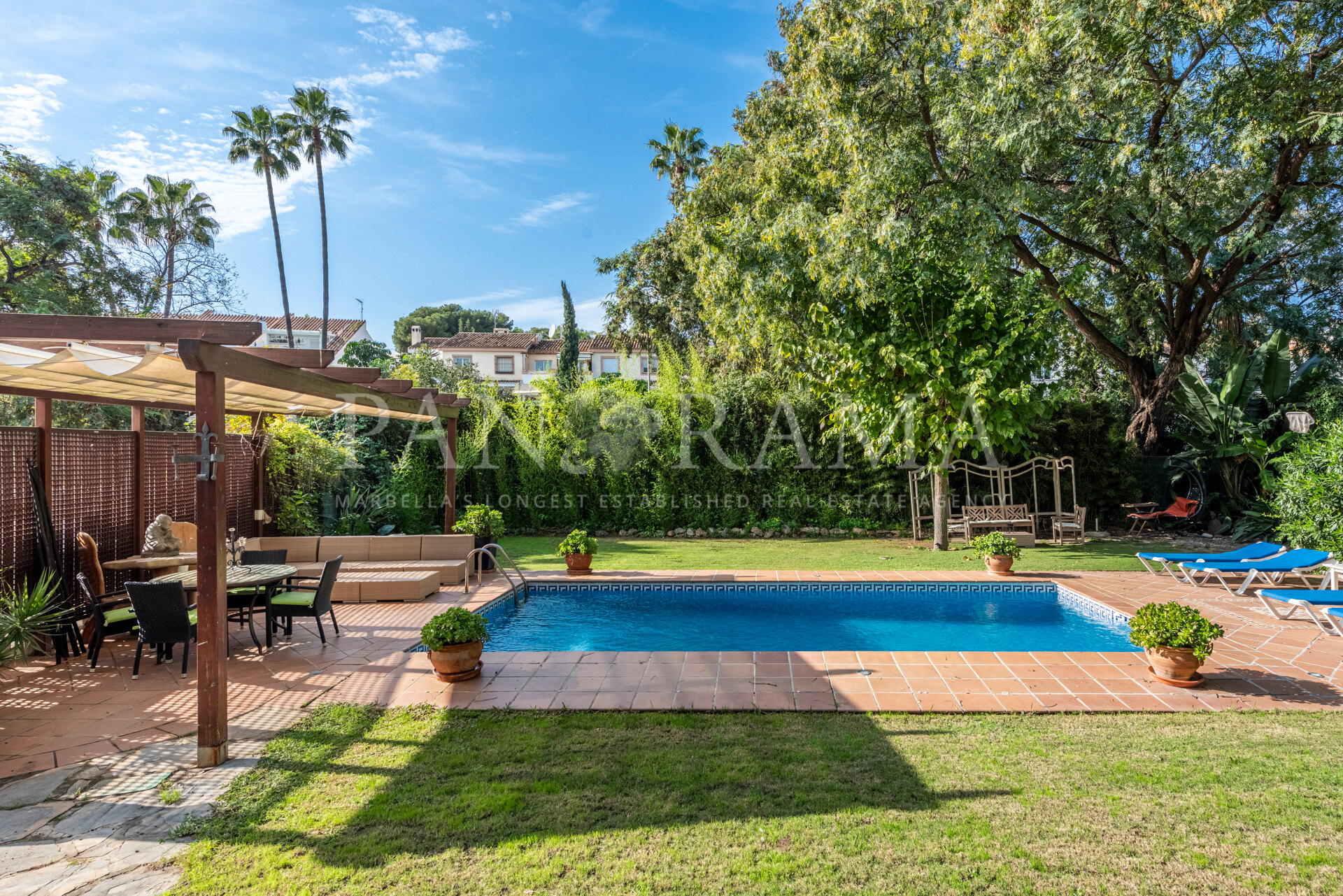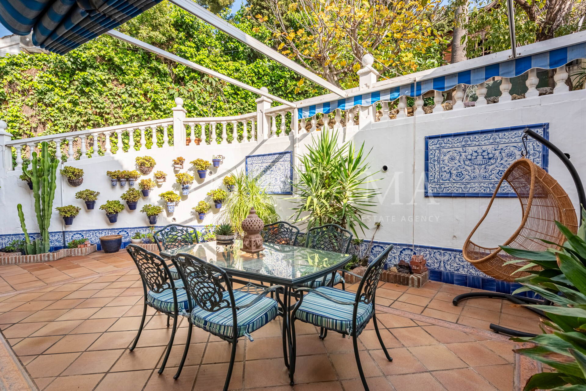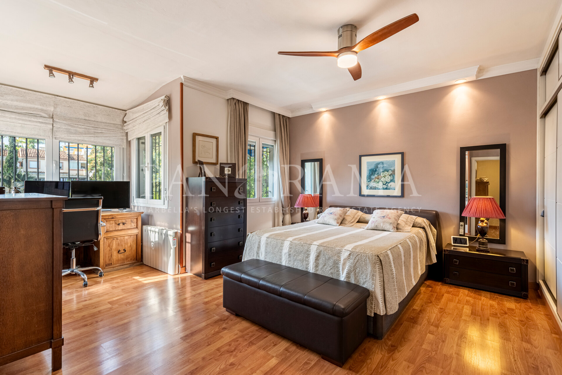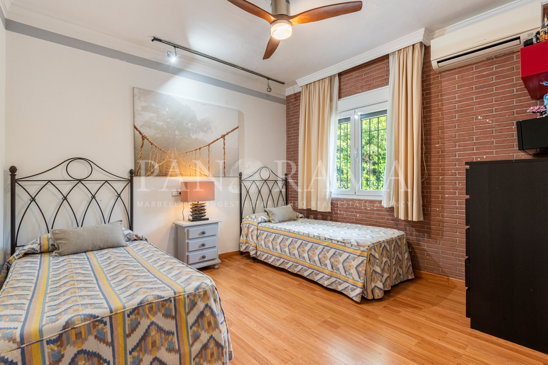 Cette maison jumelée orientée à l’ouest est située au cœur de Nueva Andalucía, offrant un emplacement enviable à distance de marche de Puerto Banús, de la plage et de toutes les commodités essentielles. Nichée au milieu d’un jardin luxuriant et mature, la propriété est soigneusement répartie sur trois niveaux, offrant un agencement spacieux et polyvalent qui répond à la fois au confort et à la fonctionnalité. Avec un total de cinq chambres en suite et des espaces de vie extérieurs et intérieurs généreux, cette maison offre un immense potentiel pour être modernisée en un havre familial contemporain.