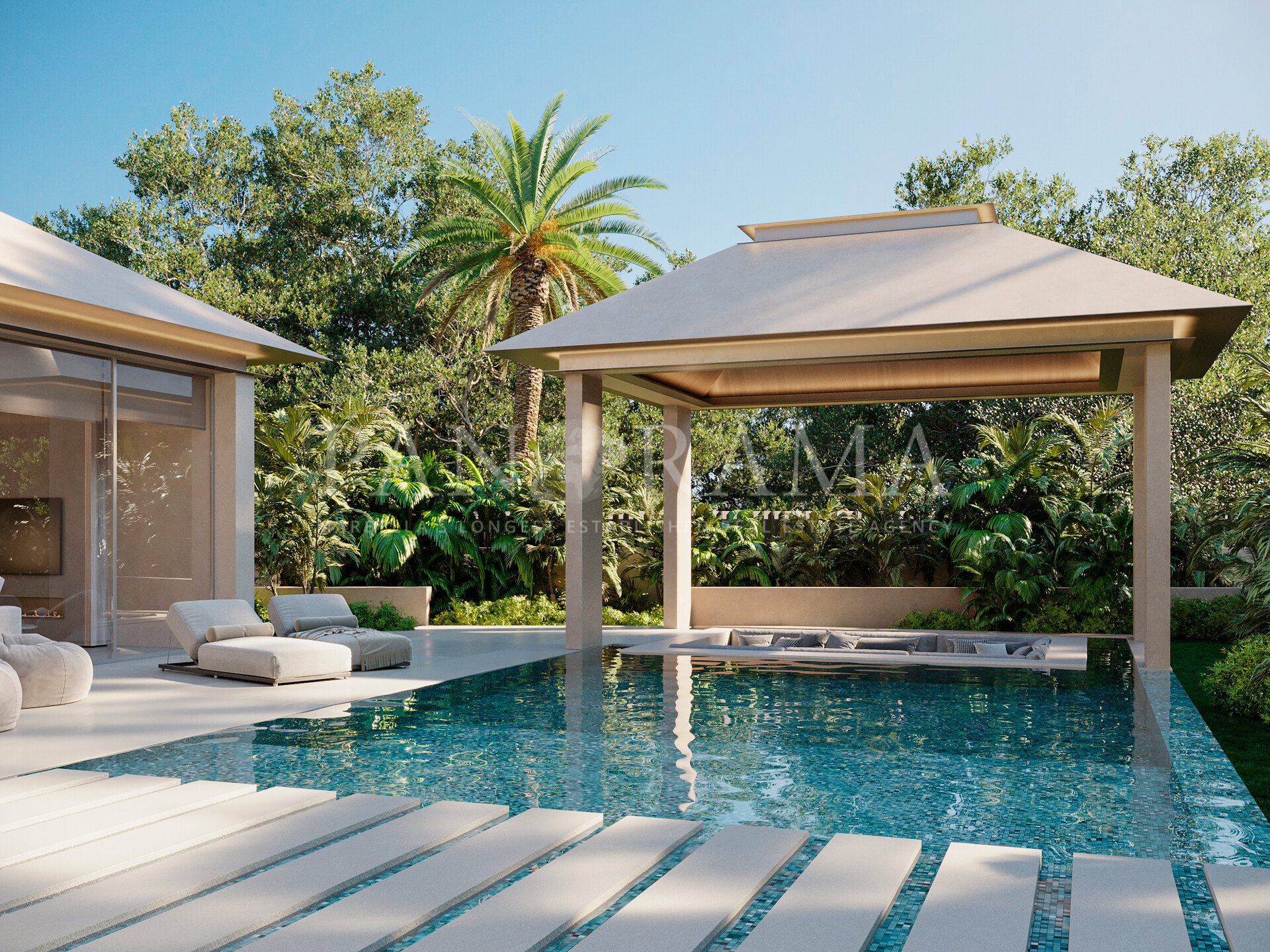 Le plan ouvert de la propriété a été conçu pour maximiser la connexion entre les espaces intérieurs et extérieurs. De vastes baies vitrées du sol au plafond laissent entrer la lumière naturelle et offrent des vues apaisantes sur les jardins paysagers et la piscine. La cuisine gastronomique, équipée d’appareils haut de gamme, s’intègre harmonieusement aux élégants espaces de vie et de réception, offrant un cadre idéal pour recevoir ou partager des moments en famille. Pour ceux qui privilégient le bien-être et la détente, la résidence constitue un véritable havre privé.