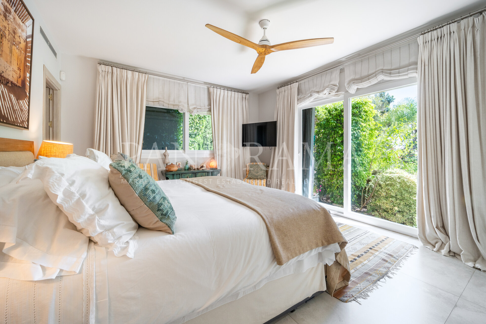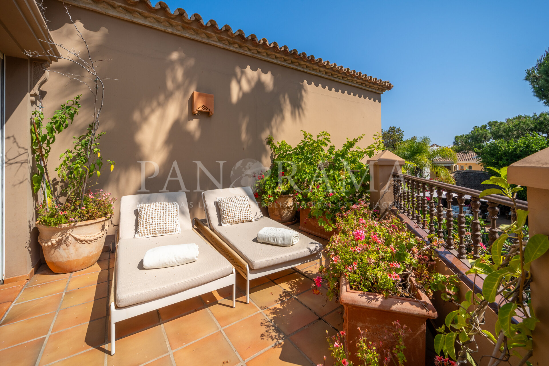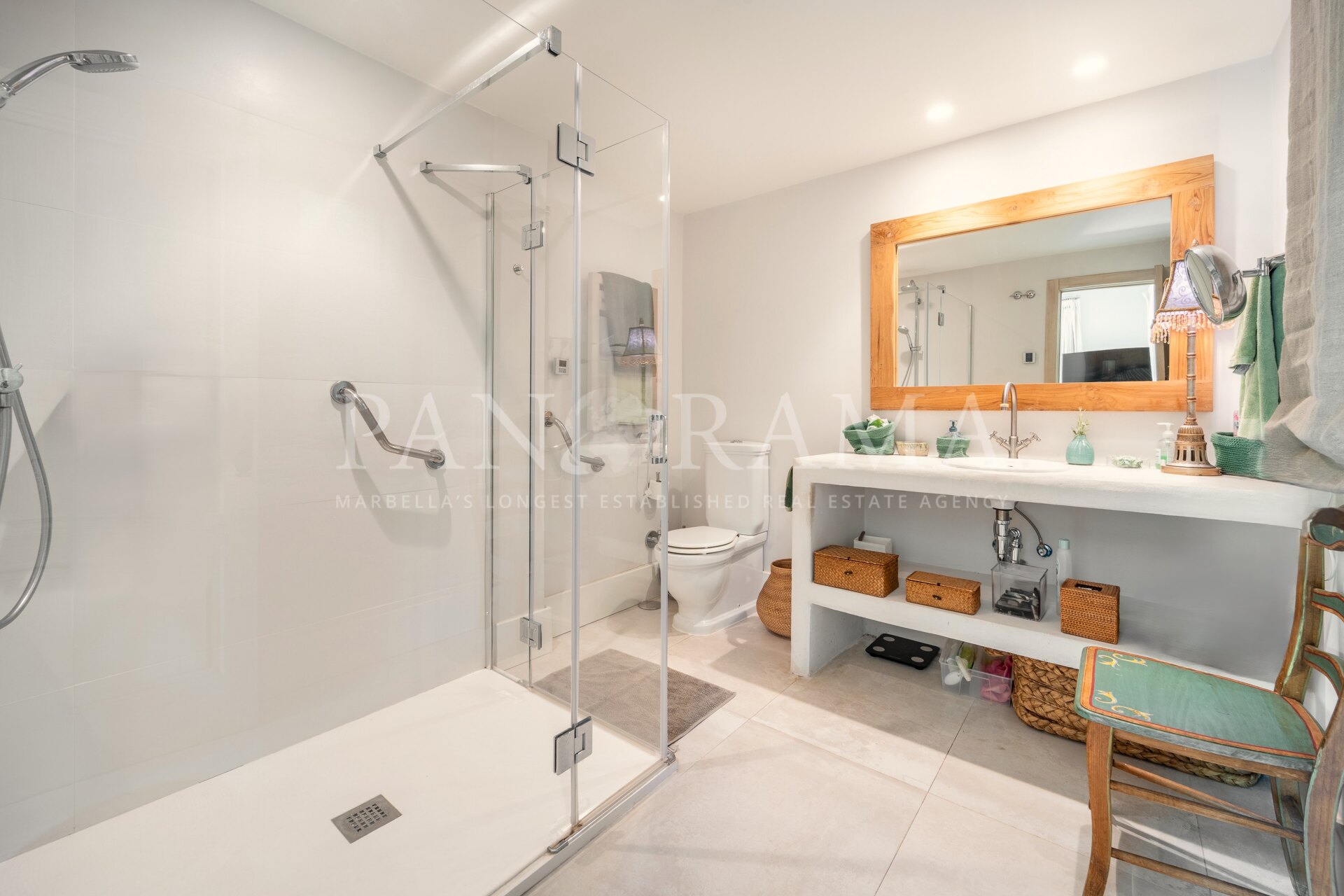 The master bedroom, with an en-suite bathroom, also has direct access to a large terrace with panoramic views of the pool and garden. In addition, there are two more en-suite bedrooms, ensuring optimal privacy and comfort for all residents. Both enjoy plenty of natural light.