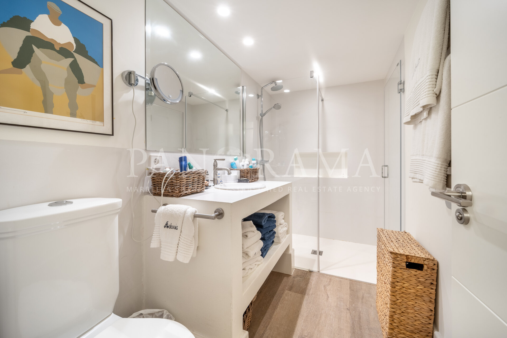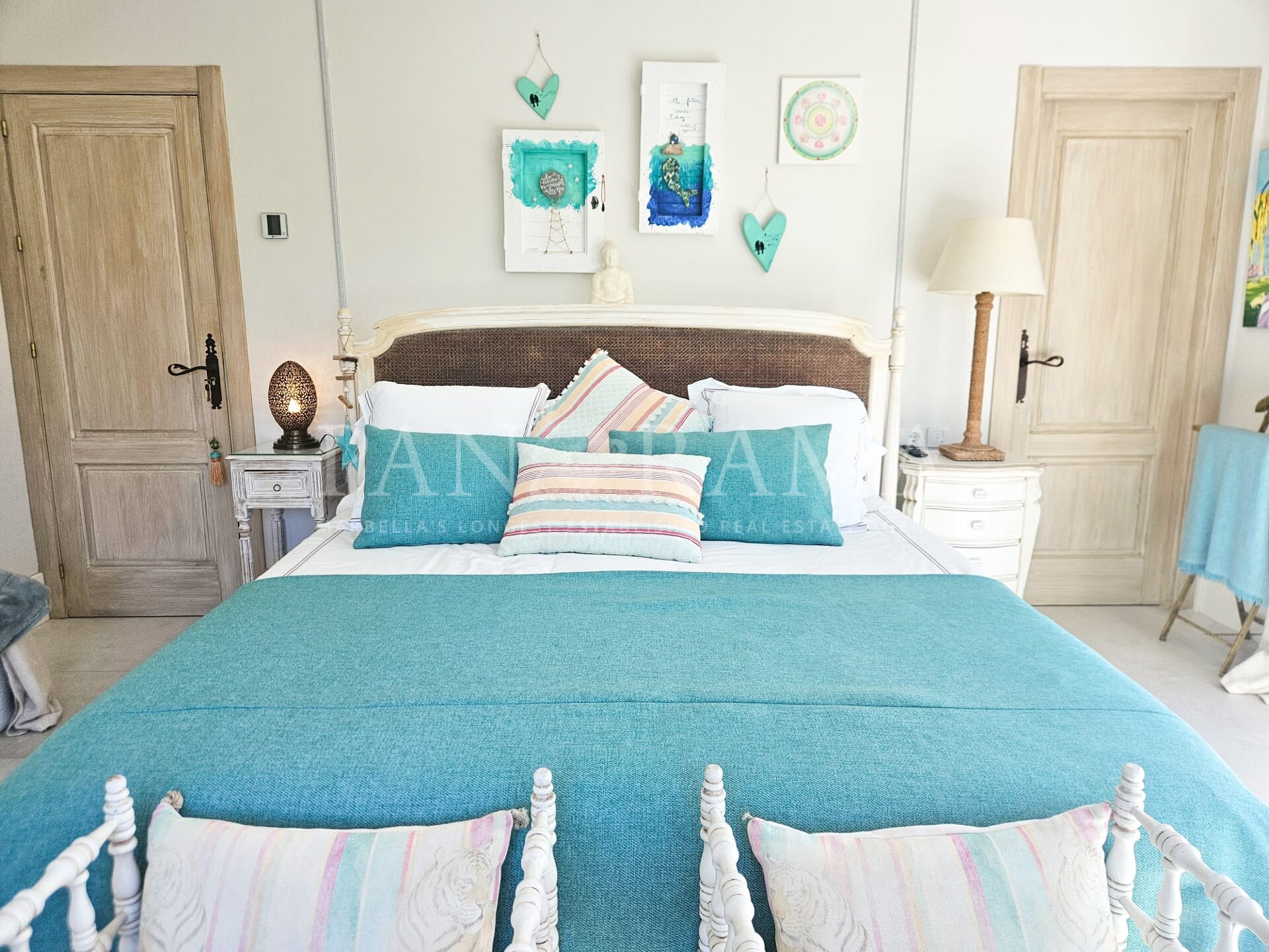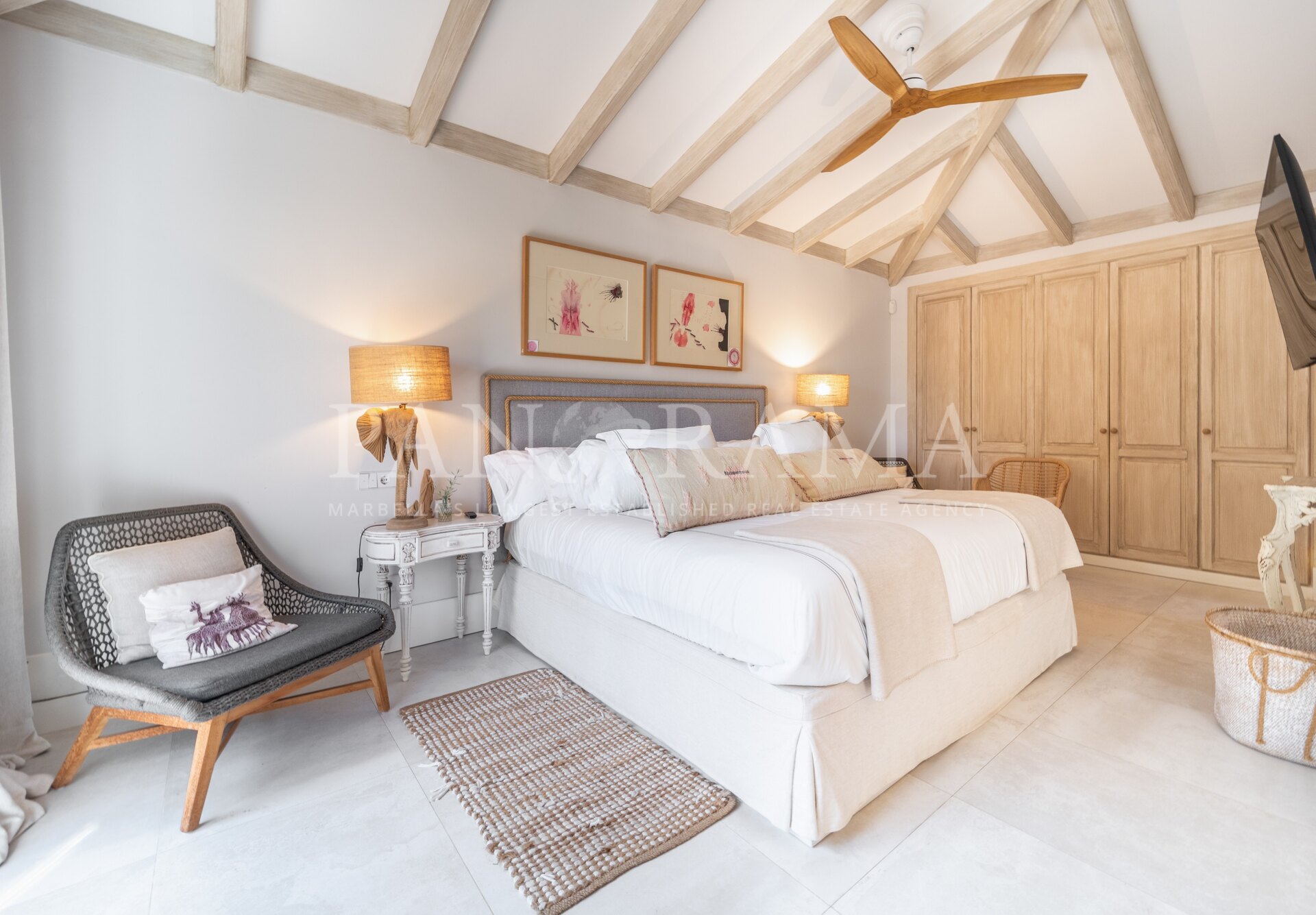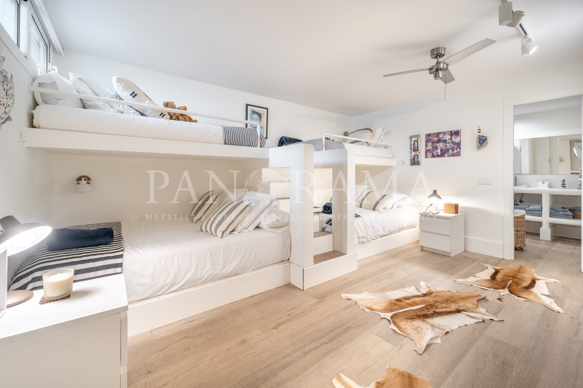 The master bedroom, with an en-suite bathroom, also has direct access to a large terrace with panoramic views of the pool and garden. In addition, there are two more en-suite bedrooms, ensuring optimal privacy and comfort for all residents. Both enjoy plenty of natural light.