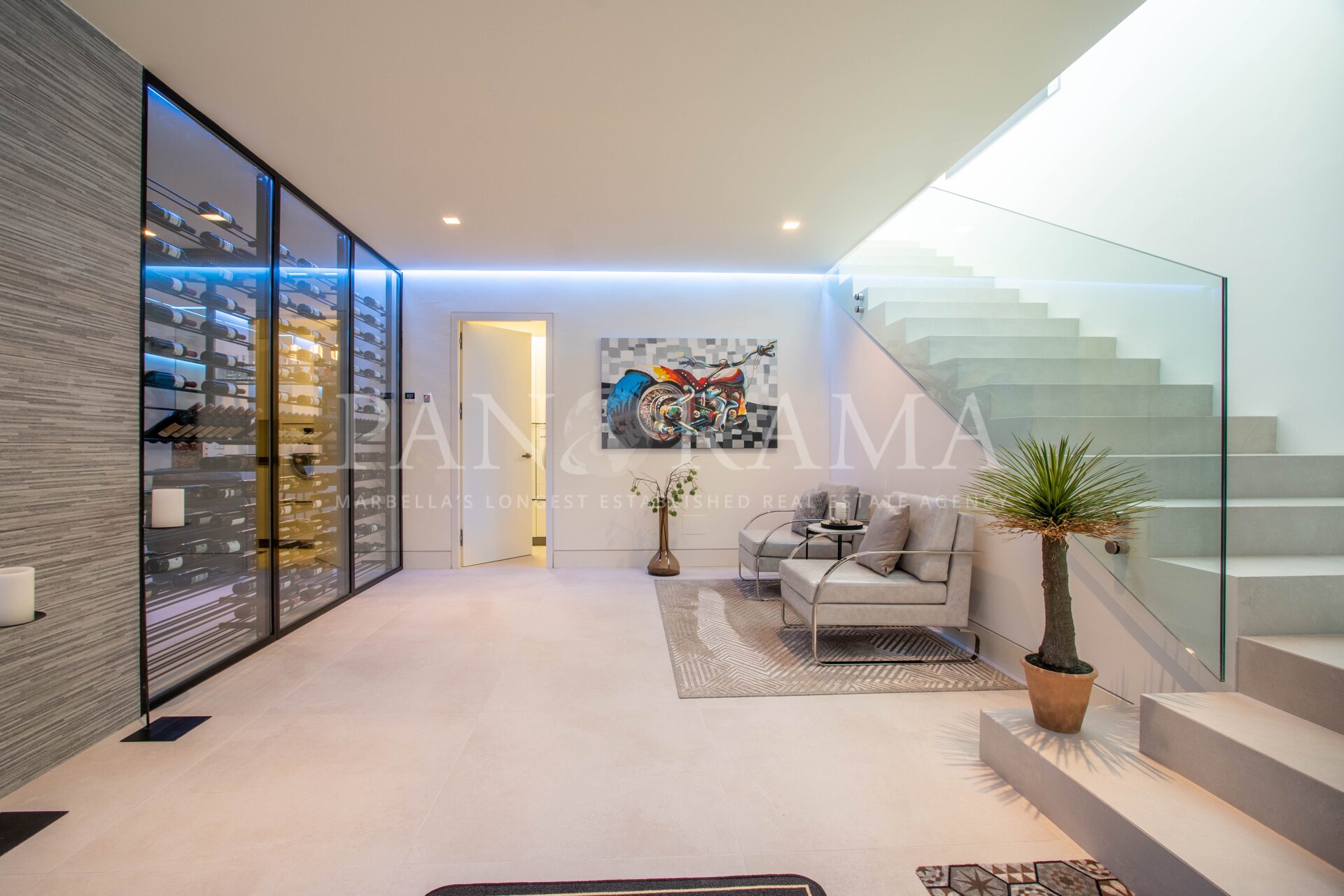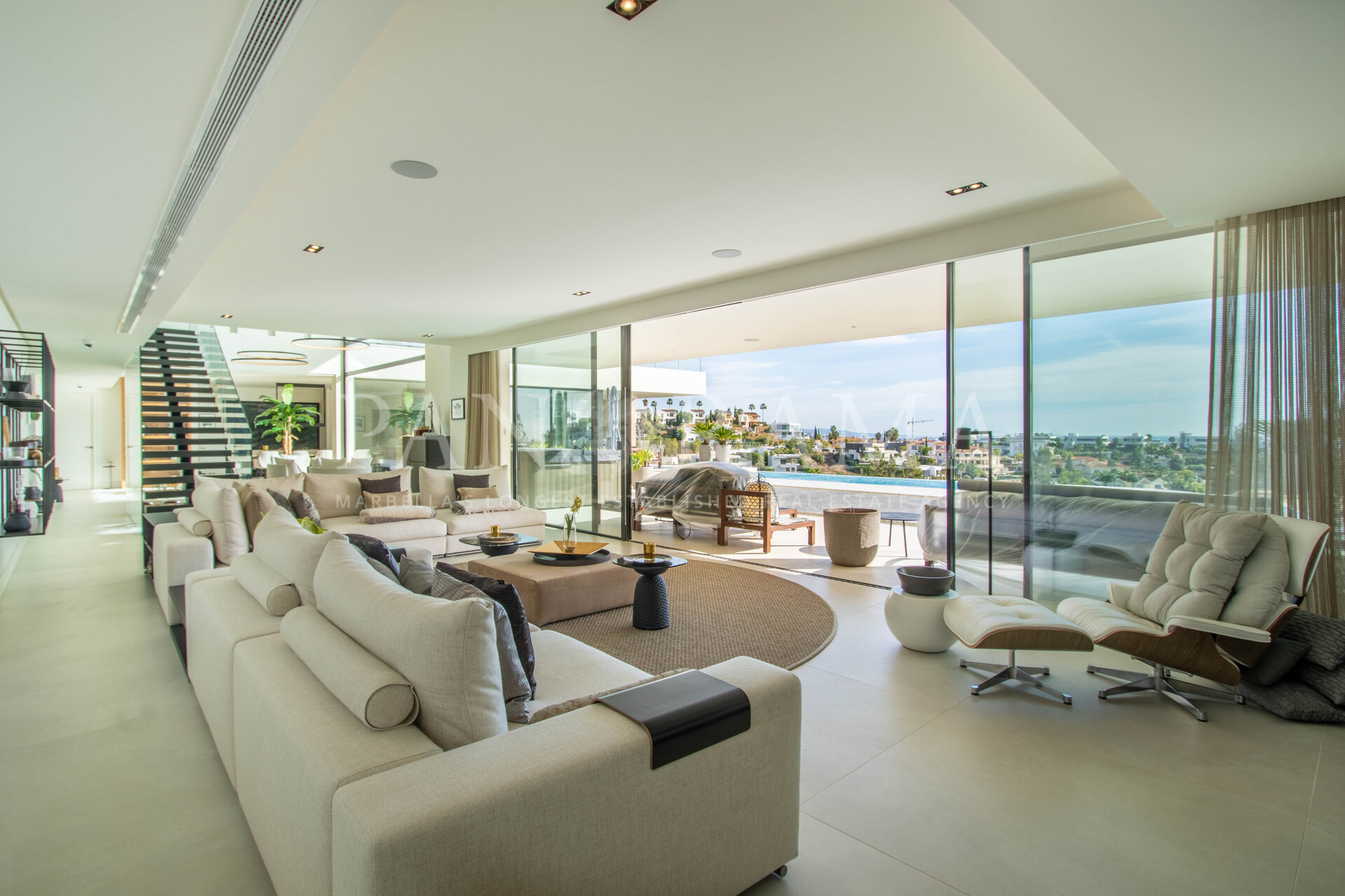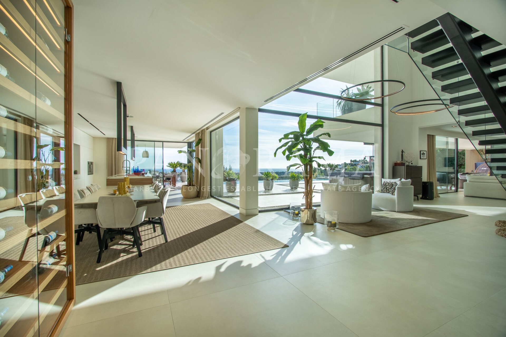 De villa is verdeeld over drie verdiepingen en verbonden door een stijlvolle lift en zwevende trap. Bij binnenkomst wordt u verwelkomd door een ruime entreehal met dubbele hoogte, die de toon zet voor de rest van het huis. De grote schuiframen verdwijnen in de muren, waardoor binnen- en buitenruimtes naadloos in elkaar overlopen. Vanuit vrijwel elke hoek van de villa geniet u van het adembenemende uitzicht op de Middellandse Zee en het omliggende landschap.