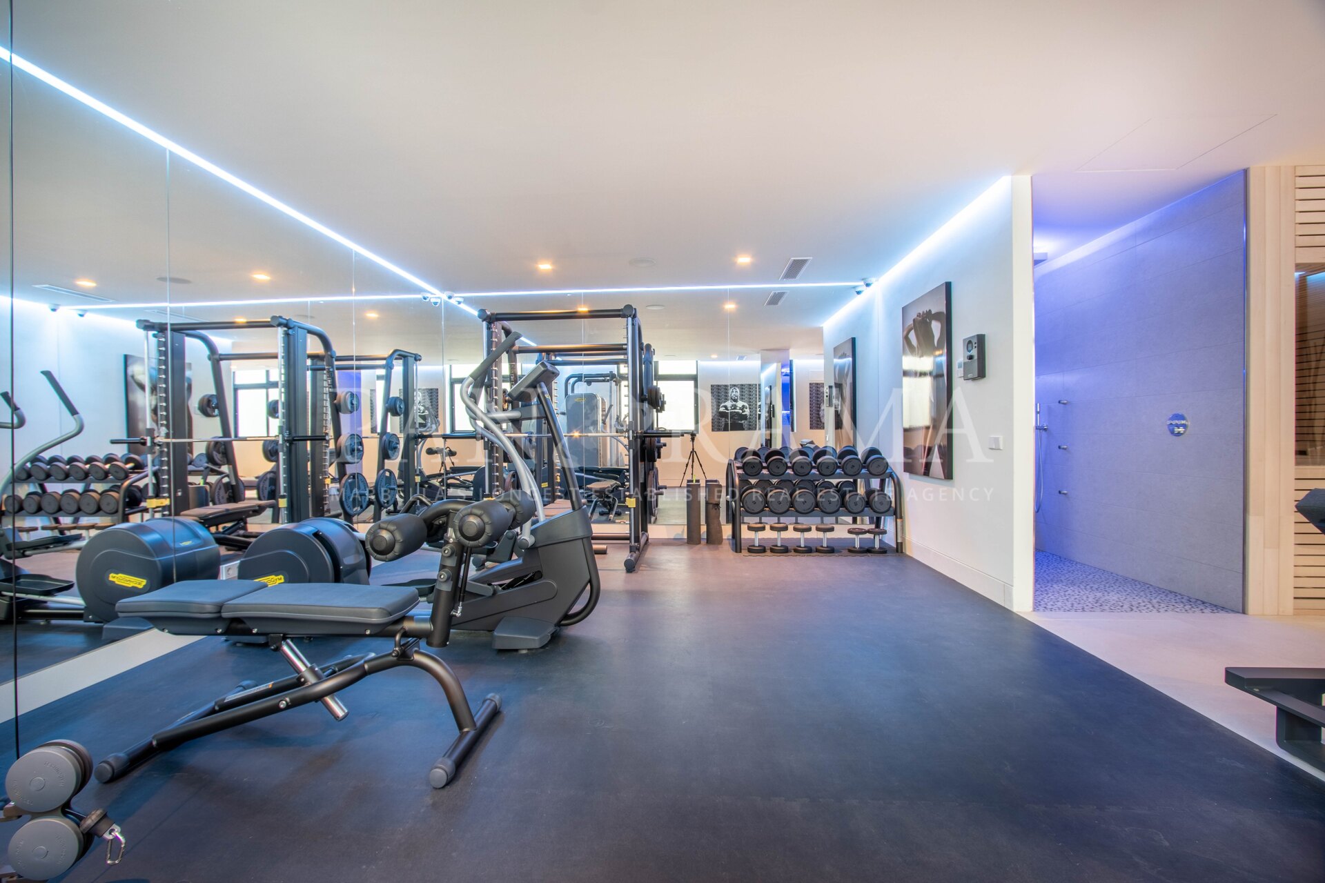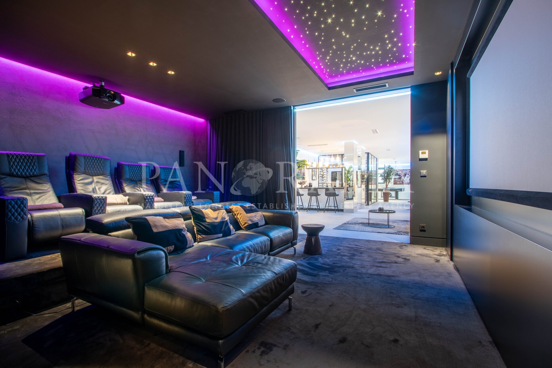 Beneden onderscheidt de villa zich met een spectaculaire kelder, ontworpen voor ontspanning en vermaak. Deze omvat een bar, lounge, speelkamer, inloop wijnkelder, fitnessruimte, volledige spa, wasruimte en zelfs een professionele bioscoopzaal—ideaal voor filmavonden met familie en vrienden.