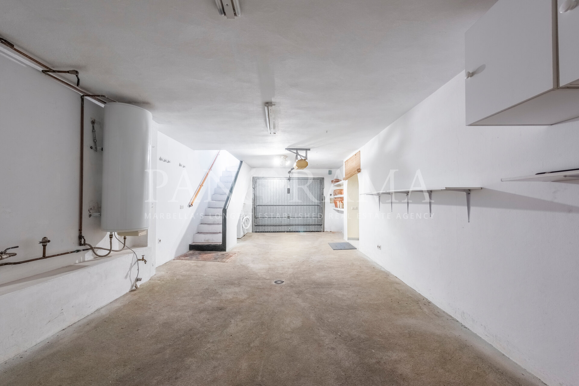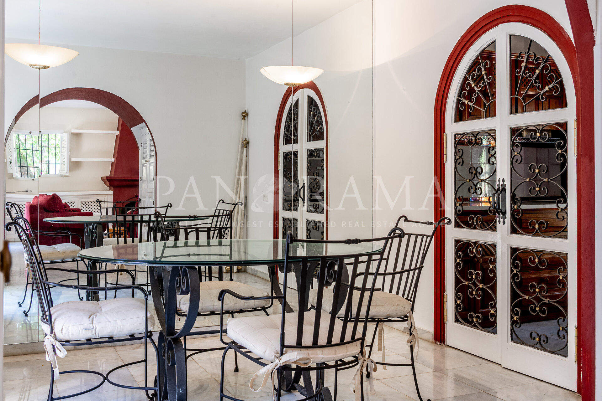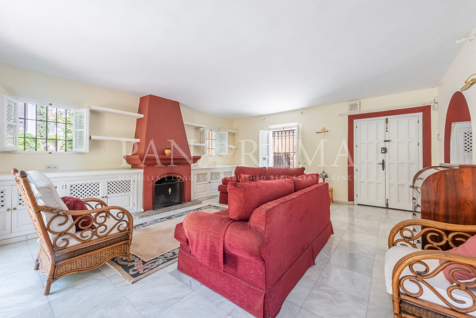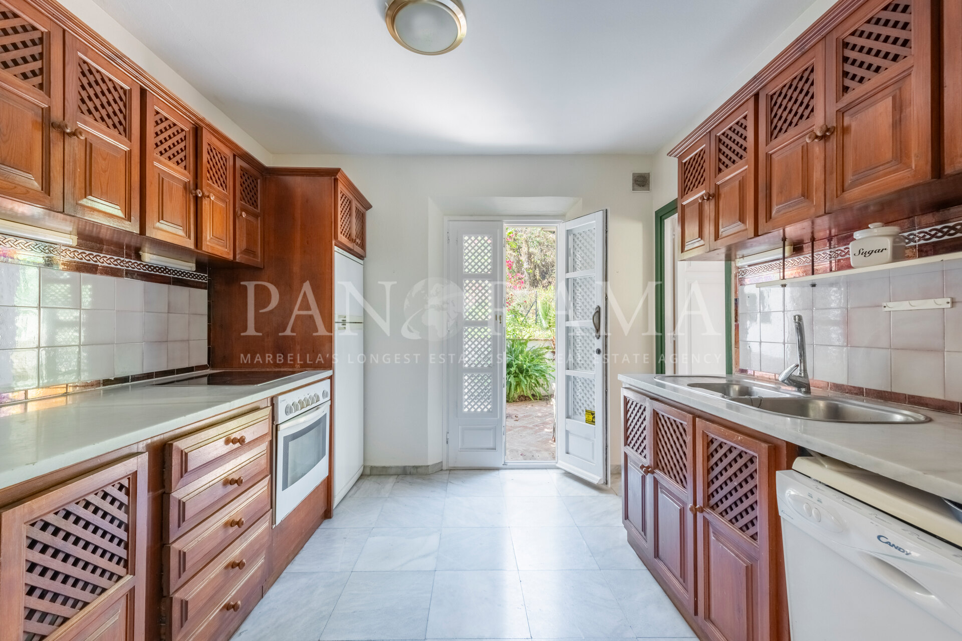 Hoewel het pand in originele staat verkeert en enige modernisering nodig heeft, biedt het een uitstekende kans voor degenen die hun droomhuis willen aanpassen in een van de meest gewilde gebieden van Marbella. Bij binnenkomst in het herenhuis wordt u verwelkomd door een lichte en gastvrije woonkamer met een gezellige open haard, perfect voor koelere avonden. De woonruimte vloeit naadloos over in een rustieke keuken die de traditionele Andalusische charme van het complex aanvult. Aangrenzend aan de keuken is een aparte eetkamer, die de ideale setting biedt voor familiemaaltijden en het ontvangen van gasten. Vanuit de woonkamer is er directe toegang tot een prachtig terras met uitzicht op de gemeenschappelijke gronden en volgroeide bomen, wat een rustige buitenruimte biedt voor ontspanning en met uitzicht op de berg La Concha.