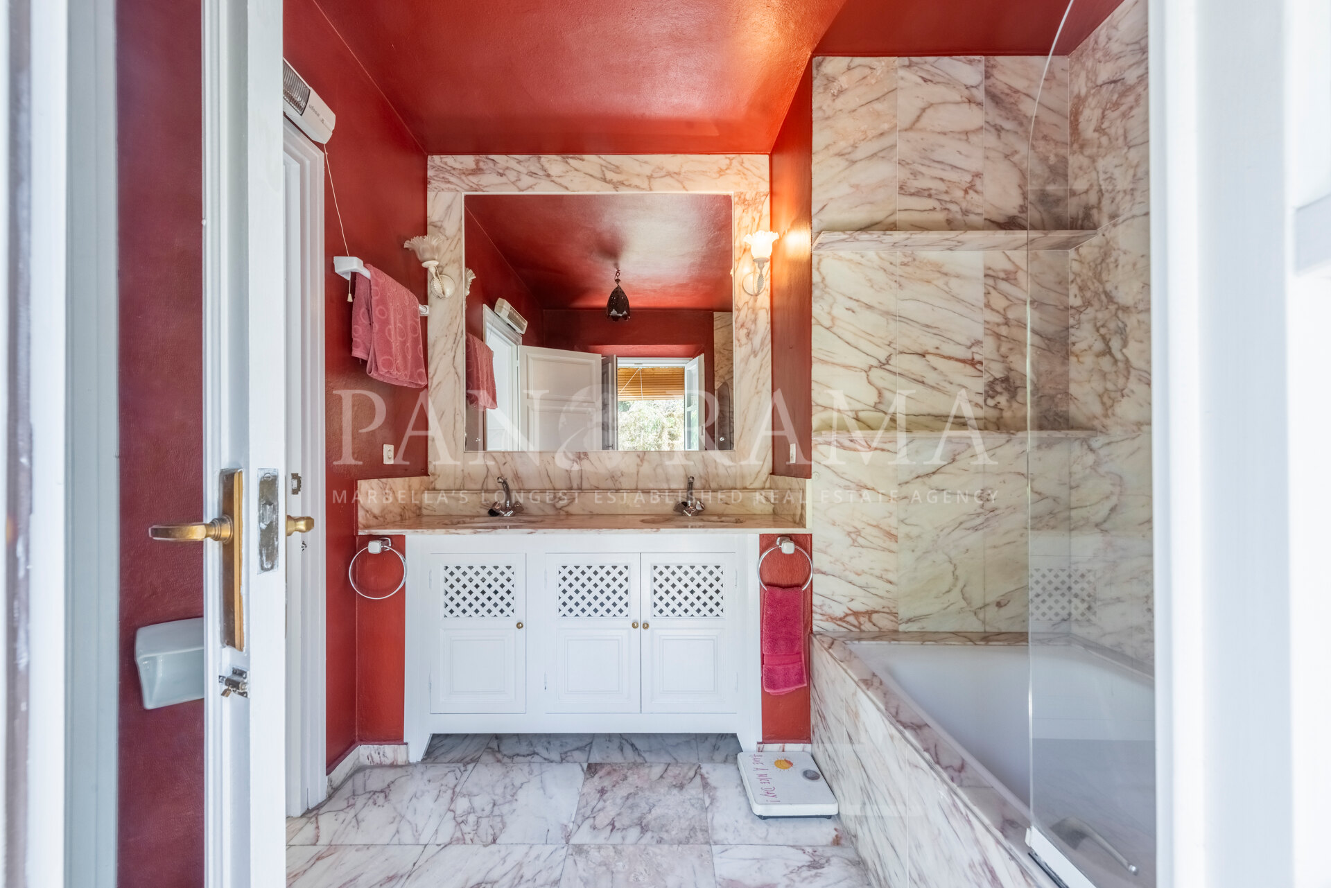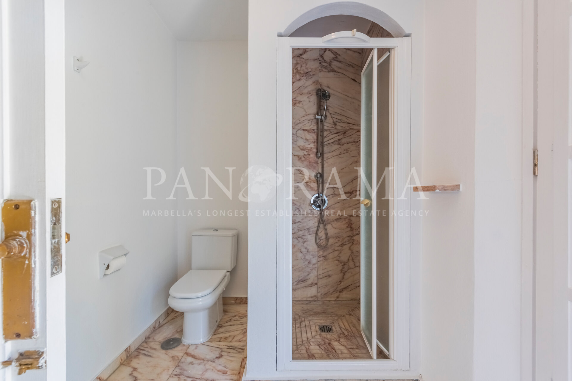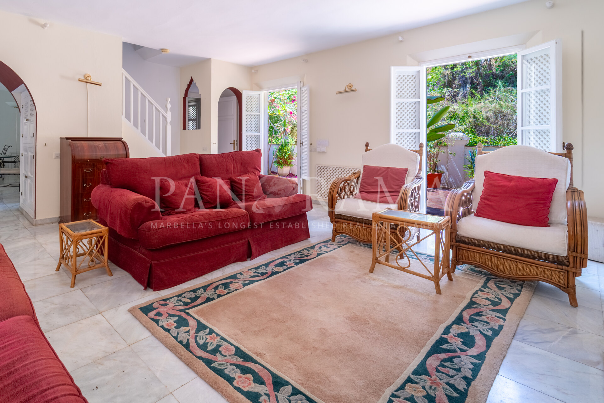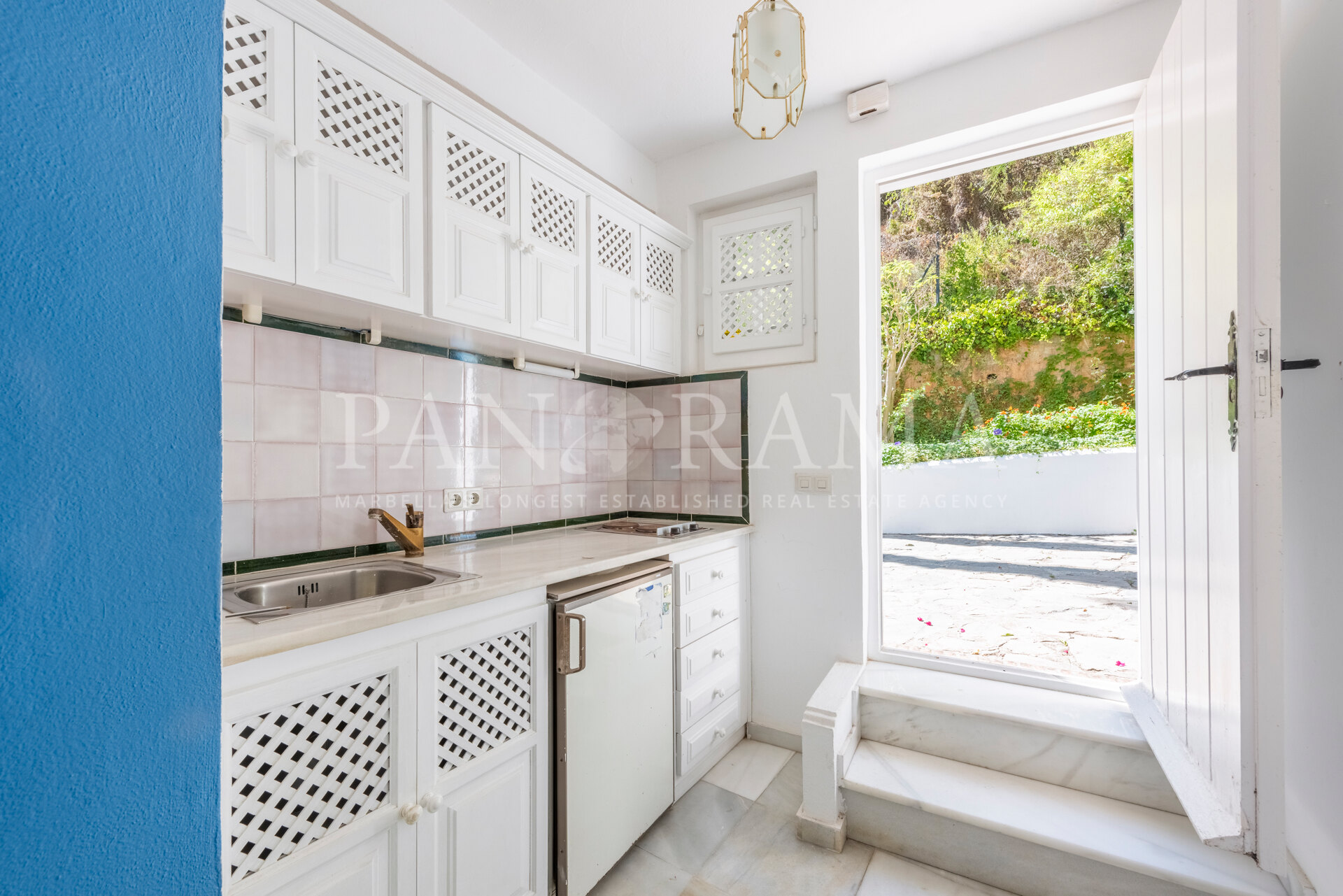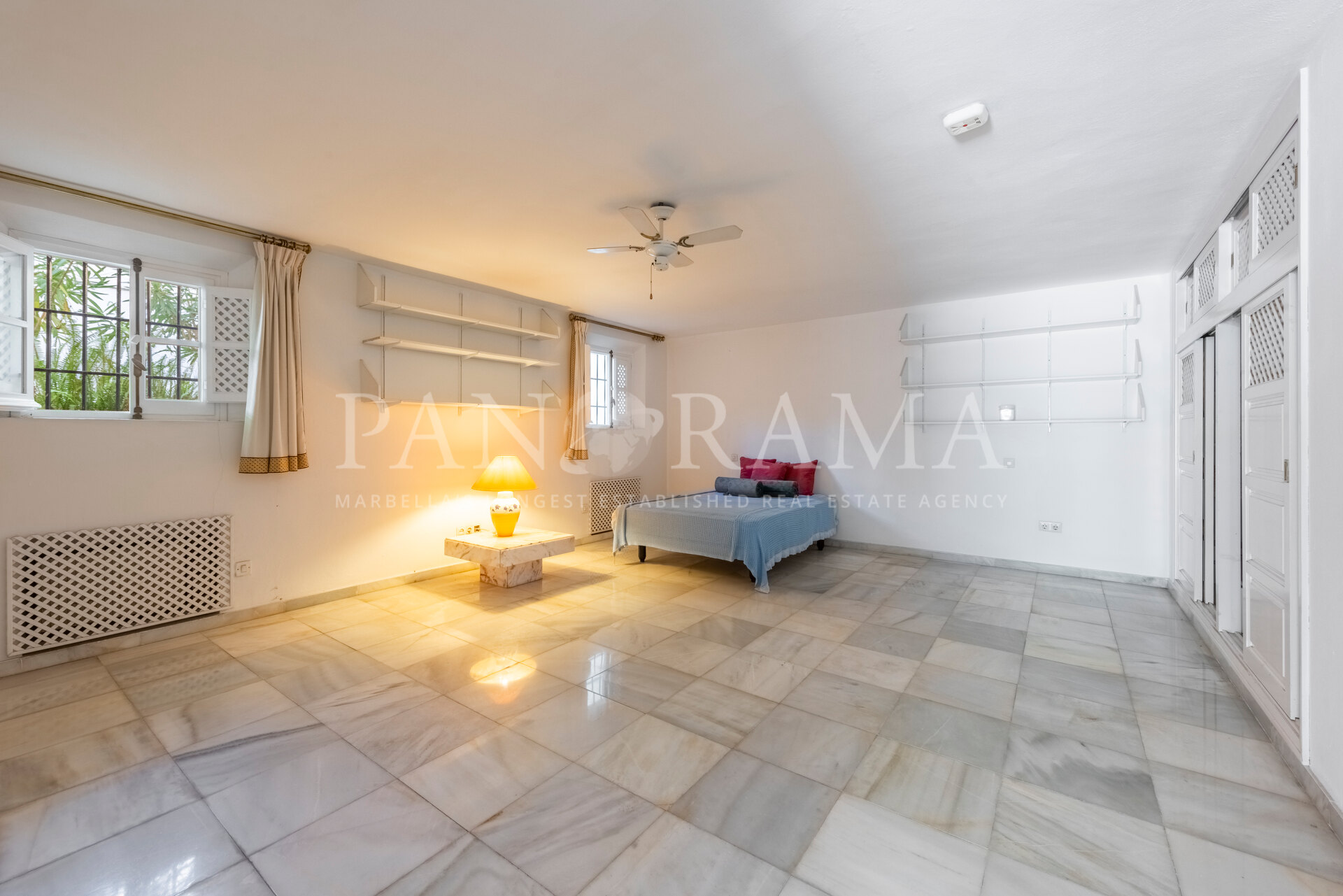 Hoewel het pand in originele staat verkeert en enige modernisering nodig heeft, biedt het een uitstekende kans voor degenen die hun droomhuis willen aanpassen in een van de meest gewilde gebieden van Marbella. Bij binnenkomst in het herenhuis wordt u verwelkomd door een lichte en gastvrije woonkamer met een gezellige open haard, perfect voor koelere avonden. De woonruimte vloeit naadloos over in een rustieke keuken die de traditionele Andalusische charme van het complex aanvult. Aangrenzend aan de keuken is een aparte eetkamer, die de ideale setting biedt voor familiemaaltijden en het ontvangen van gasten. Vanuit de woonkamer is er directe toegang tot een prachtig terras met uitzicht op de gemeenschappelijke gronden en volgroeide bomen, wat een rustige buitenruimte biedt voor ontspanning en met uitzicht op de berg La Concha.
