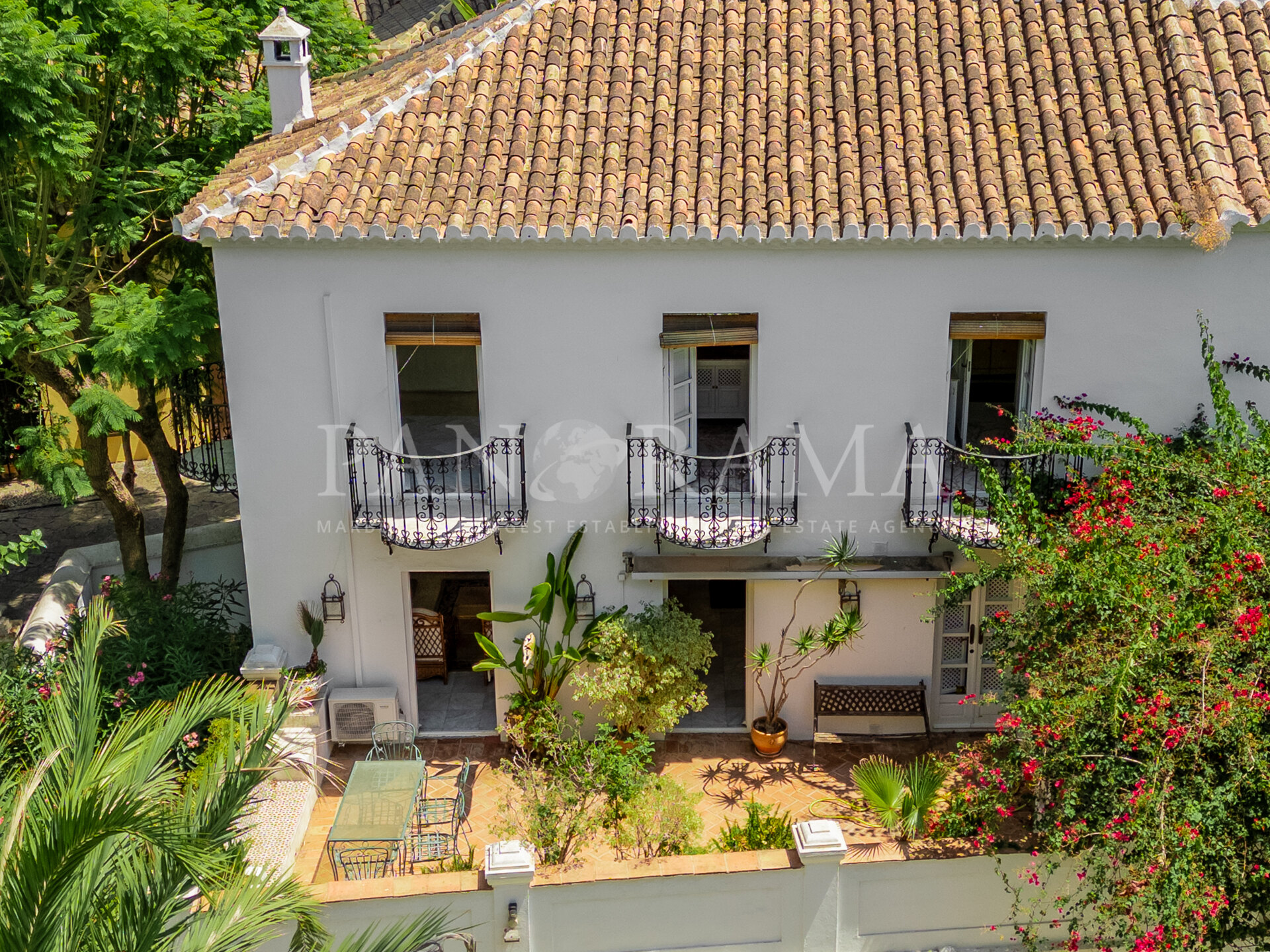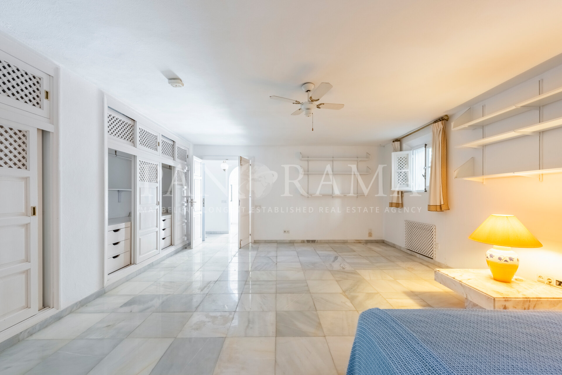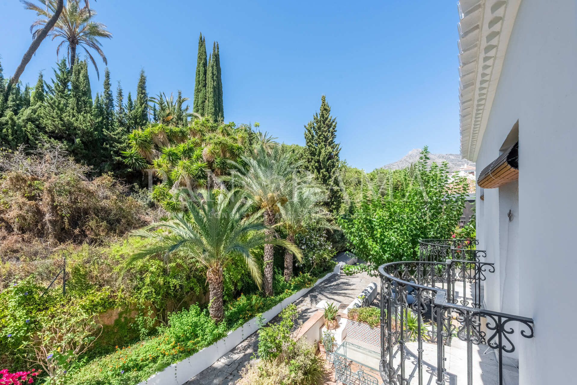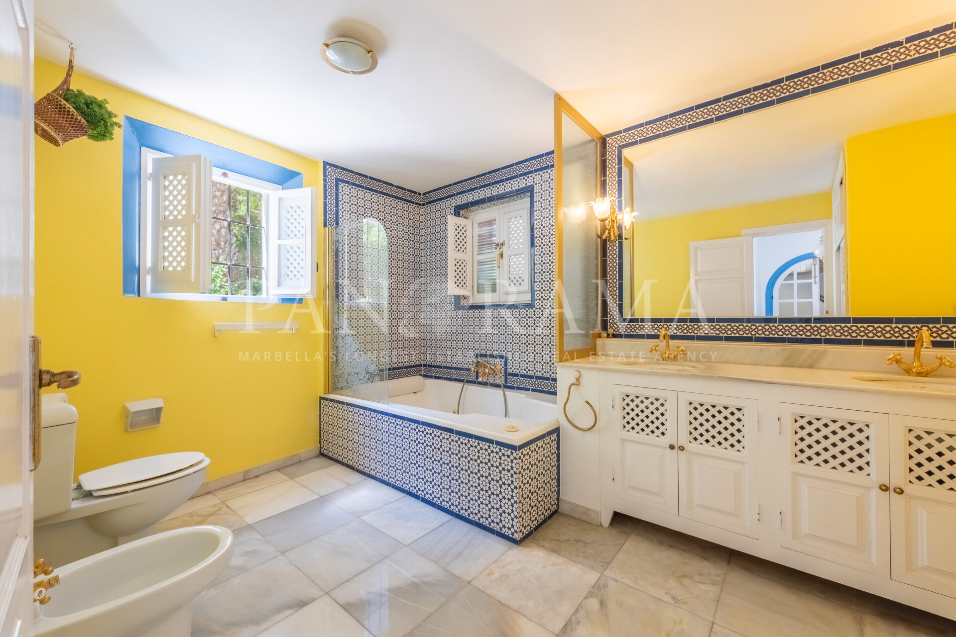 Hoewel het pand in originele staat verkeert en enige modernisering nodig heeft, biedt het een uitstekende kans voor degenen die hun droomhuis willen aanpassen in een van de meest gewilde gebieden van Marbella. Bij binnenkomst in het herenhuis wordt u verwelkomd door een lichte en gastvrije woonkamer met een gezellige open haard, perfect voor koelere avonden. De woonruimte vloeit naadloos over in een rustieke keuken die de traditionele Andalusische charme van het complex aanvult. Aangrenzend aan de keuken is een aparte eetkamer, die de ideale setting biedt voor familiemaaltijden en het ontvangen van gasten. Vanuit de woonkamer is er directe toegang tot een prachtig terras met uitzicht op de gemeenschappelijke gronden en volgroeide bomen, wat een rustige buitenruimte biedt voor ontspanning en met uitzicht op de berg La Concha.