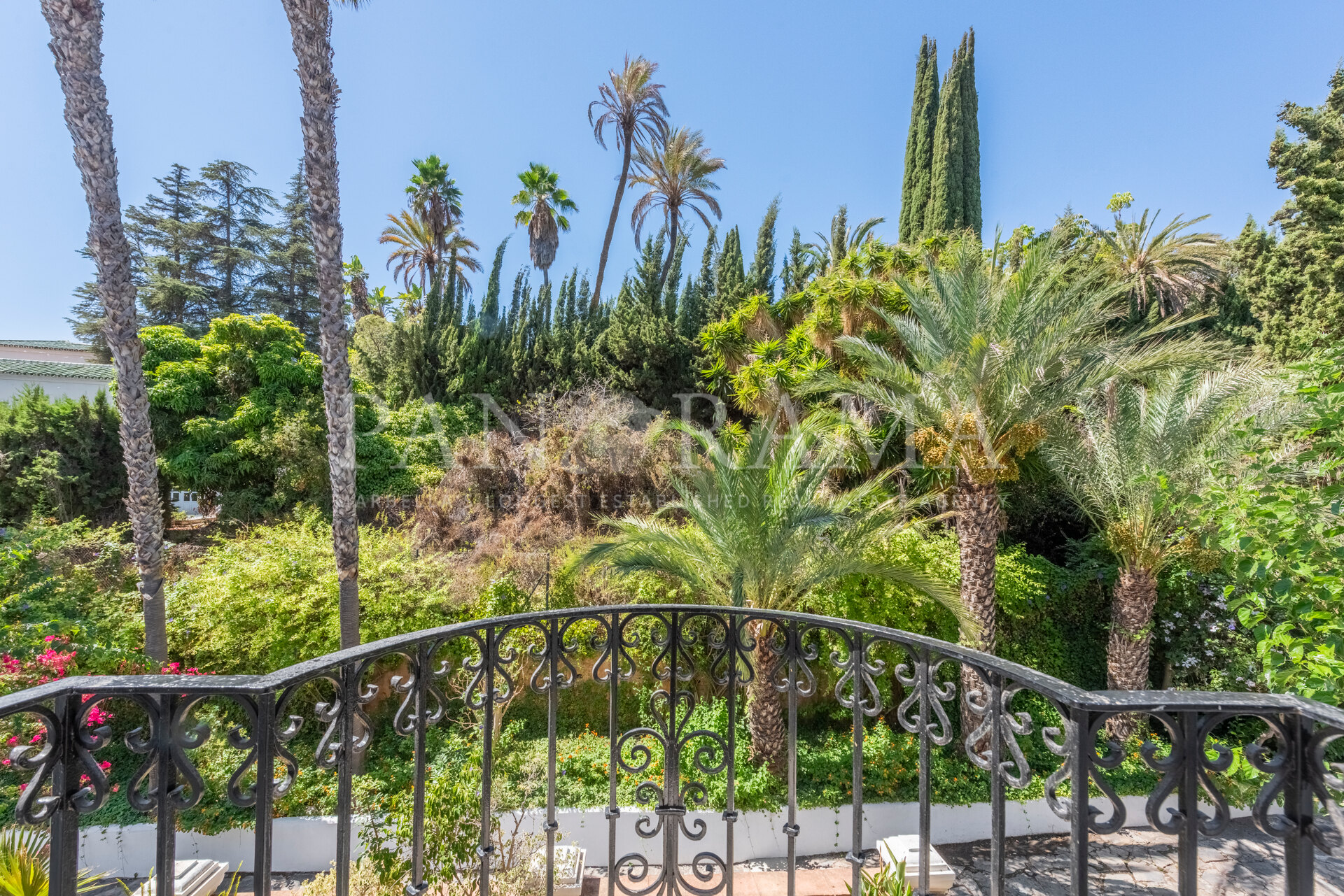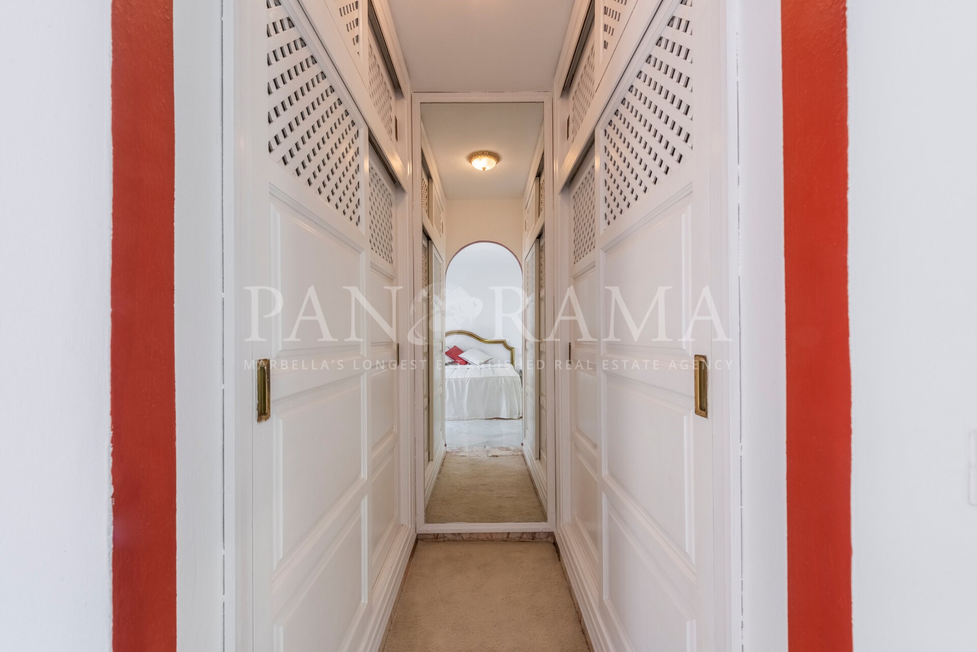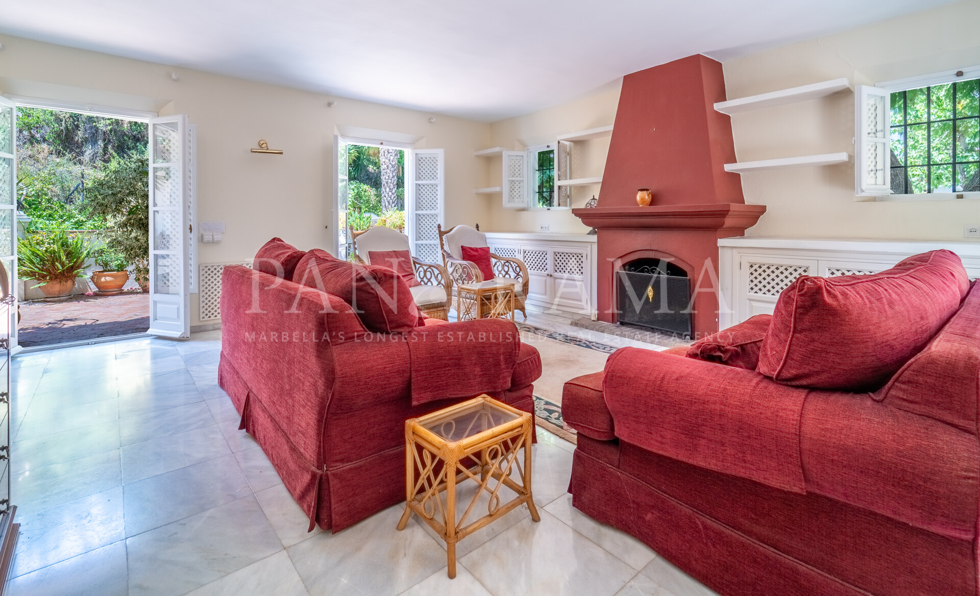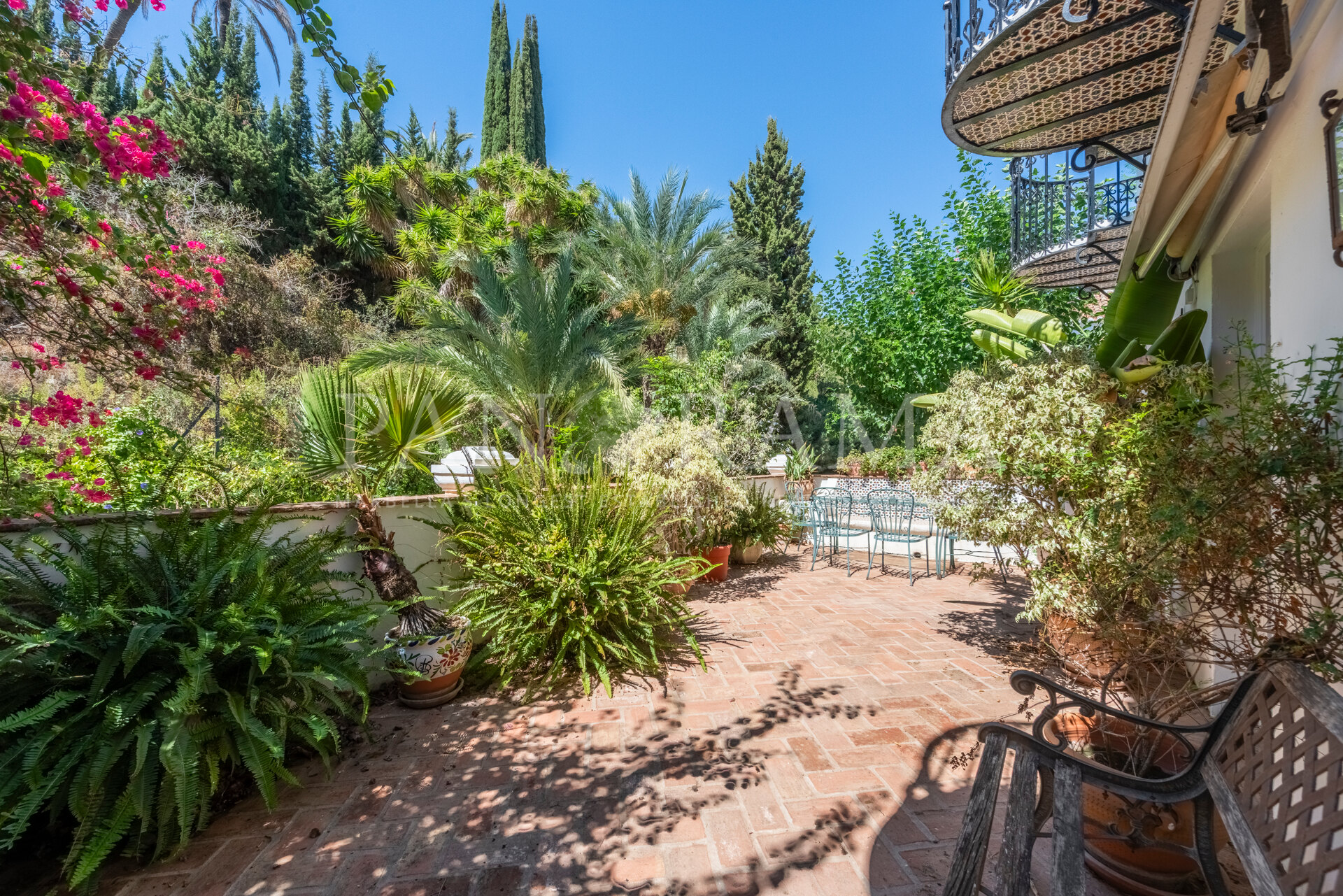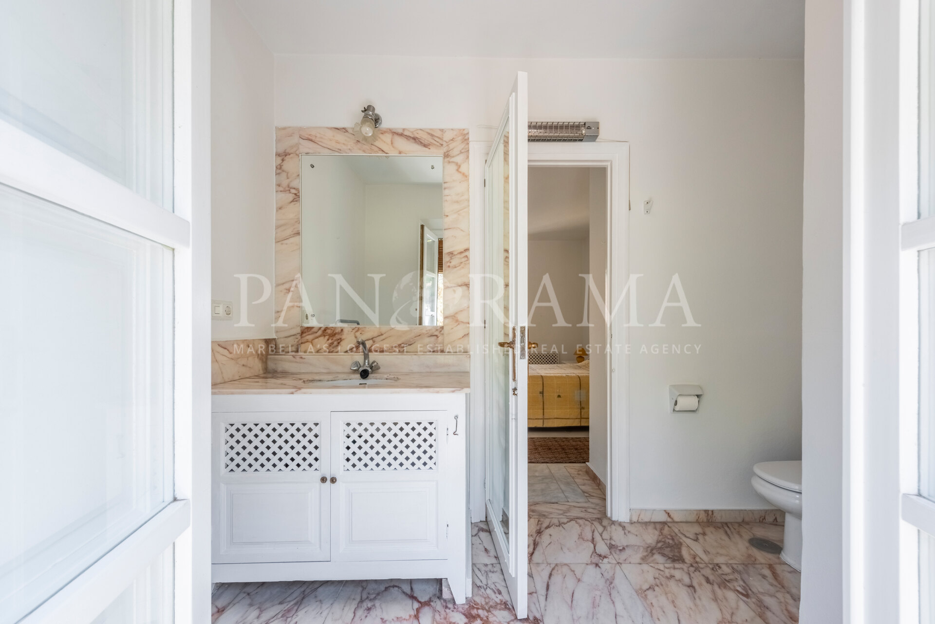 Hoewel het pand in originele staat verkeert en enige modernisering nodig heeft, biedt het een uitstekende kans voor degenen die hun droomhuis willen aanpassen in een van de meest gewilde gebieden van Marbella. Bij binnenkomst in het herenhuis wordt u verwelkomd door een lichte en gastvrije woonkamer met een gezellige open haard, perfect voor koelere avonden. De woonruimte vloeit naadloos over in een rustieke keuken die de traditionele Andalusische charme van het complex aanvult. Aangrenzend aan de keuken is een aparte eetkamer, die de ideale setting biedt voor familiemaaltijden en het ontvangen van gasten. Vanuit de woonkamer is er directe toegang tot een prachtig terras met uitzicht op de gemeenschappelijke gronden en volgroeide bomen, wat een rustige buitenruimte biedt voor ontspanning en met uitzicht op de berg La Concha.