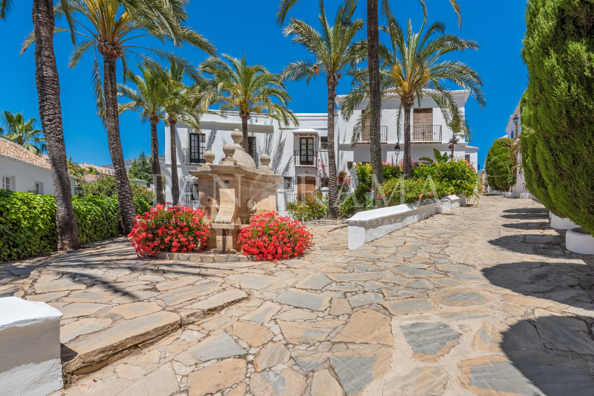 Gelegen in het prestigieuze woongebied van Las Lomas del Marbella Club Pueblo aan de Golden Mile, vangt dit charmante herenhuis de essentie van de traditionele Andalusische dorpstijl. Gelegen in een prachtig onderhouden complex, biedt het pand toegang tot een gemeenschappelijk zwembad omgeven door weelderige tuinen en een gastvrije sociale club, wat een perfecte omgeving biedt voor ontspanning en een gevoel van gemeenschap.