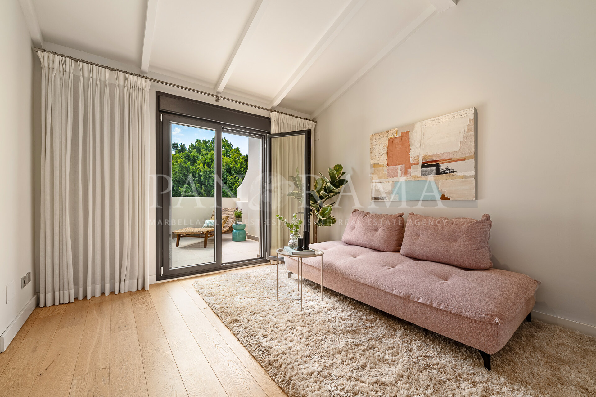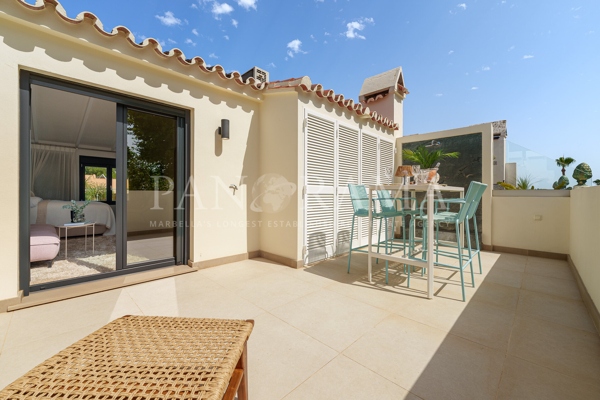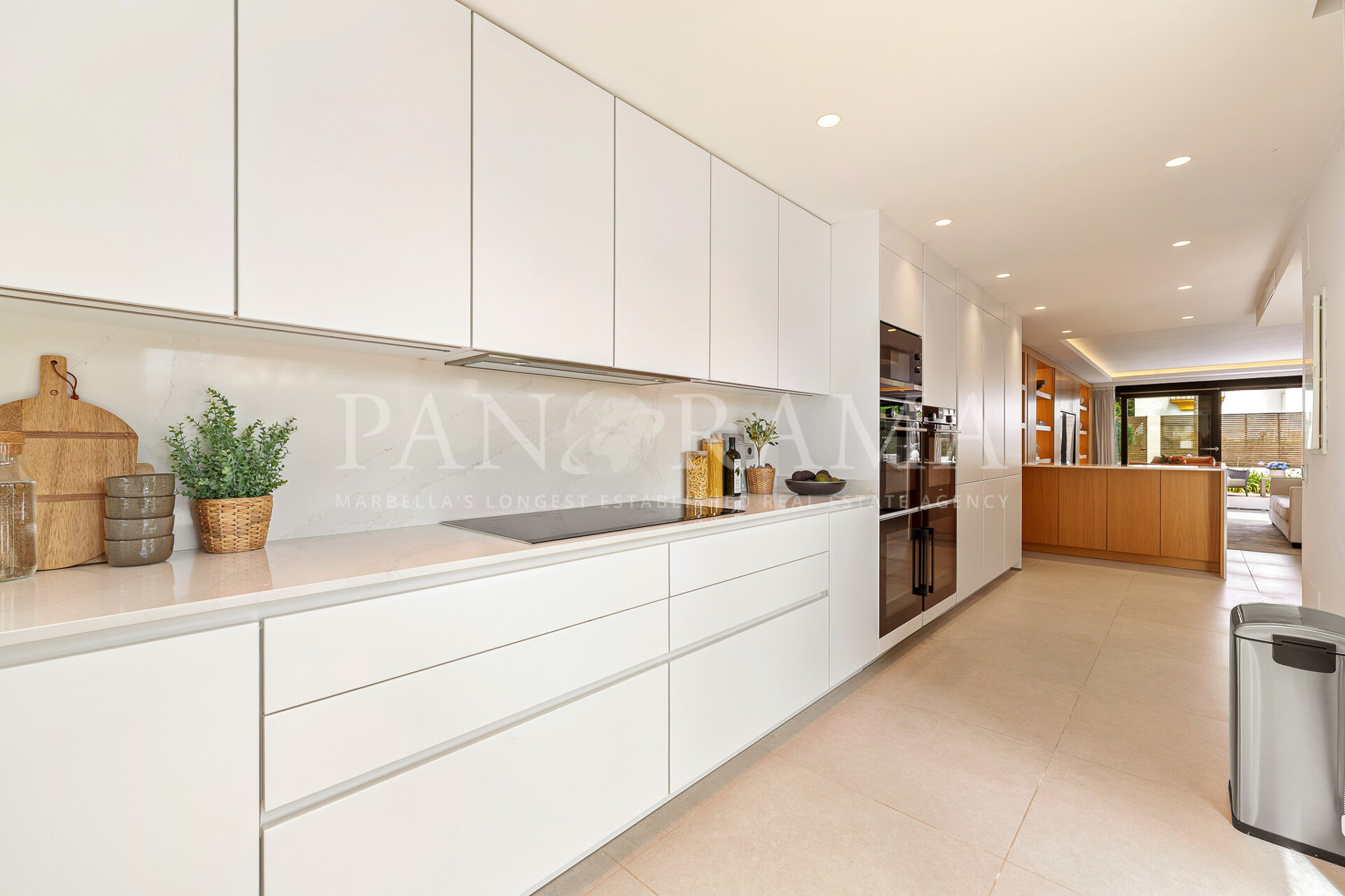 Dit stijlvolle herenhuis bevindt zich in een prestigieuze gemeenschap aan de Golden Mile van Marbella, op korte loopafstand van het beroemde Puente Romano Resort, de strandpromenade en het historische oude centrum van Marbella. De omgeving is rustig en groen, met de berg La Concha als schilderachtig decor, wat zowel rust als nabijheid tot belangrijke voorzieningen biedt.