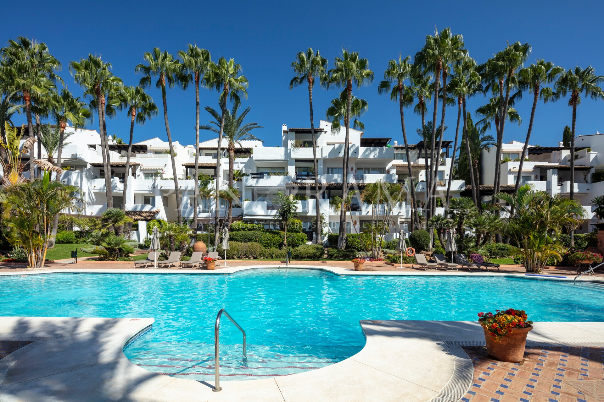 Dit indrukwekkende appartement op de begane grond is onlangs volledig gerenoveerd en bevindt zich in het prestigieuze Marina de Puente Romano-complex, grenzend aan het Beach Resort en Spa, in de gewilde Golden Mile van Marbella. Met een interieur van 118 m² en een terras van 32 m² biedt het voldoende ruimte voor ontspanning en entertainment in de buitenlucht.