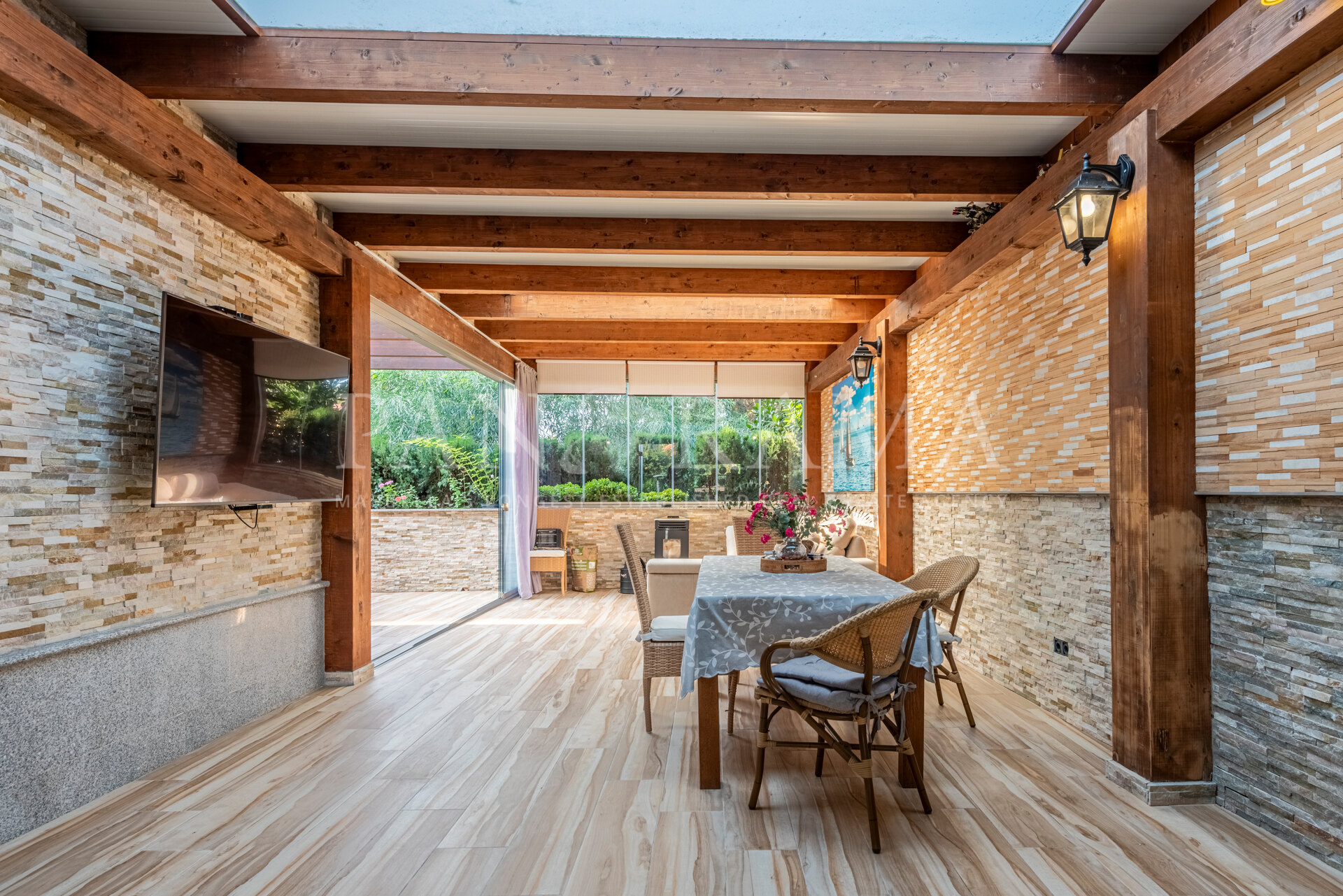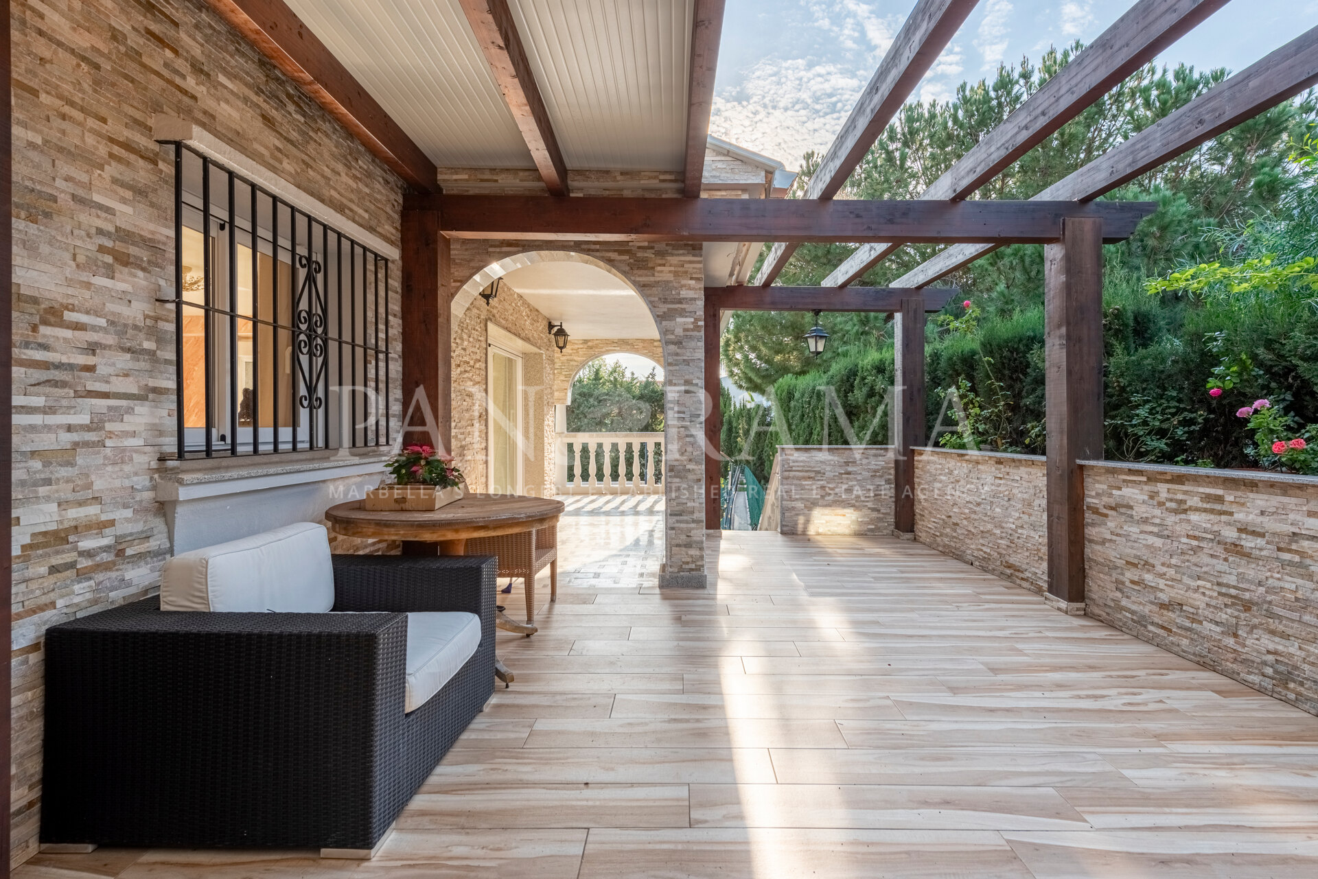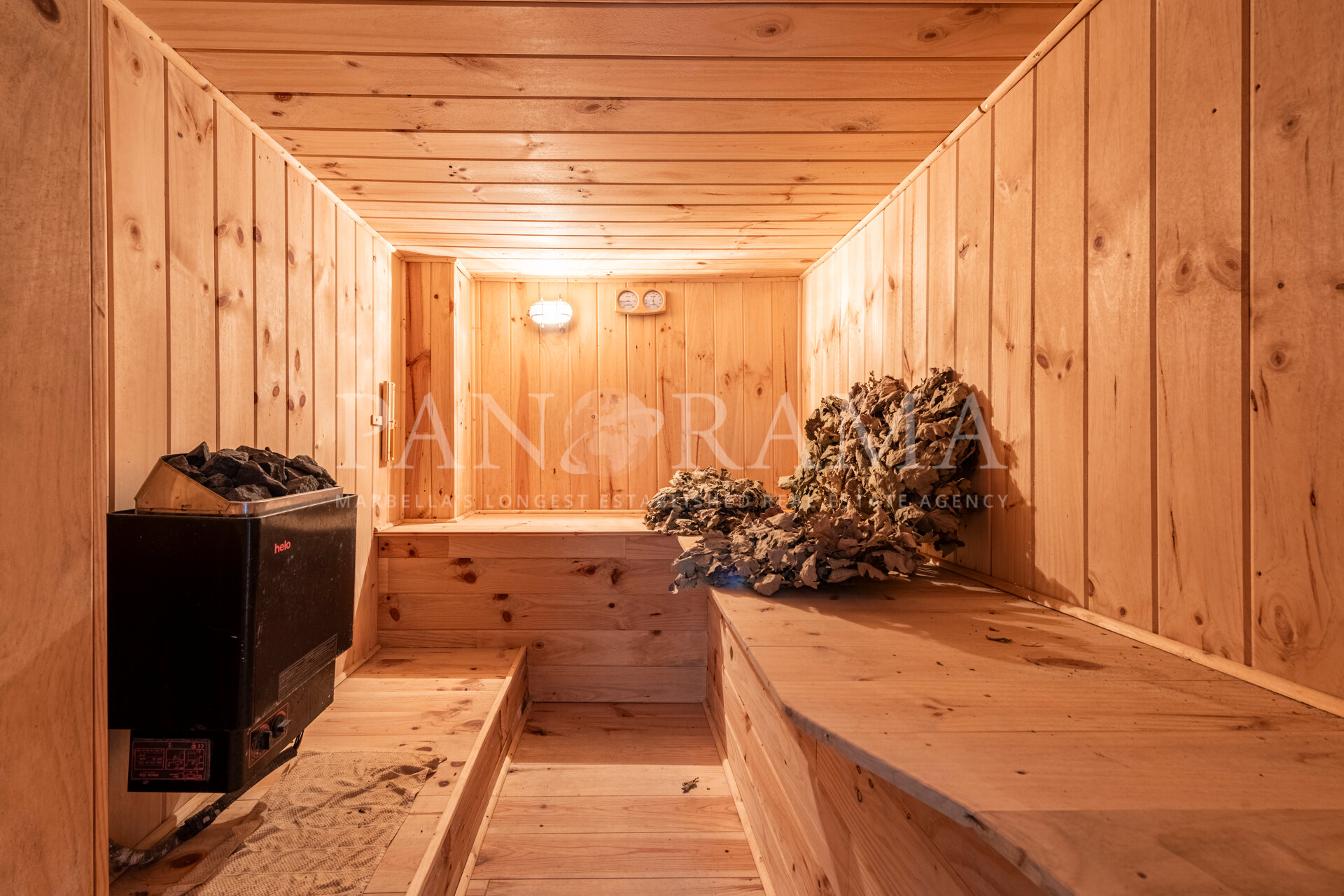 Een extra aantrekkingskracht buitenshuis is het zoutwaterzwembad, een luxe voorziening ontworpen voor zowel welzijn als recreatie. In tegenstelling tot traditionele zwembaden is het zoutwatersysteem zacht voor de huid en biedt het een verfrissende zwemervaring in harmonie met het milieu. In de buurt nodigt een aparte sauna u uit om te ontspannen na een drukke dag, waardoor u thuis een persoonlijke spa-ervaring heeft.