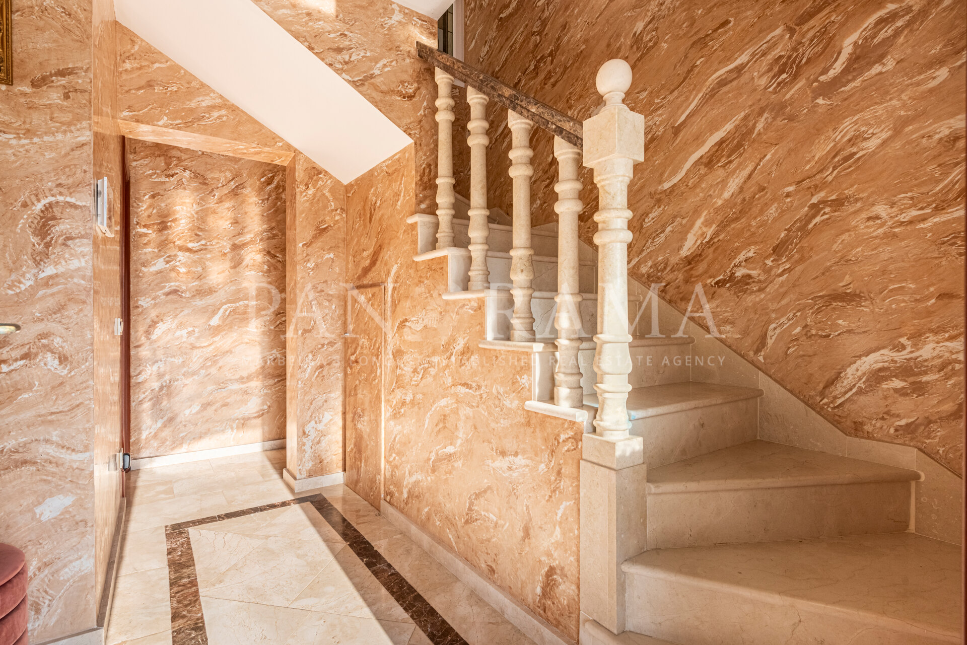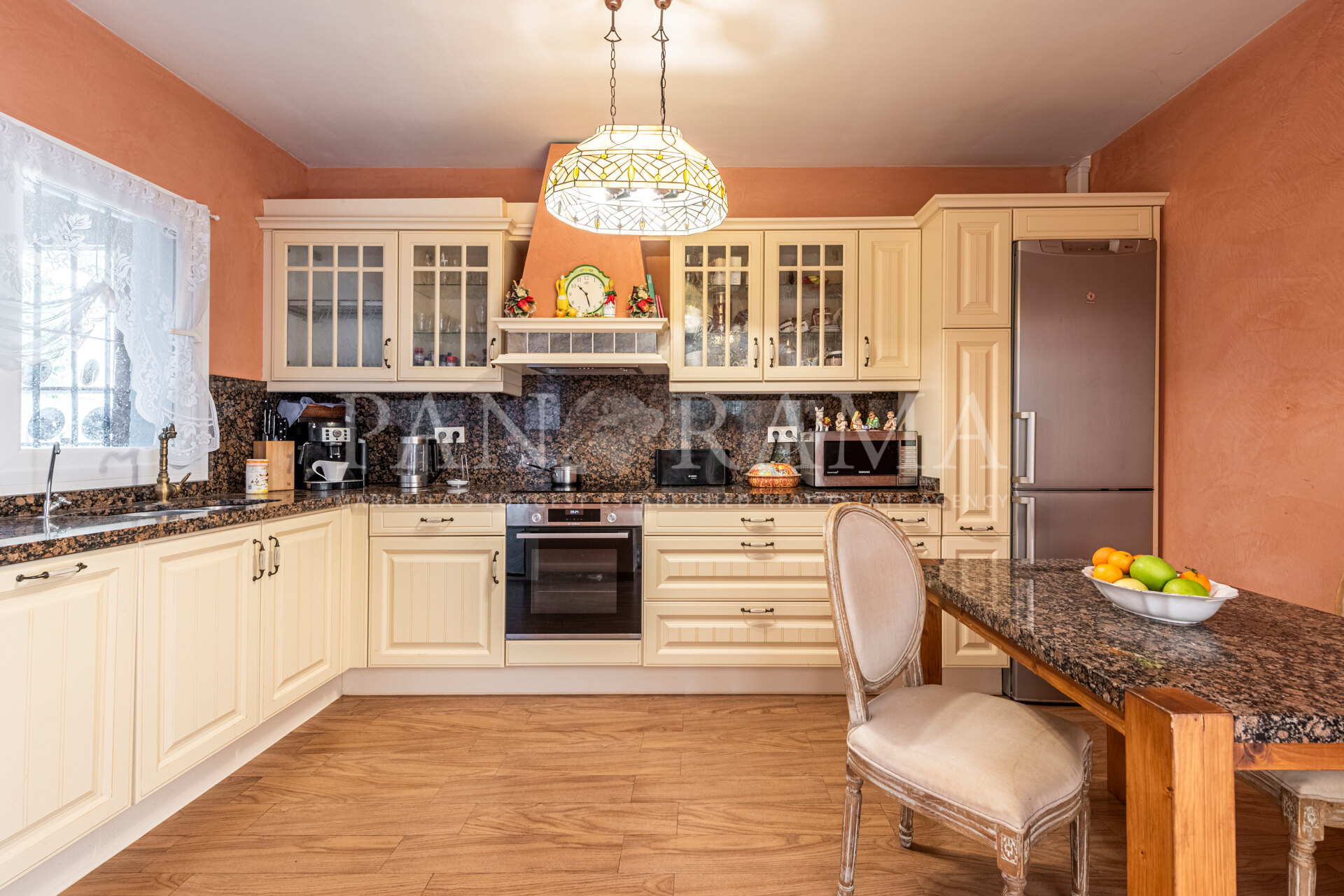 Bij binnenkomst in de villa wordt u verwelkomd door een doordacht ingedeelde plattegrond die het natuurlijke licht maximaliseert en een naadloze overgang tussen de leefruimtes bevordert. De aanwezigheid van twee keukens verhoogt de functionaliteit en biedt flexibiliteit voor het creëren van aparte kook- en eetruimtes of het tegemoetkomen aan de behoeften van gasten. Deze keukens zijn uitgerust met hoogwaardige apparatuur, waardoor het bereiden van maaltijden net zo plezierig is als het genieten ervan.