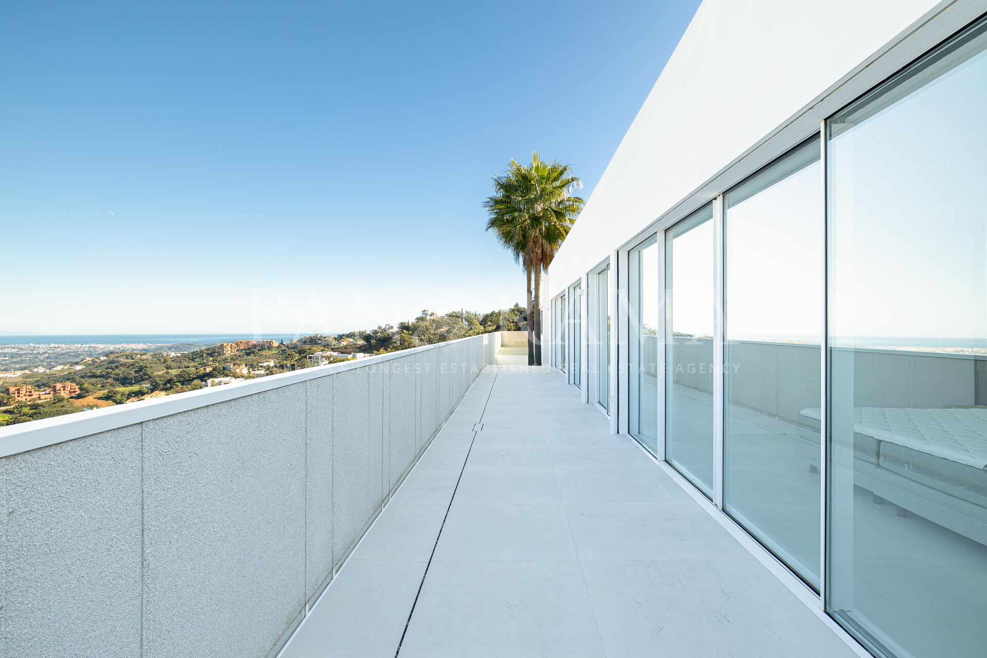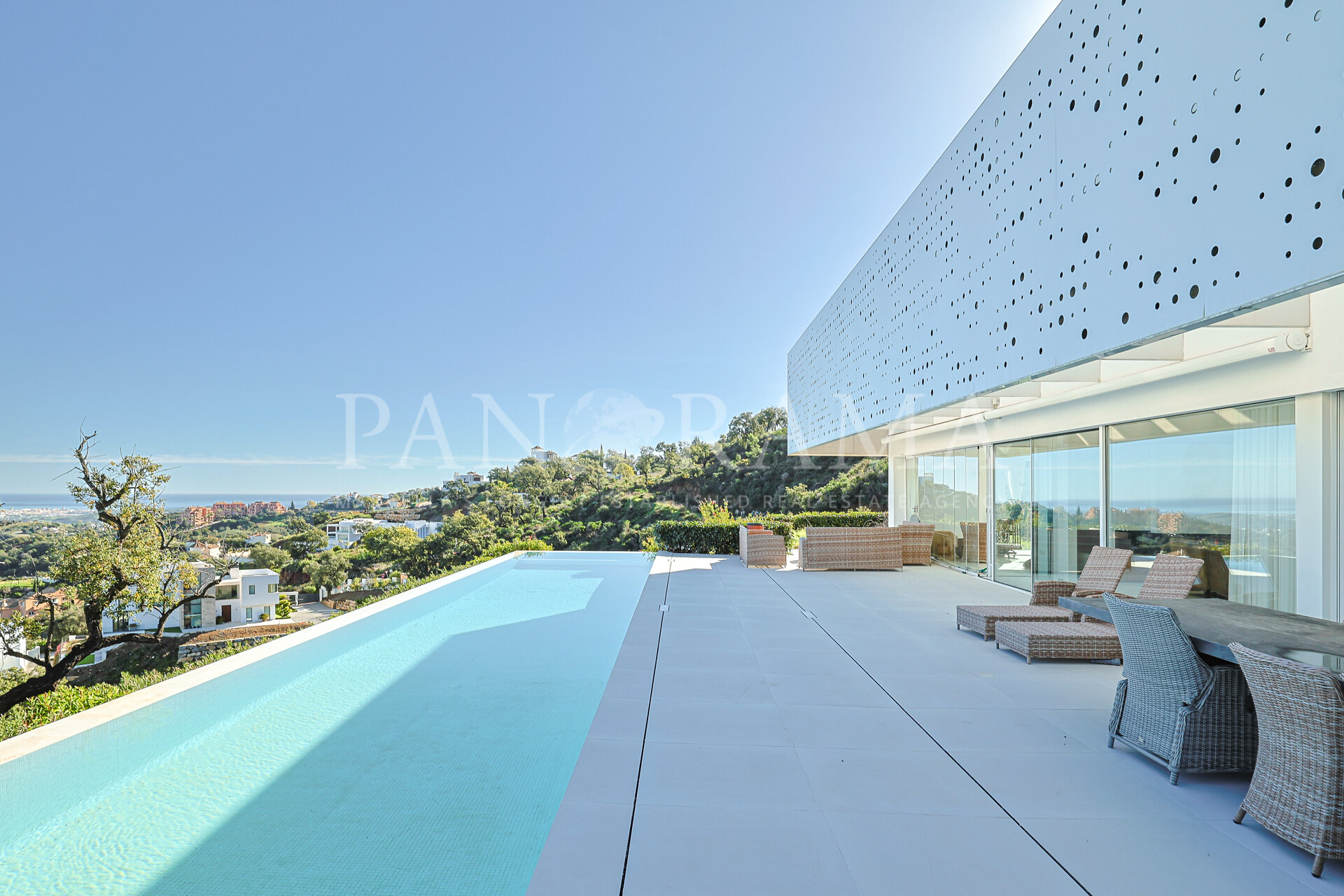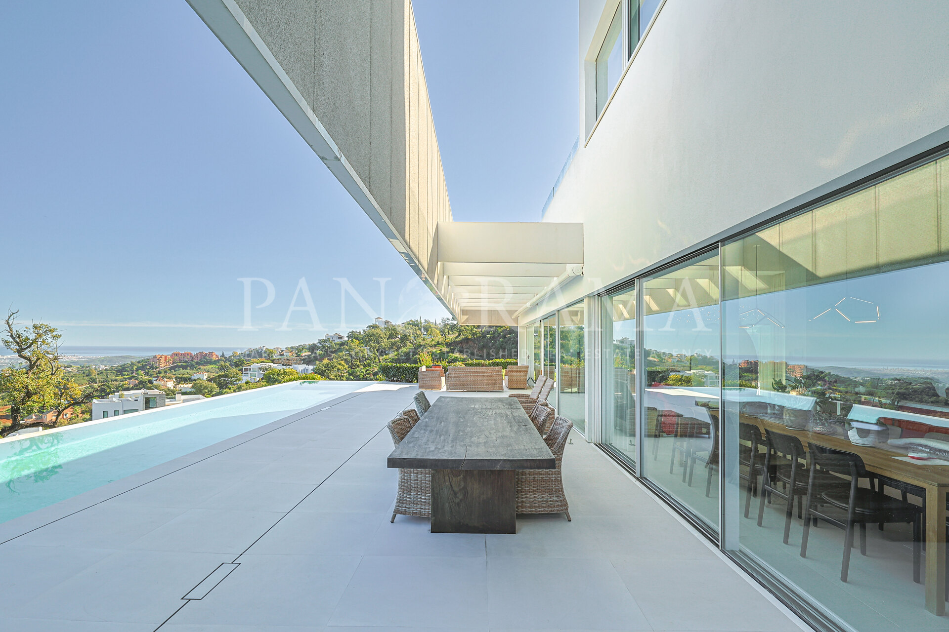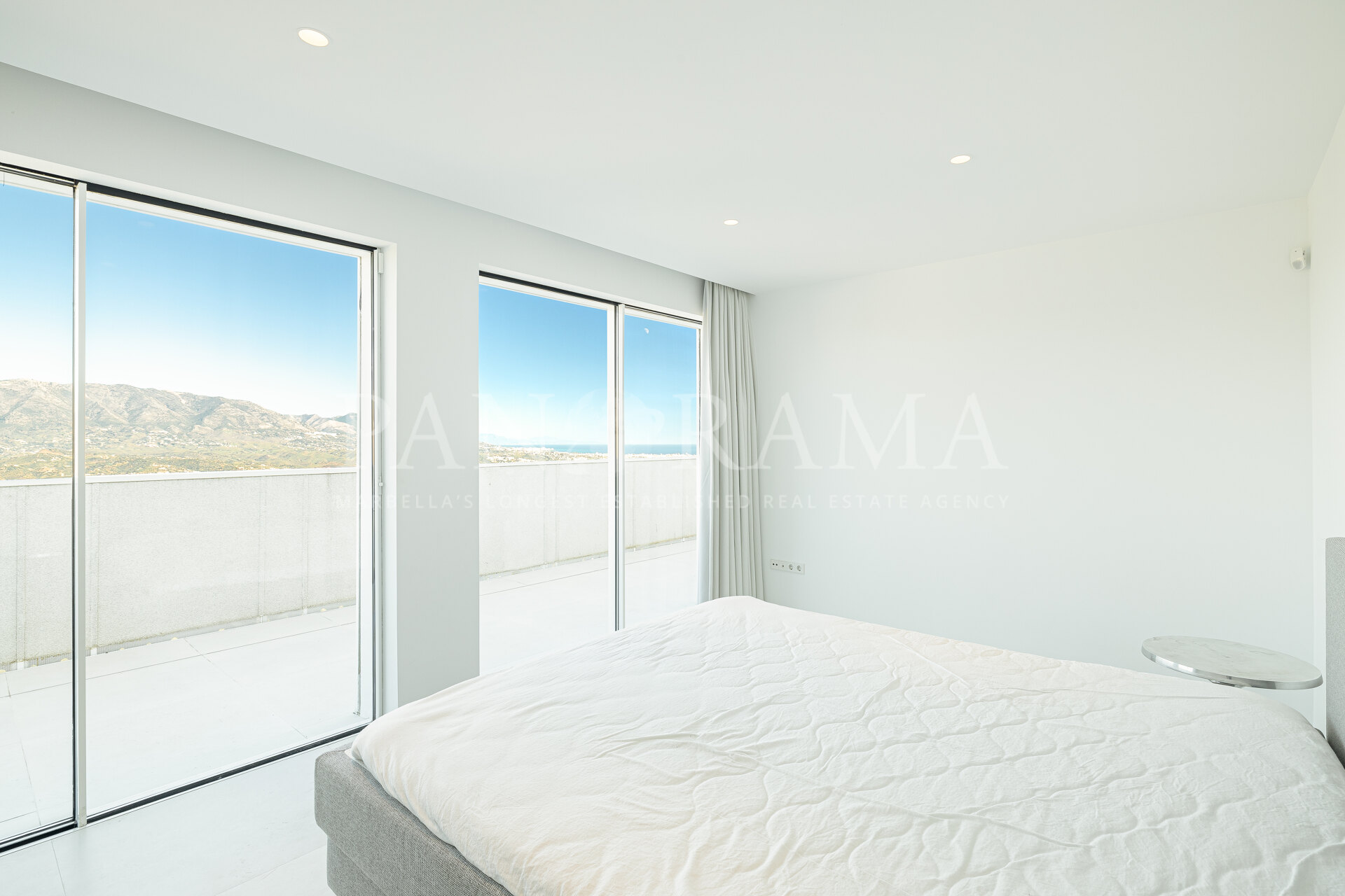 Gelegen in de rustige en schilderachtige enclave van La Mairena, Oost-Marbella, biedt deze prachtige moderne villa, gebouwd in 2017, een ongeëvenaarde mix van luxe, comfort en adembenemende natuurlijke schoonheid. Gelegen op een uitgestrekt perceel van 3.000 m² en met 739 m² aan bebouwde ruimte verdeeld over drie zorgvuldig ontworpen niveaus, is dit pand het toppunt van eigentijdse elegantie, perfect voor gezinsleven of het hele jaar door gasten ontvangen.