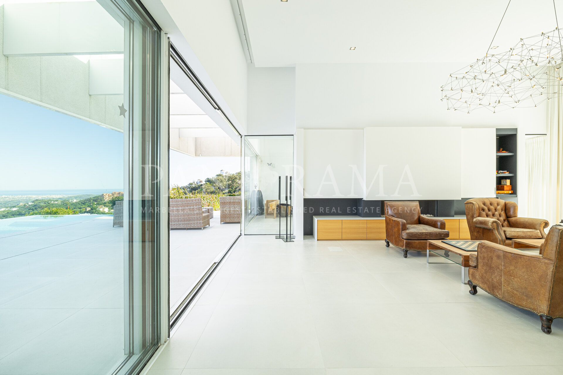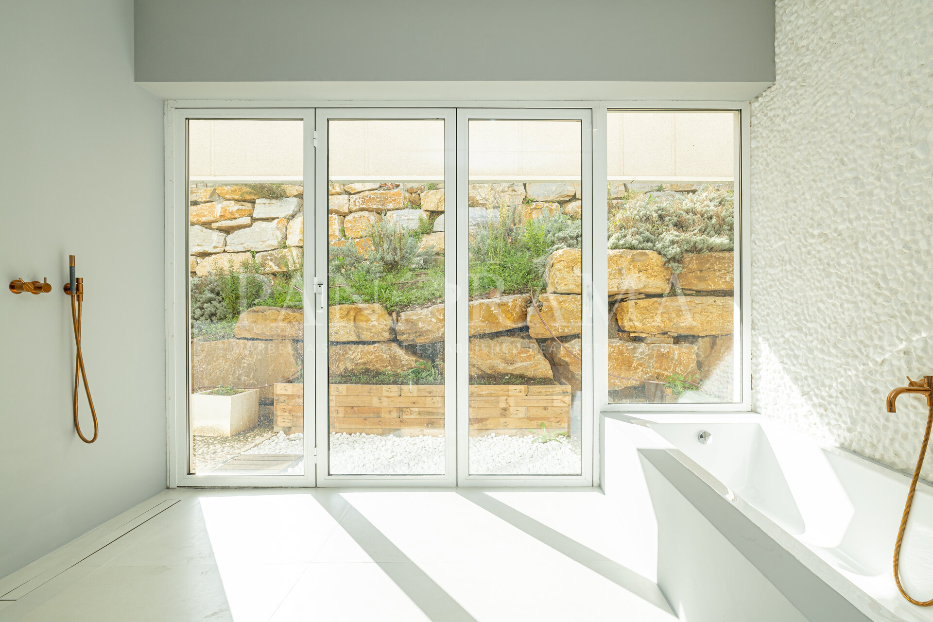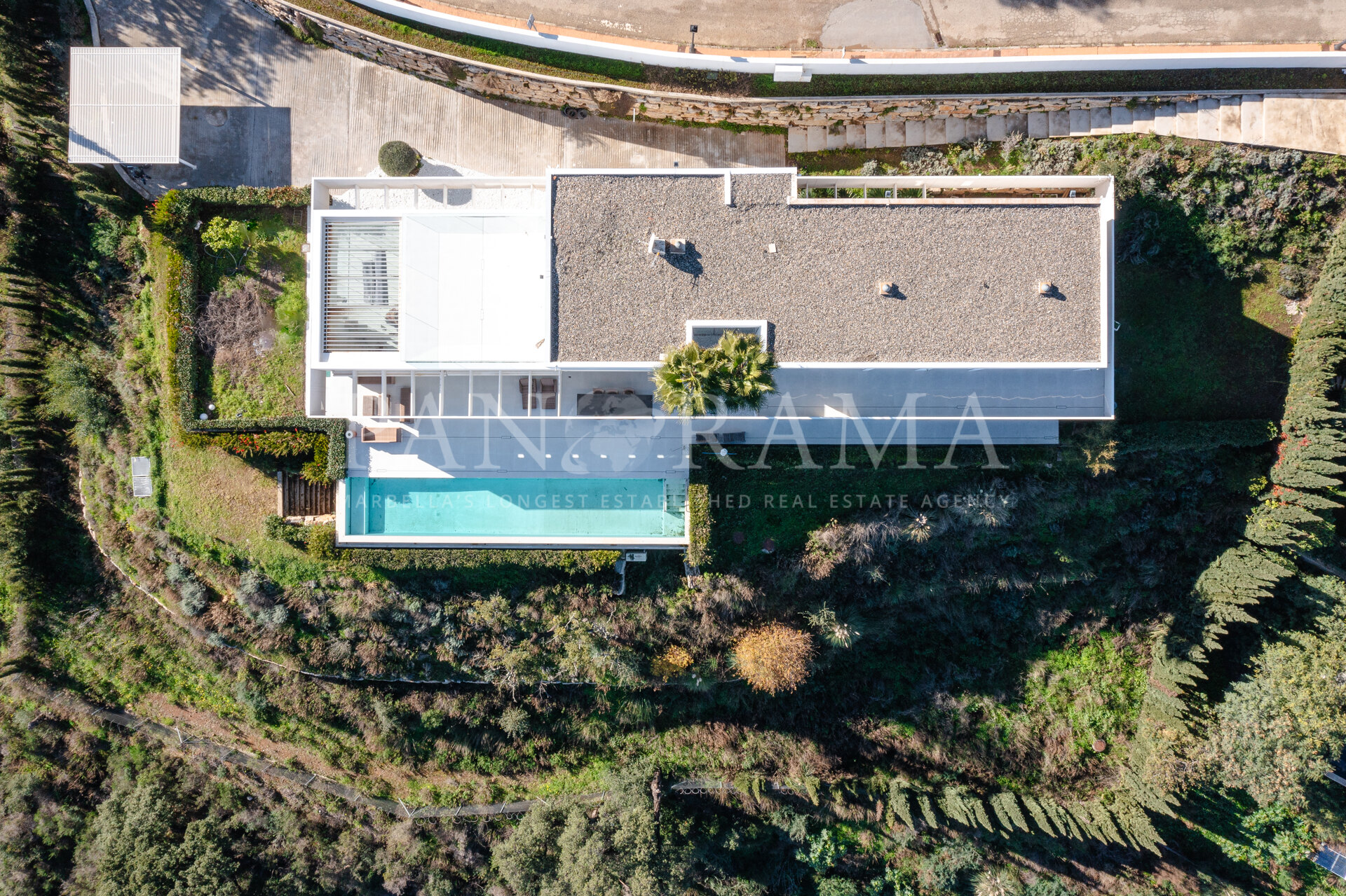 Het ontwerp van de villa benadrukt open, luchtige ruimtes en naadloos binnen-buiten leven. Grote ramen en uitgestrekte terrassen vangen de panoramische uitzichten, waardoor er een constante verbinding is met het omliggende landschap. De woning beschikt over porseleinen vloeren en hoogwaardige afwerkingen, wat verfijning en moderniteit uitstraalt.