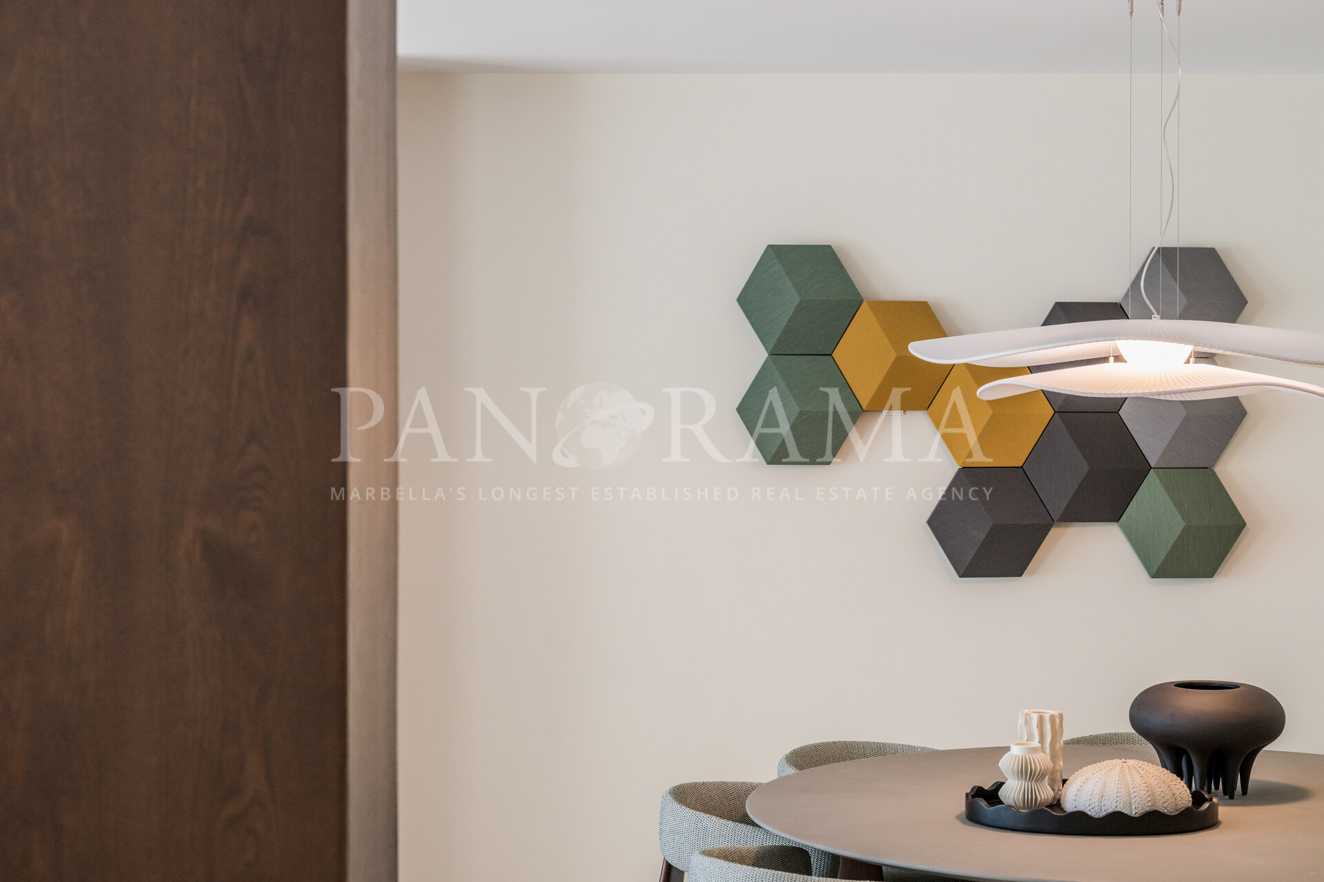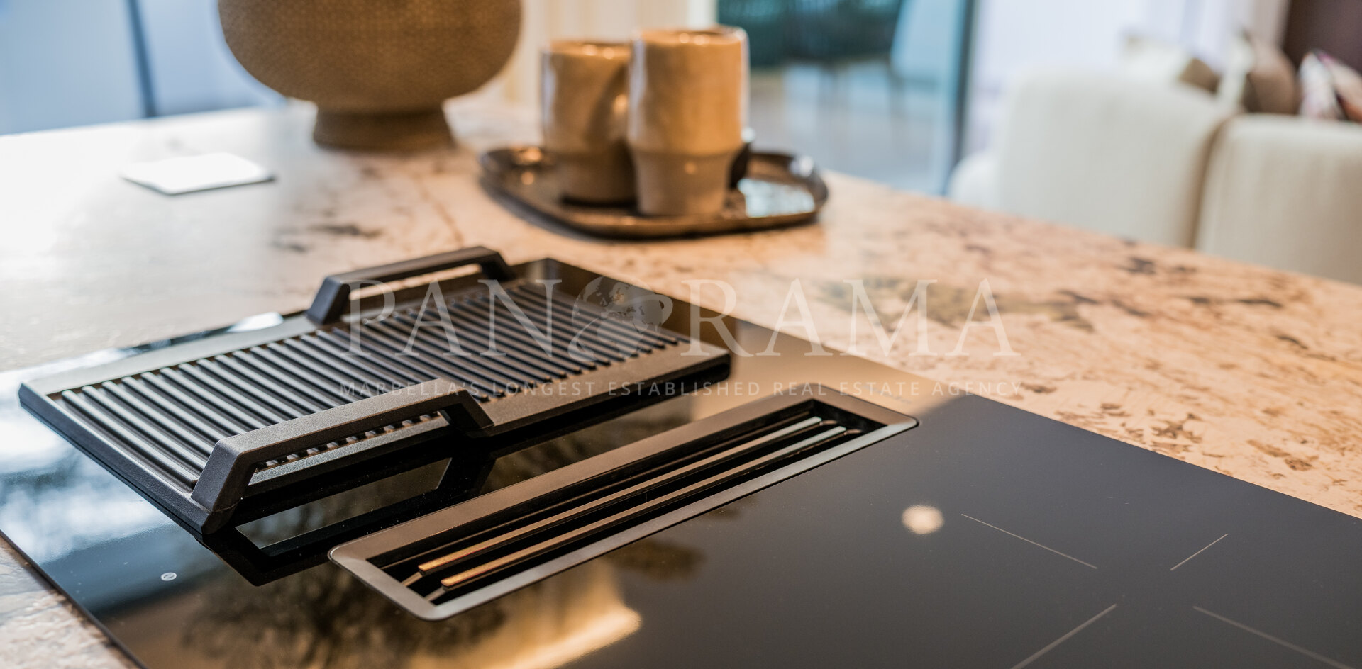 De elegante woon- en eetkamer is perfect voor zowel entertainment als ontspanning, met als hoogtepunt een chique elektrische open haard die karakter en sfeer toevoegt. Grote vloer-tot-plafond ramen overspoelen de ruimte met natuurlijk licht en bieden een prachtig uitzicht op de weelderige gemeenschappelijke tuinen en de glinsterende Middellandse Zee. Stap uit op het ruime terras om te genieten van al fresco maaltijden of ontspan gewoon terwijl u geniet van de rustige kustsfeer.