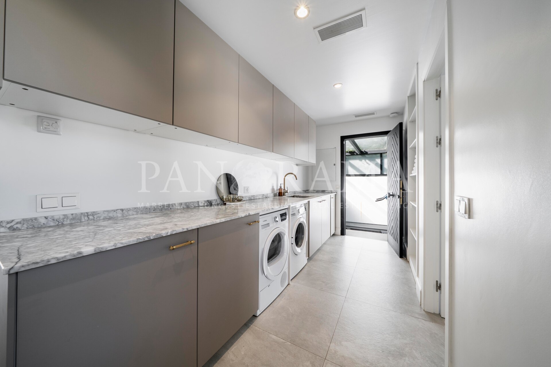 Wat betreft ontspanning en wellnessfaciliteiten biedt de villa een privézwembad, sauna, Turks bad, fitnessruimte en een tennis-/padelbaan, wat een ideale ruimte biedt voor ontspanning en lichaamsbeweging zonder het huis te verlaten. Daarnaast is er een barbecuegedeelte en een groot privéterras, ideaal voor sociale en familiale bijeenkomsten. Veiligheid is een prioriteit, met een beveiligde entree, 24-uurs bewakingsdienst, beveiligingscamera’s, video-intercom en alarmsysteem, allemaal binnen een afgesloten gemeenschap die rust en privacy garandeert.