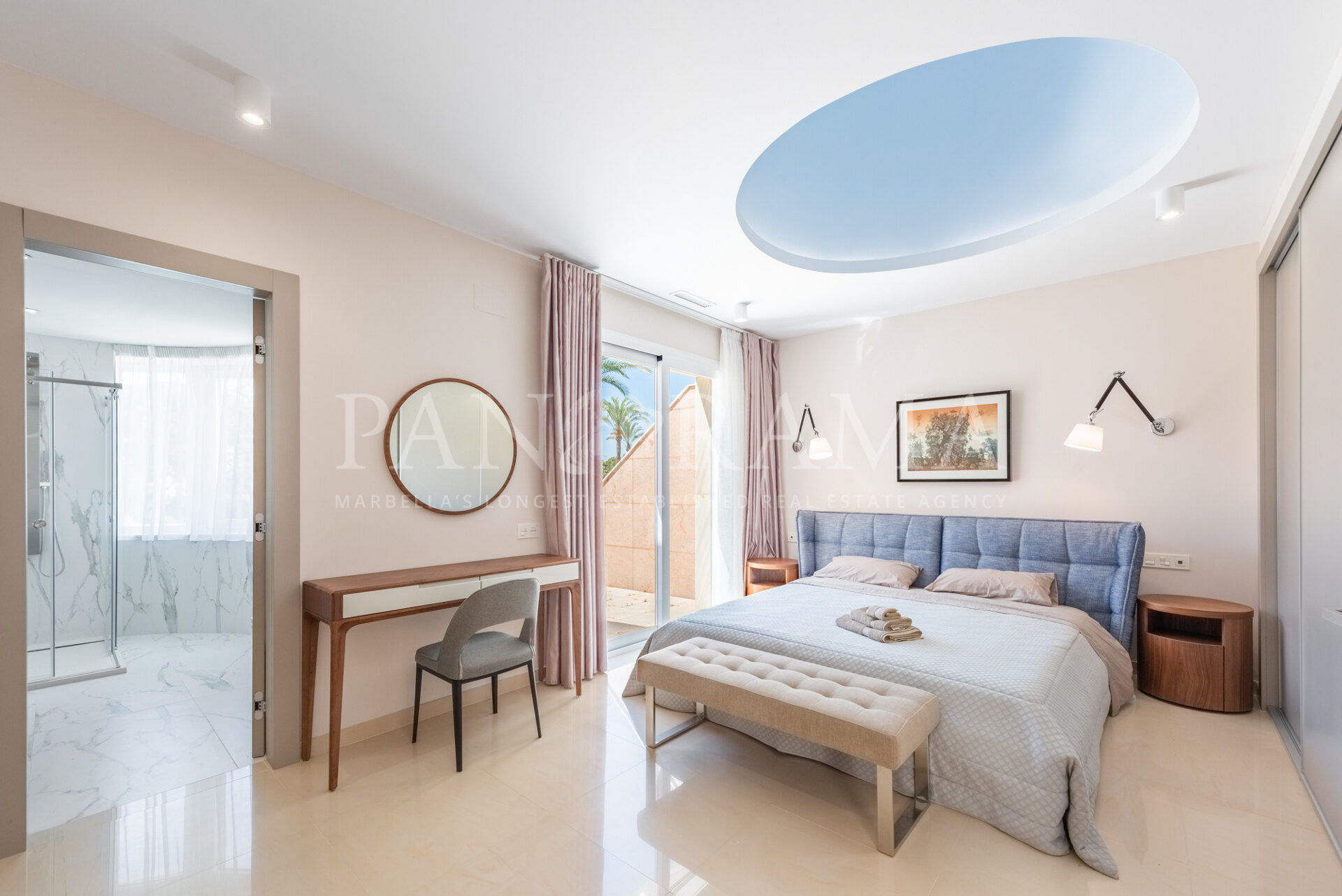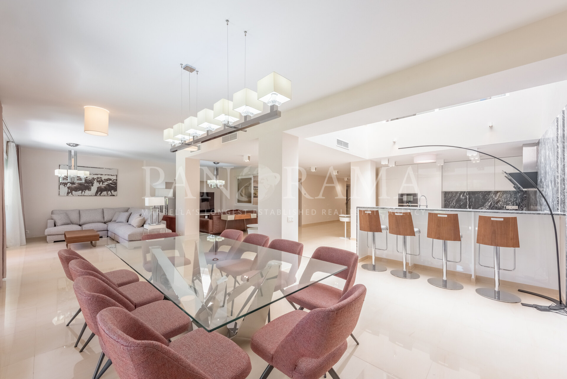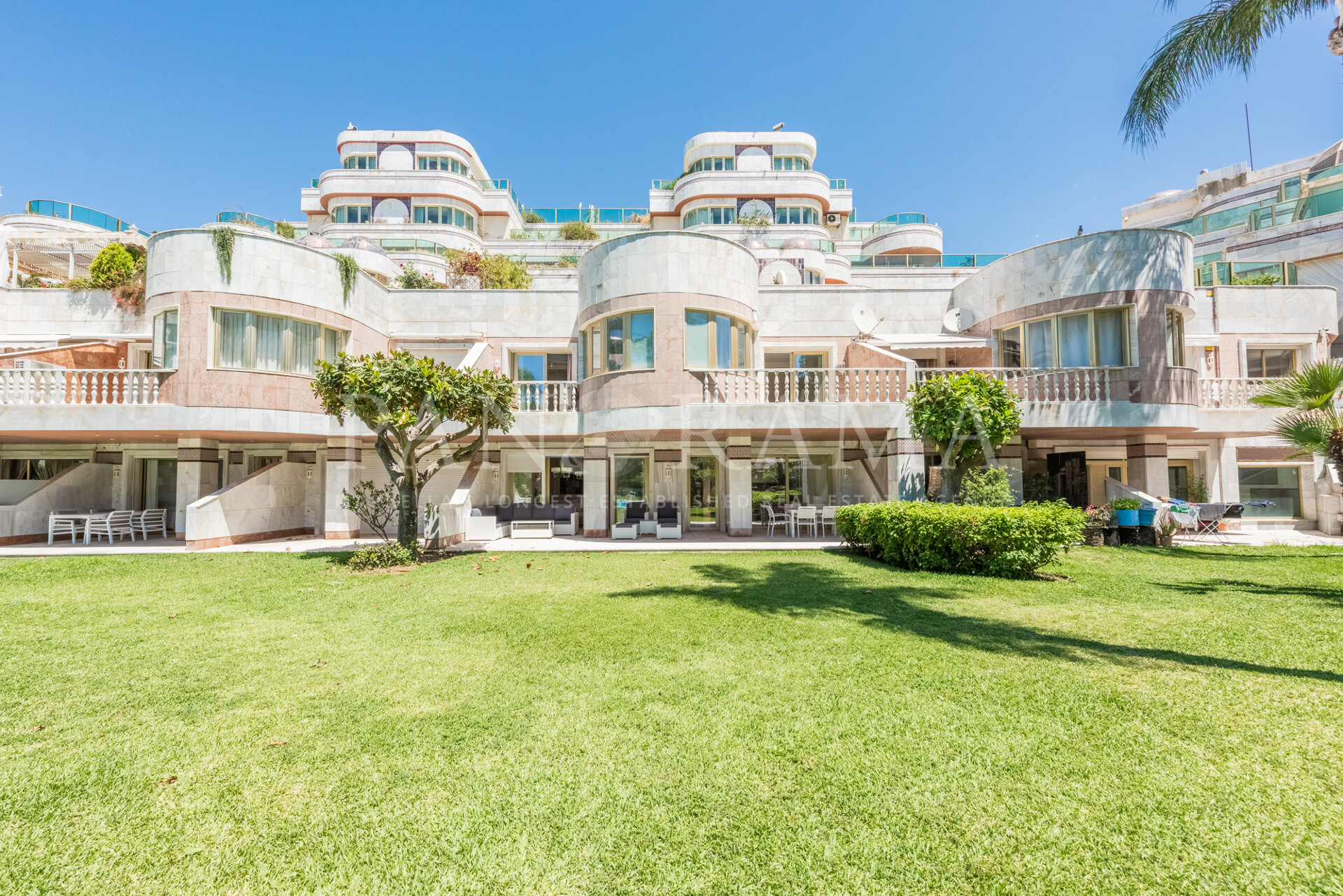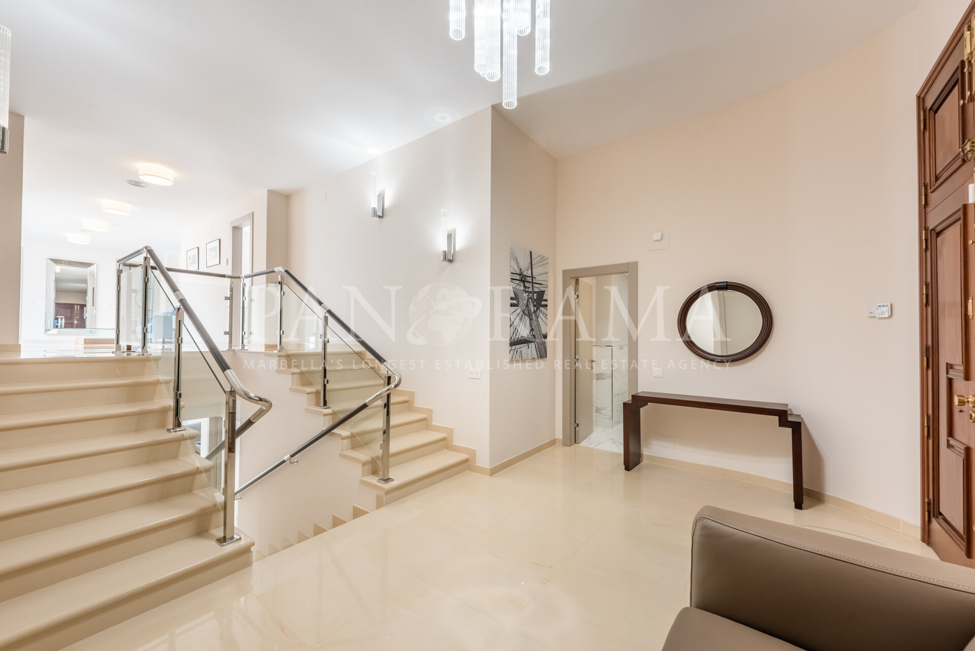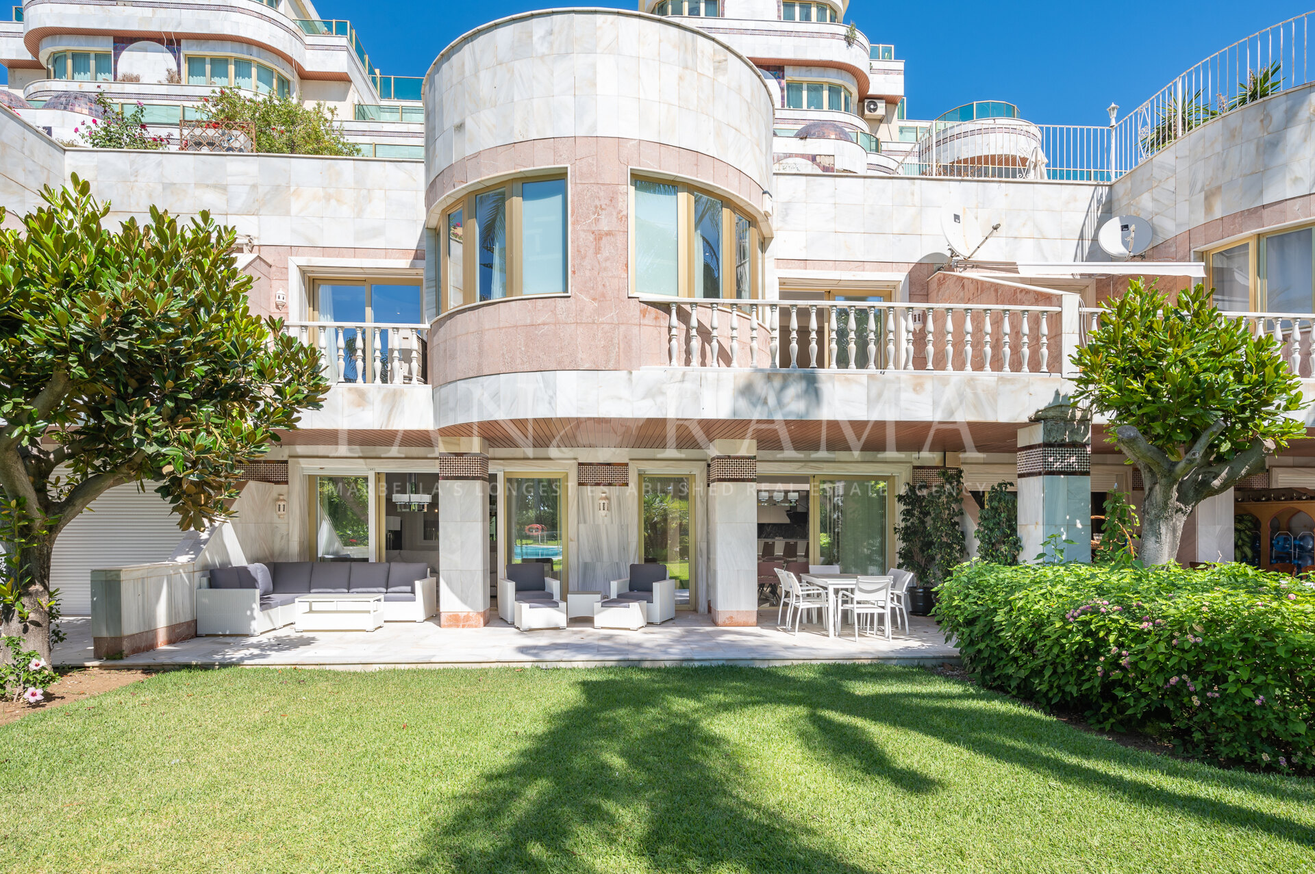 A luxurious double ground floor duplex apartment in Gray D’Albión, a beachfront luxurious complex of apartments. The complex offers beautiful tropical gardens with a communal pool, fountains and direct access to the promenade and beach. Two apartments have been joined together to form this beautiful renovated property distributed over two levels with six bedrooms and six bathrooms, impressive entrance hall, guest toilet, stairs leads to the lower floor to a very spacious and bright open-plan living area with a lounge, dining area, kitchen and direct access to a lovely terrace opening on to the communal gardens with views to the pool views, laundry room, two en-suite bedrooms and a Turkish Bath. The upper level consists of an impressive en-suite master bedroom with a Jacuzzi and dressing area, private terrace with partial sea views. There are three more en-suite bedrooms, one of which has access to a private terrace with garden and pool views. Features include: underfloor heating in the bathrooms and direct access to the communal garage with parking space for four cars. Set in a great location, walking distance to everything including cafes, restaurants, shops and all of the amenities of Puerto Banús at hand.