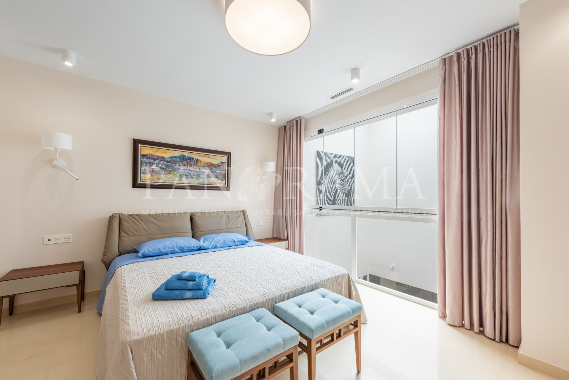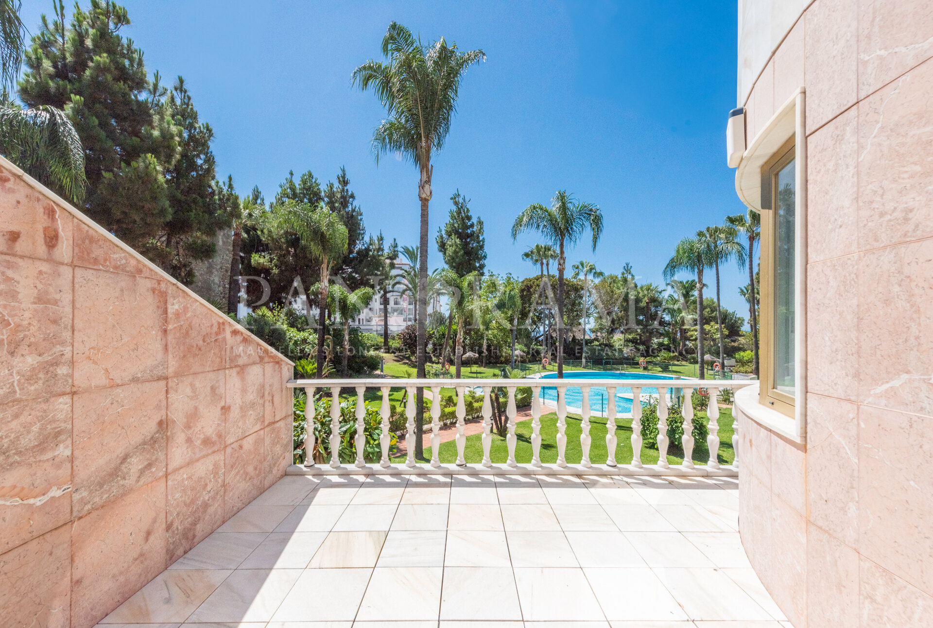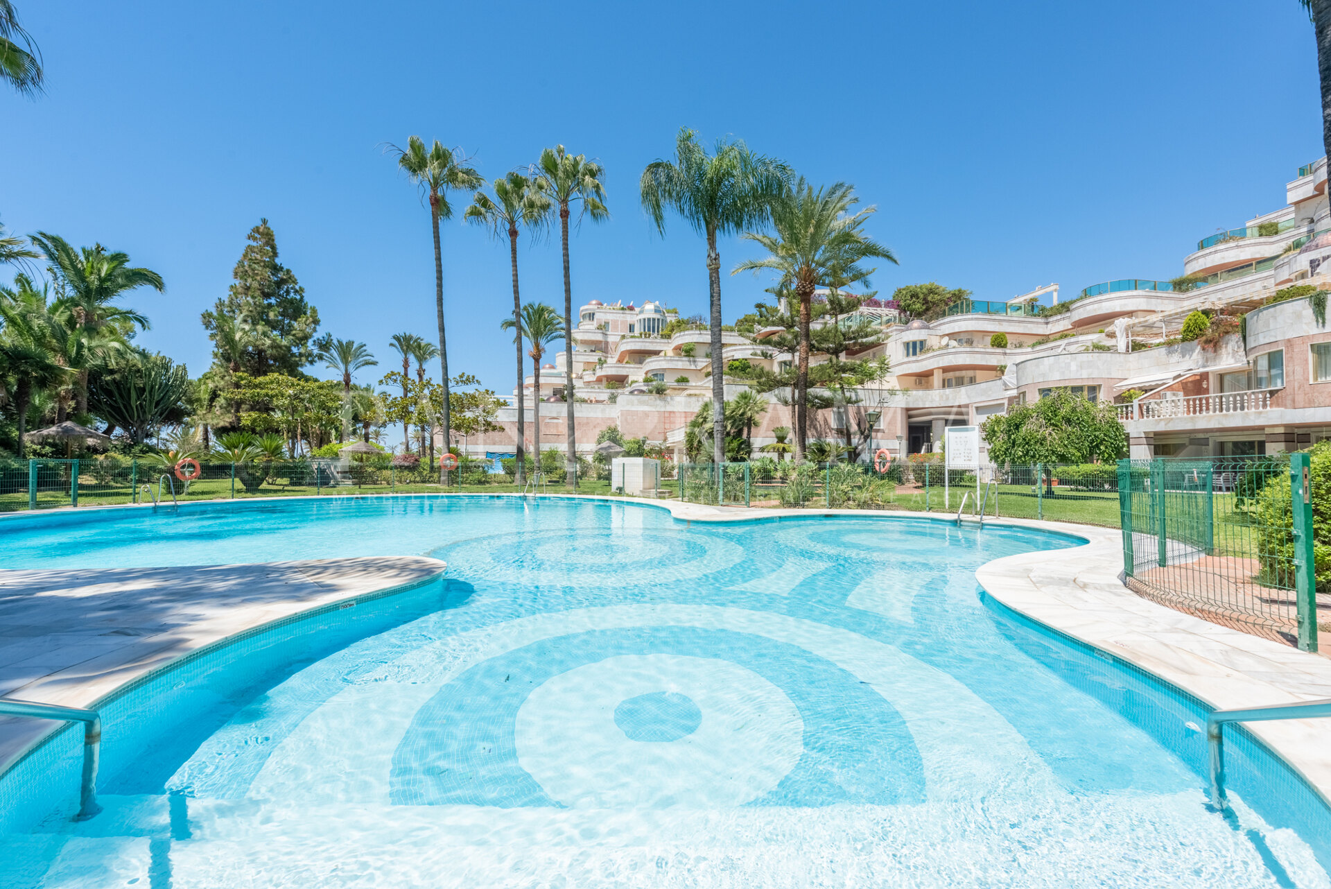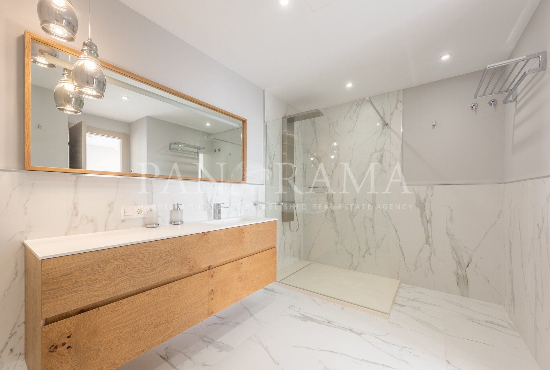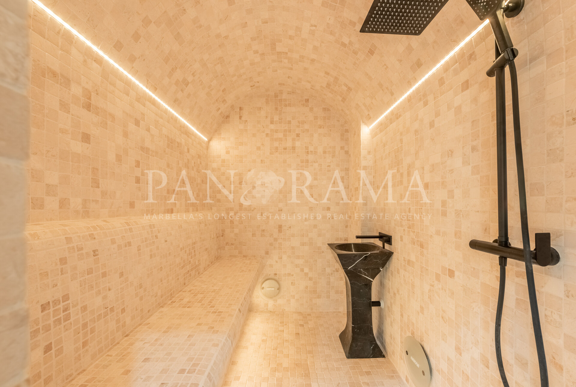 A luxurious double ground floor duplex apartment in Gray D’Albión, a beachfront luxurious complex of apartments. The complex offers beautiful tropical gardens with a communal pool, fountains and direct access to the promenade and beach. Two apartments have been joined together to form this beautiful renovated property distributed over two levels with six bedrooms and six bathrooms, impressive entrance hall, guest toilet, stairs leads to the lower floor to a very spacious and bright open-plan living area with a lounge, dining area, kitchen and direct access to a lovely terrace opening on to the communal gardens with views to the pool views, laundry room, two en-suite bedrooms and a Turkish Bath. The upper level consists of an impressive en-suite master bedroom with a Jacuzzi and dressing area, private terrace with partial sea views. There are three more en-suite bedrooms, one of which has access to a private terrace with garden and pool views. Features include: underfloor heating in the bathrooms and direct access to the communal garage with parking space for four cars. Set in a great location, walking distance to everything including cafes, restaurants, shops and all of the amenities of Puerto Banús at hand.