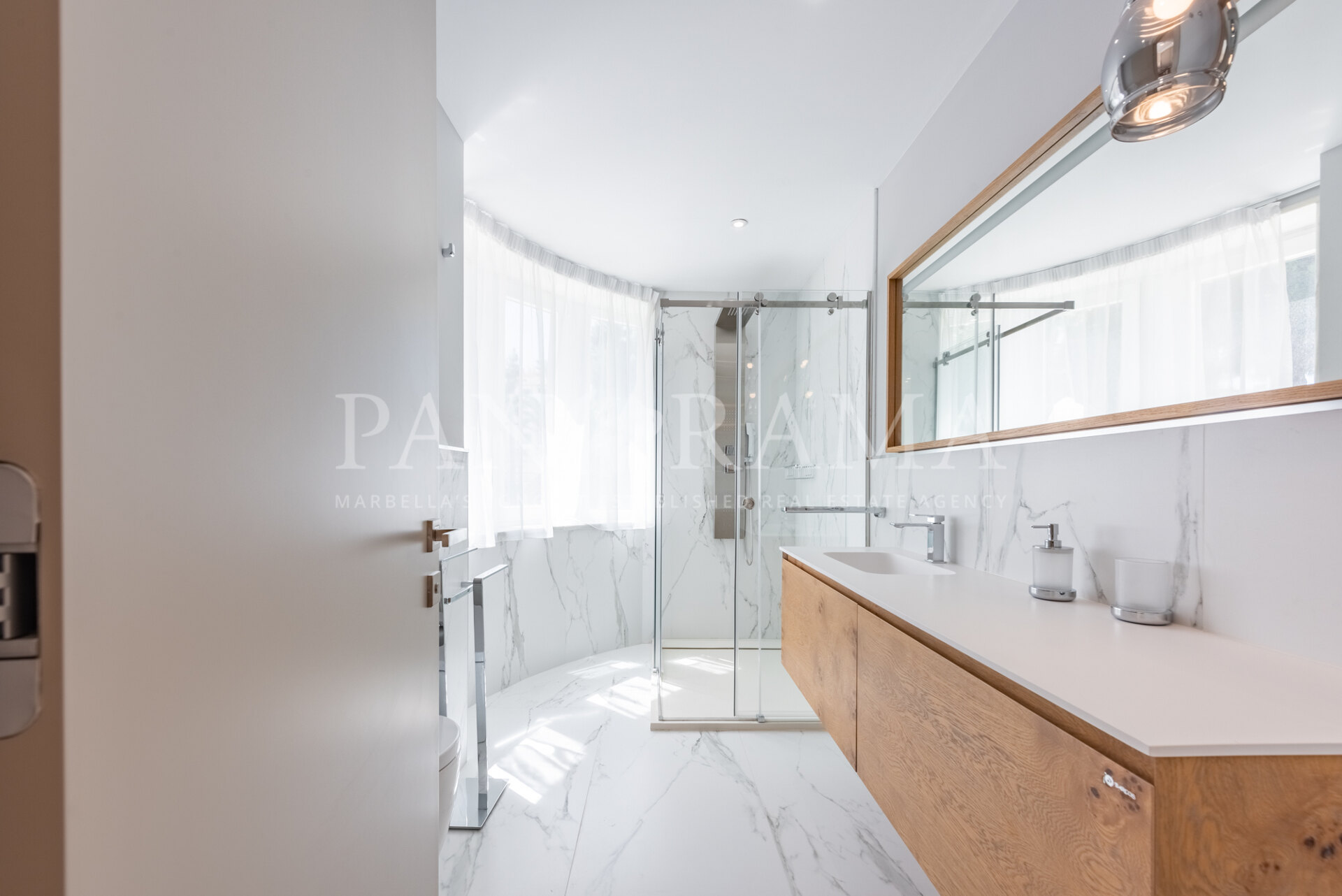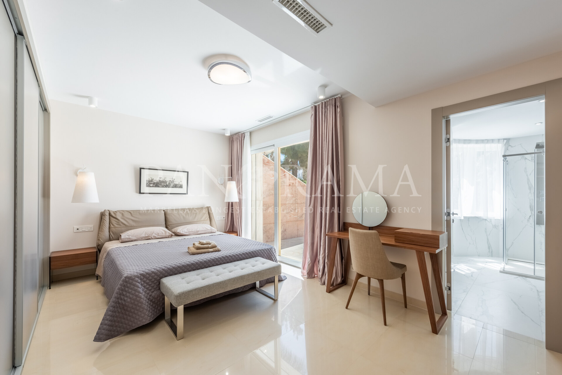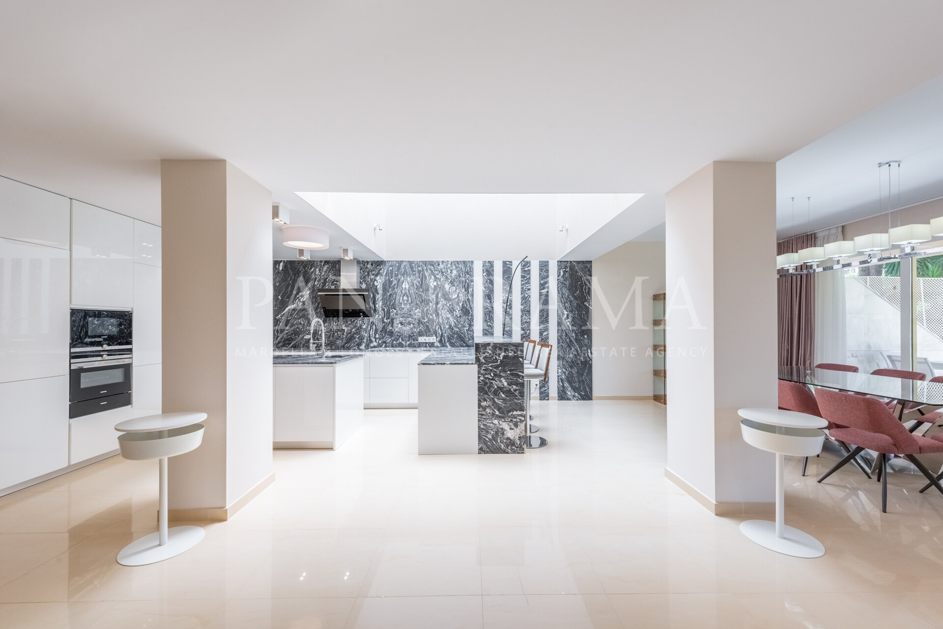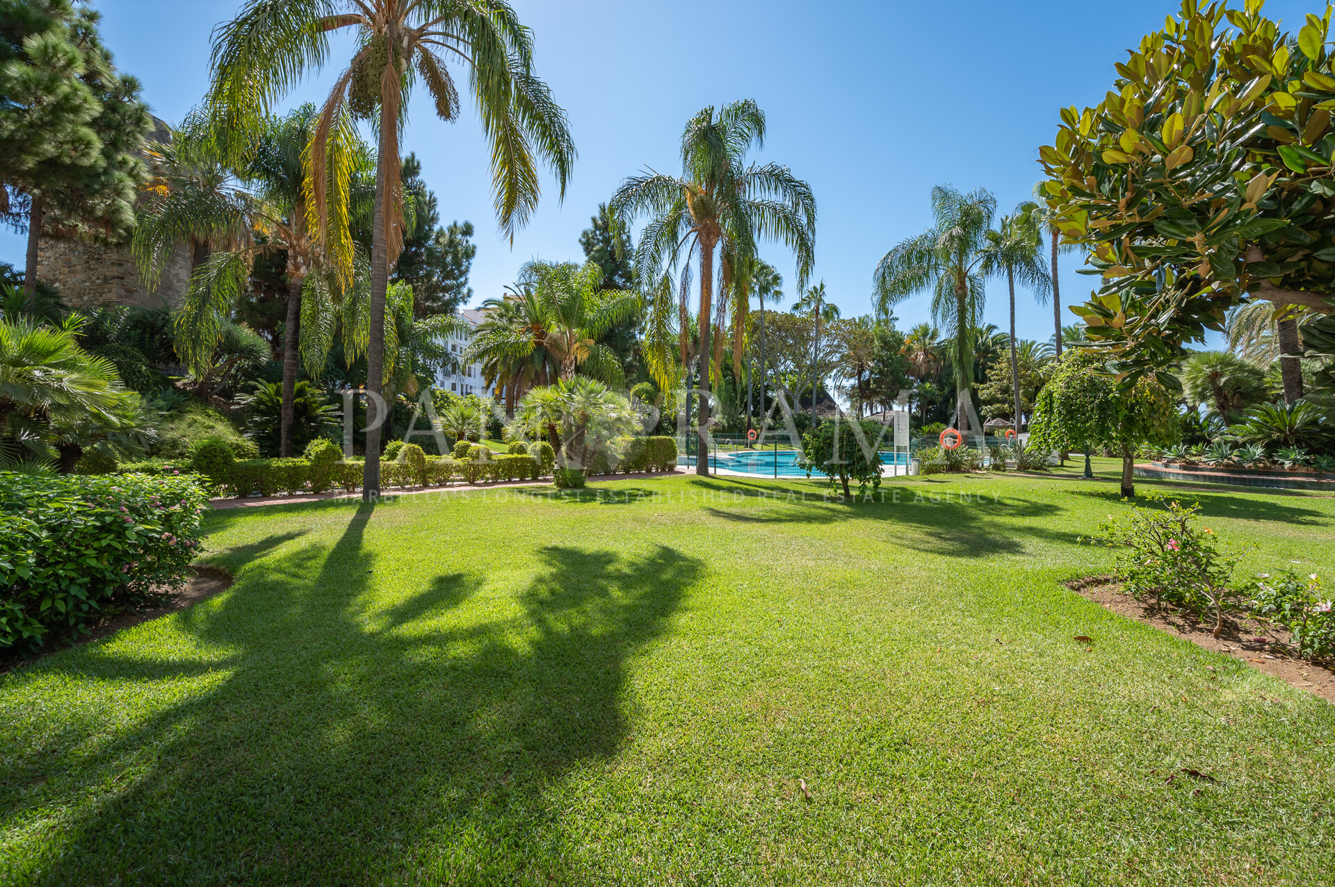 A luxurious double ground floor duplex apartment in Gray D’Albión, a beachfront luxurious complex of apartments. The complex offers beautiful tropical gardens with a communal pool, fountains and direct access to the promenade and beach. Two apartments have been joined together to form this beautiful renovated property distributed over two levels with six bedrooms and six bathrooms, impressive entrance hall, guest toilet, stairs leads to the lower floor to a very spacious and bright open-plan living area with a lounge, dining area, kitchen and direct access to a lovely terrace opening on to the communal gardens with views to the pool views, laundry room, two en-suite bedrooms and a Turkish Bath. The upper level consists of an impressive en-suite master bedroom with a Jacuzzi and dressing area, private terrace with partial sea views. There are three more en-suite bedrooms, one of which has access to a private terrace with garden and pool views. Features include: underfloor heating in the bathrooms and direct access to the communal garage with parking space for four cars. Set in a great location, walking distance to everything including cafes, restaurants, shops and all of the amenities of Puerto Banús at hand.