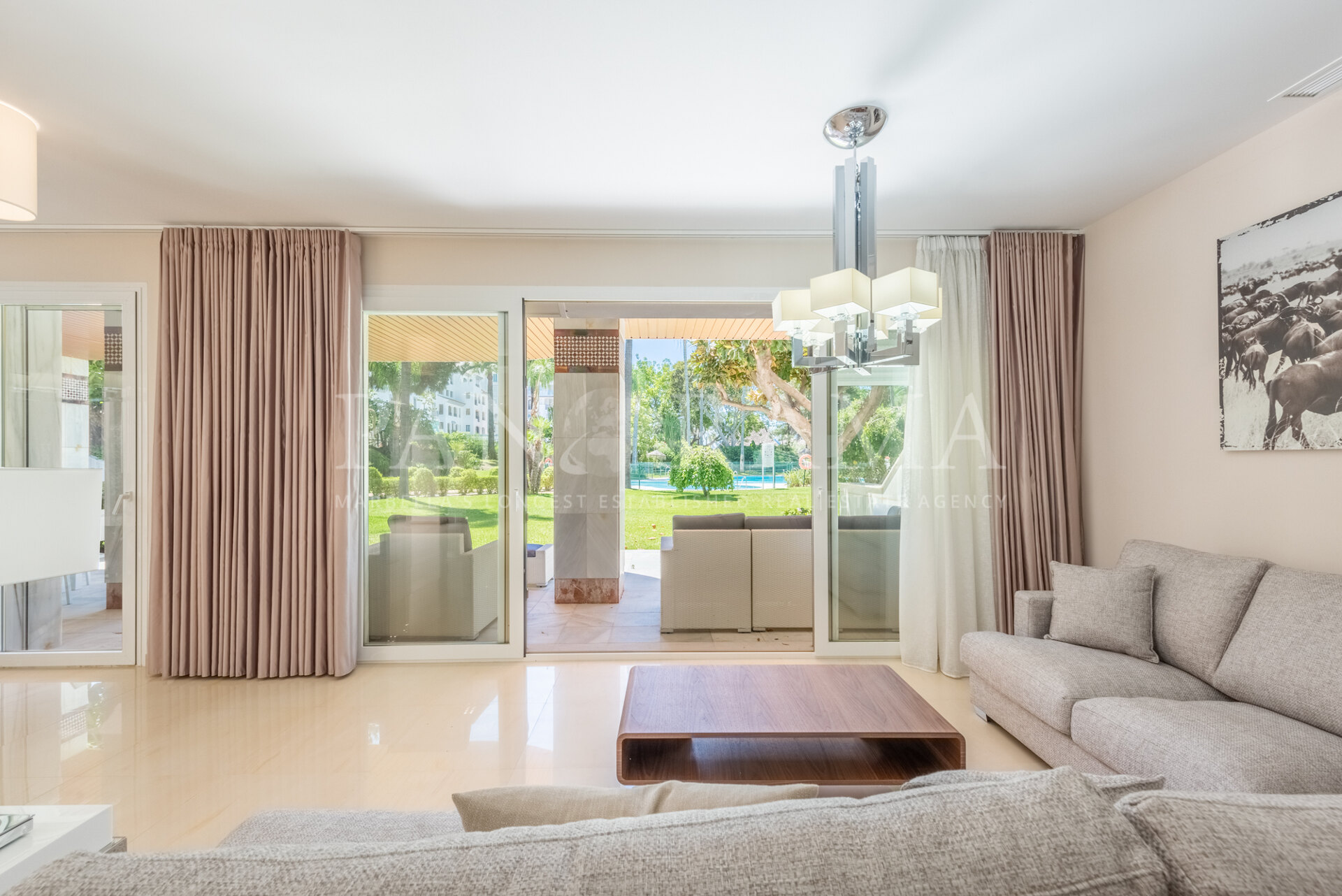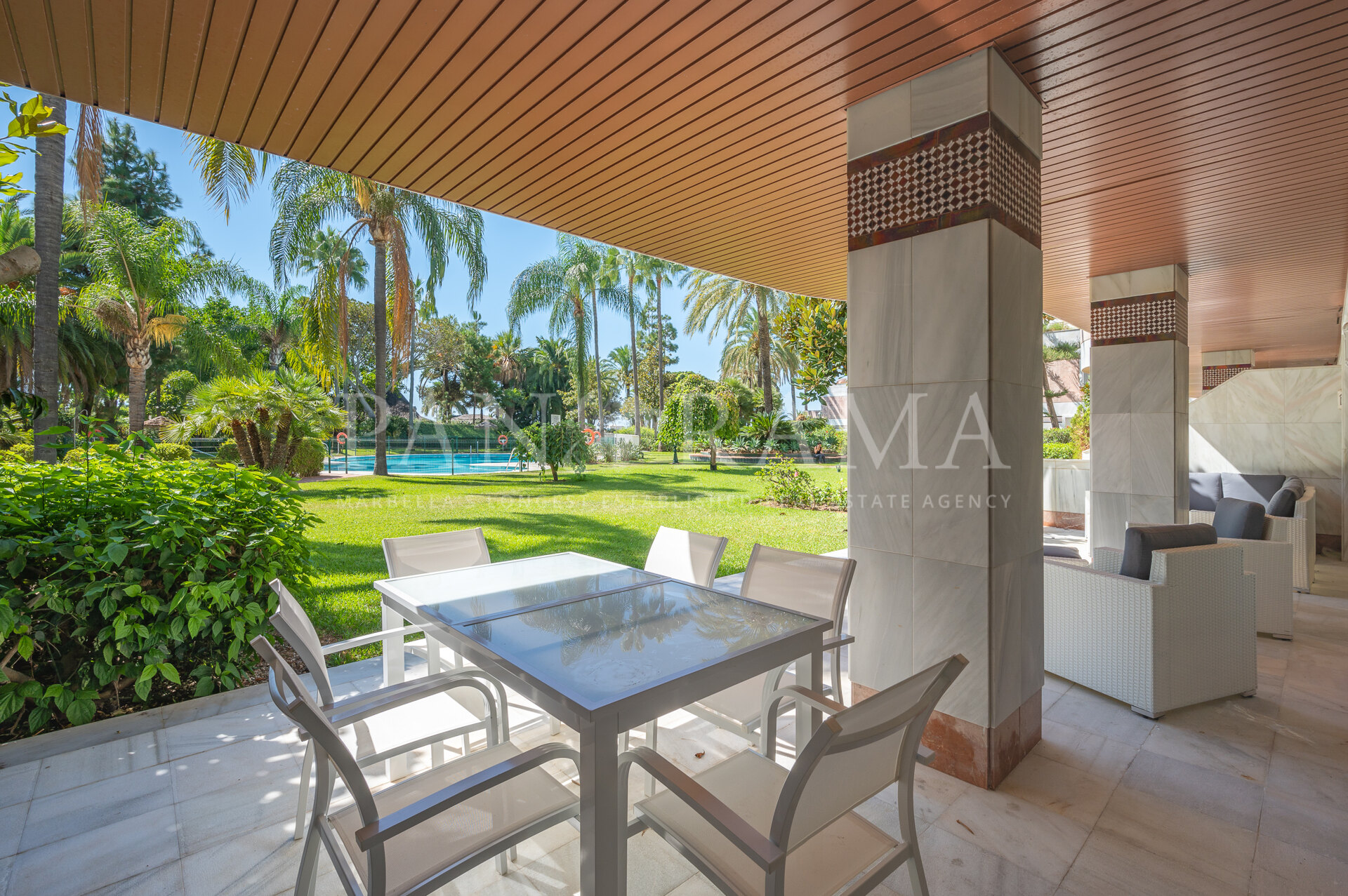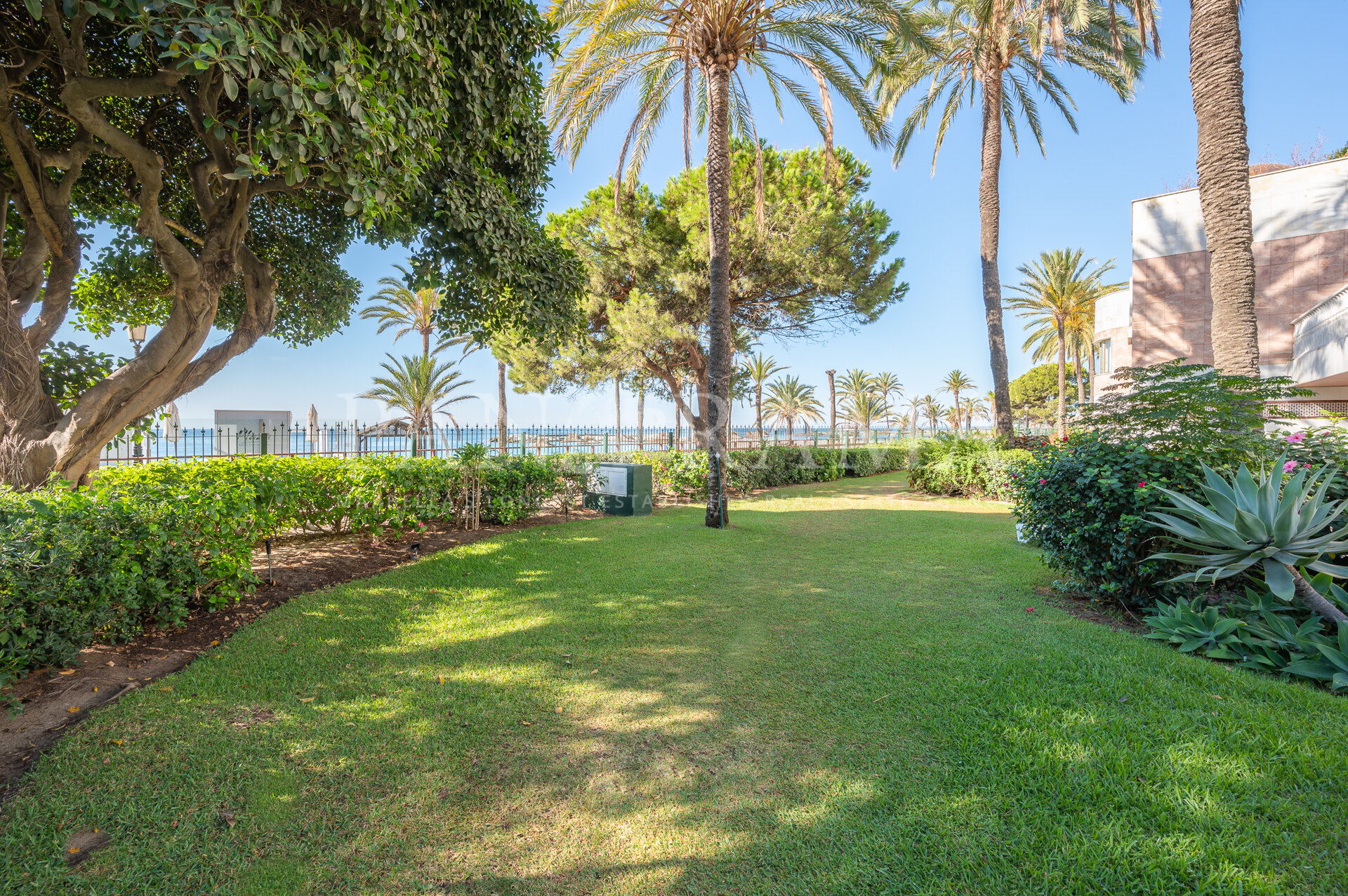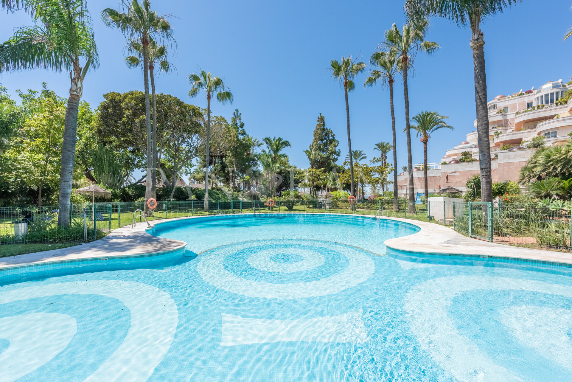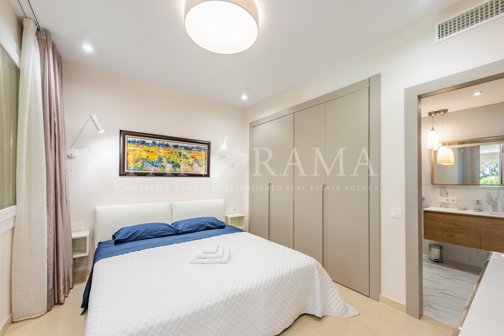 A luxurious double ground floor duplex apartment in Gray D’Albión, a beachfront luxurious complex of apartments. The complex offers beautiful tropical gardens with a communal pool, fountains and direct access to the promenade and beach. Two apartments have been joined together to form this beautiful renovated property distributed over two levels with six bedrooms and six bathrooms, impressive entrance hall, guest toilet, stairs leads to the lower floor to a very spacious and bright open-plan living area with a lounge, dining area, kitchen and direct access to a lovely terrace opening on to the communal gardens with views to the pool views, laundry room, two en-suite bedrooms and a Turkish Bath. The upper level consists of an impressive en-suite master bedroom with a Jacuzzi and dressing area, private terrace with partial sea views. There are three more en-suite bedrooms, one of which has access to a private terrace with garden and pool views. Features include: underfloor heating in the bathrooms and direct access to the communal garage with parking space for four cars. Set in a great location, walking distance to everything including cafes, restaurants, shops and all of the amenities of Puerto Banús at hand.