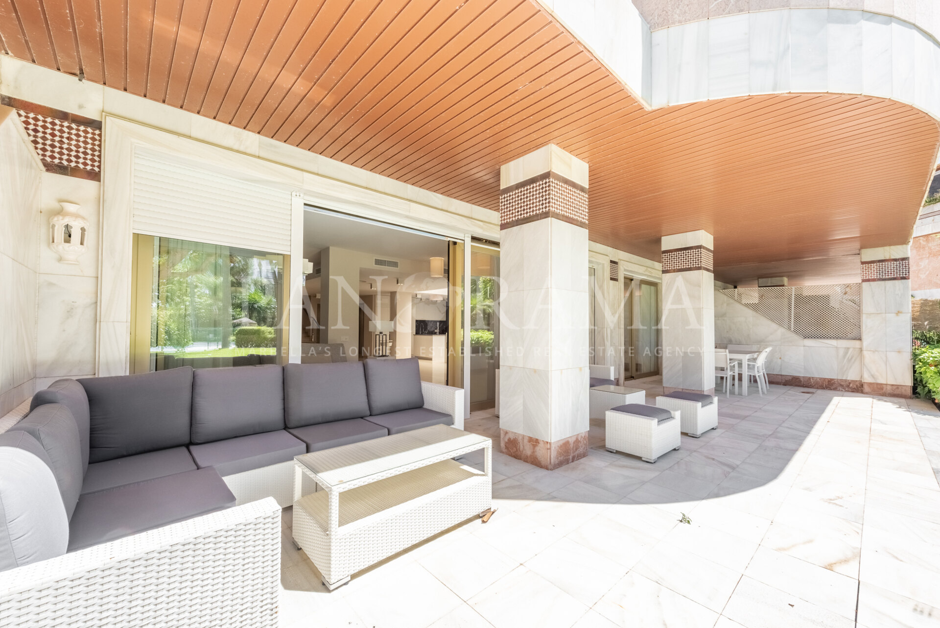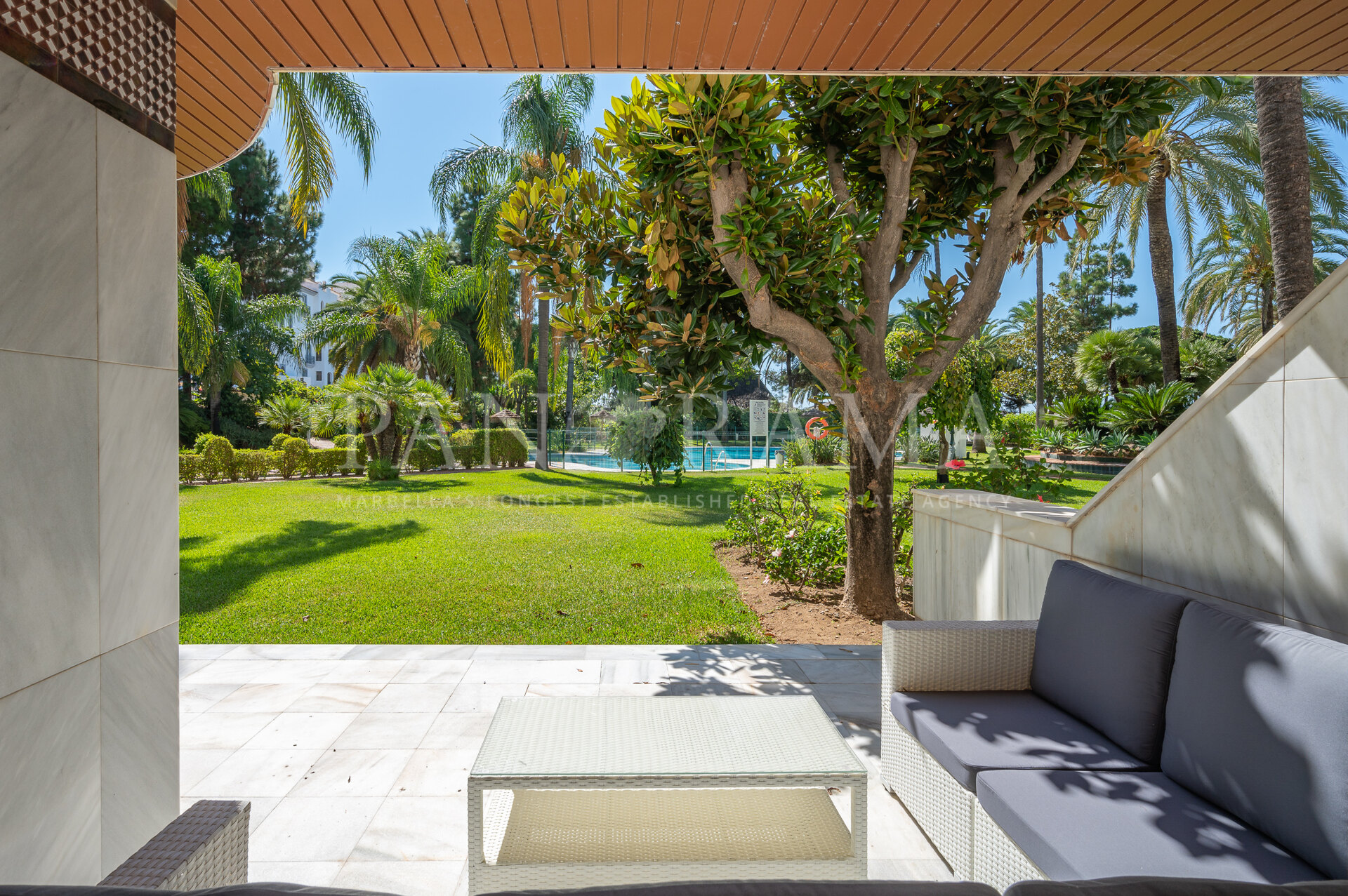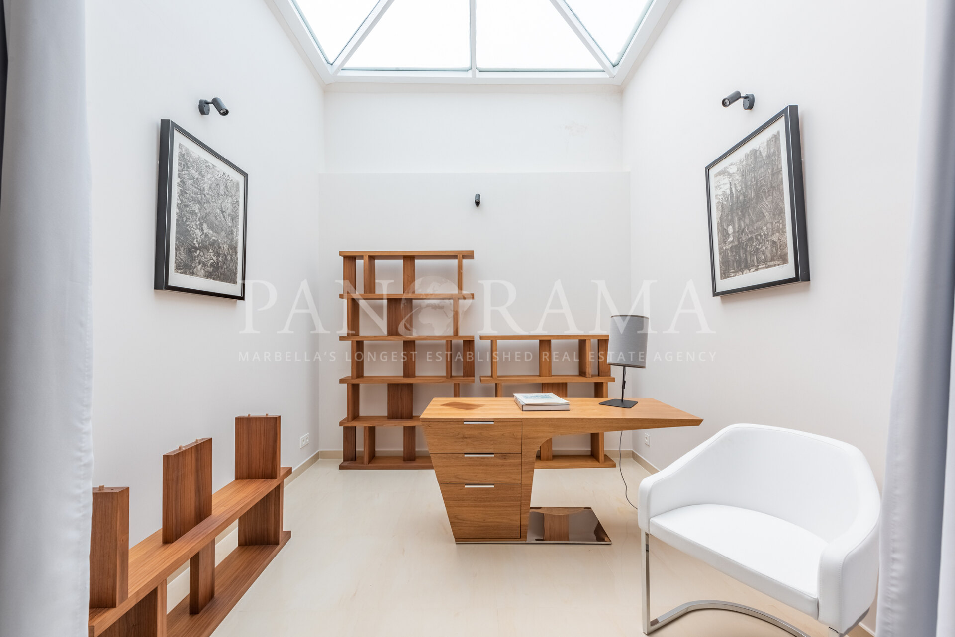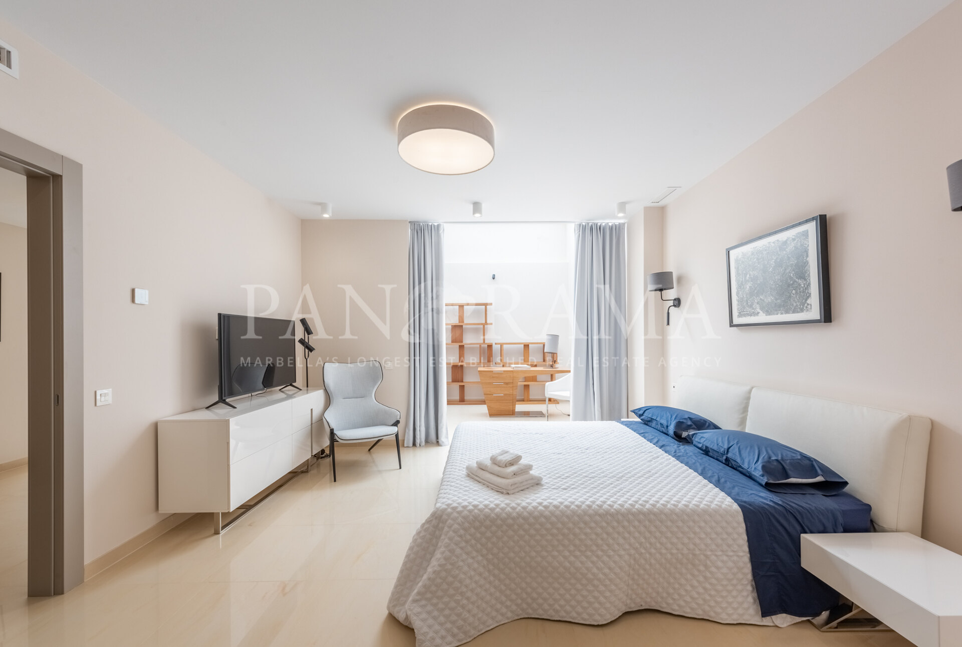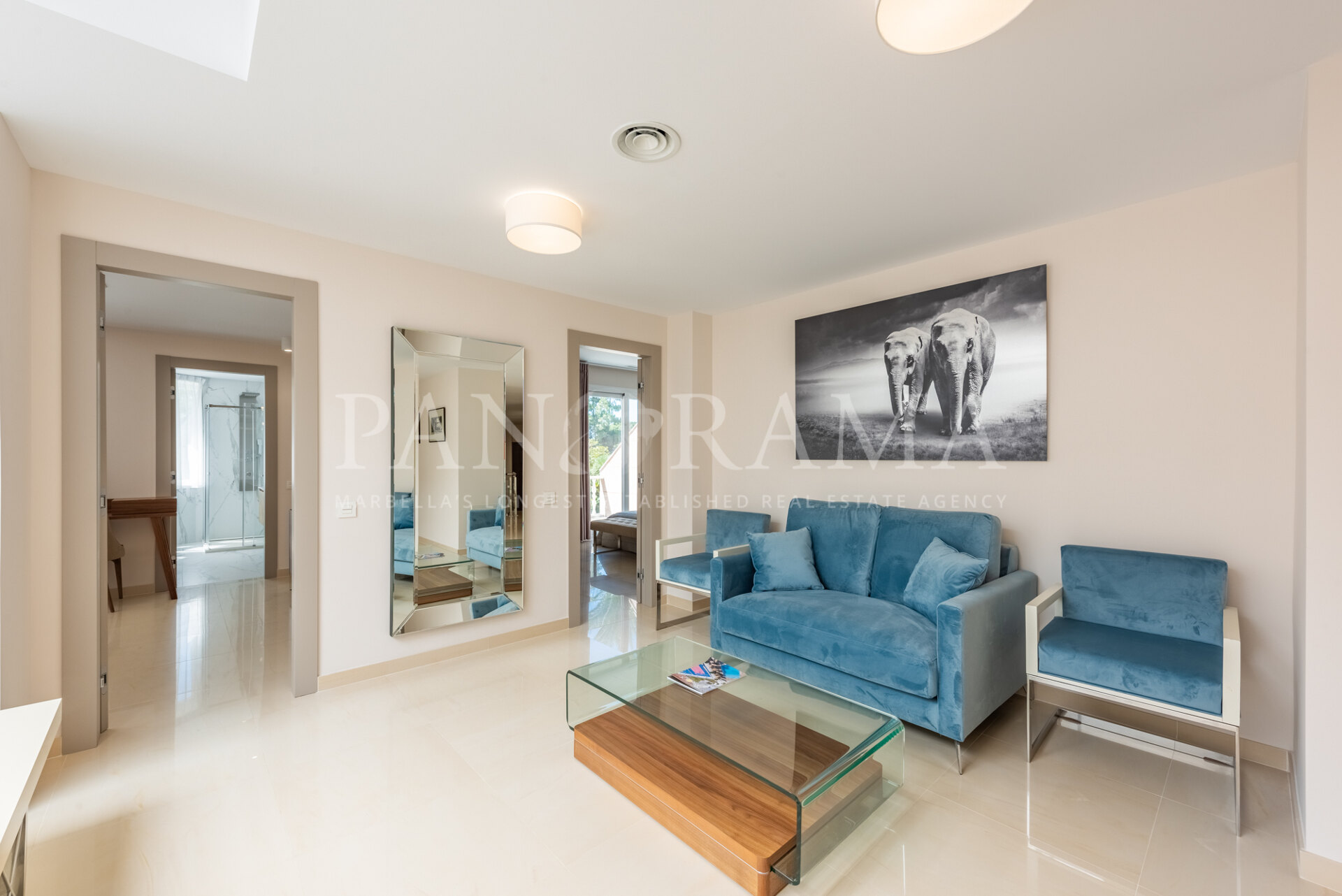 A luxurious double ground floor duplex apartment in Gray D’Albión, a beachfront luxurious complex of apartments. The complex offers beautiful tropical gardens with a communal pool, fountains and direct access to the promenade and beach. Two apartments have been joined together to form this beautiful renovated property distributed over two levels with six bedrooms and six bathrooms, impressive entrance hall, guest toilet, stairs leads to the lower floor to a very spacious and bright open-plan living area with a lounge, dining area, kitchen and direct access to a lovely terrace opening on to the communal gardens with views to the pool views, laundry room, two en-suite bedrooms and a Turkish Bath. The upper level consists of an impressive en-suite master bedroom with a Jacuzzi and dressing area, private terrace with partial sea views. There are three more en-suite bedrooms, one of which has access to a private terrace with garden and pool views. Features include: underfloor heating in the bathrooms and direct access to the communal garage with parking space for four cars. Set in a great location, walking distance to everything including cafes, restaurants, shops and all of the amenities of Puerto Banús at hand.