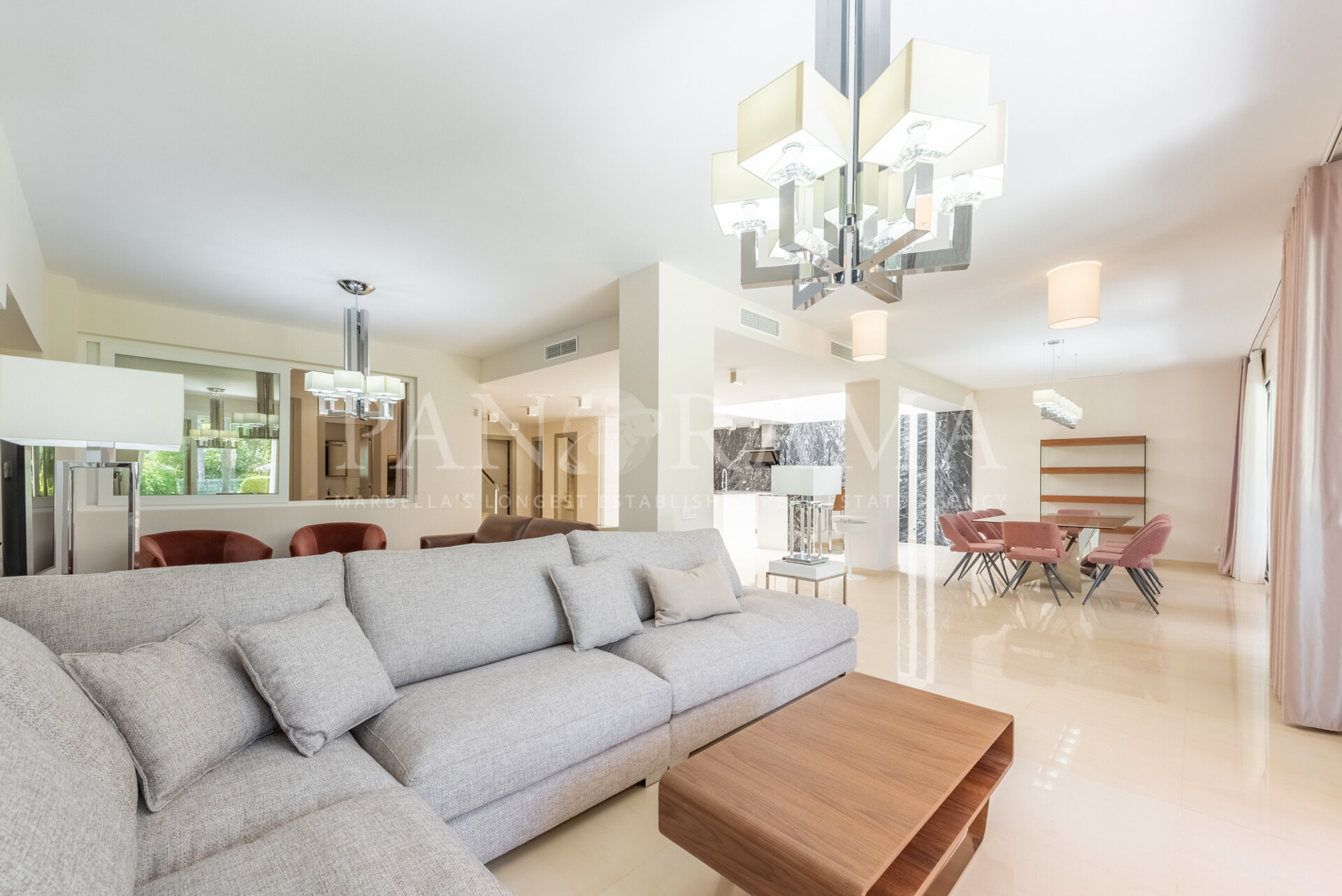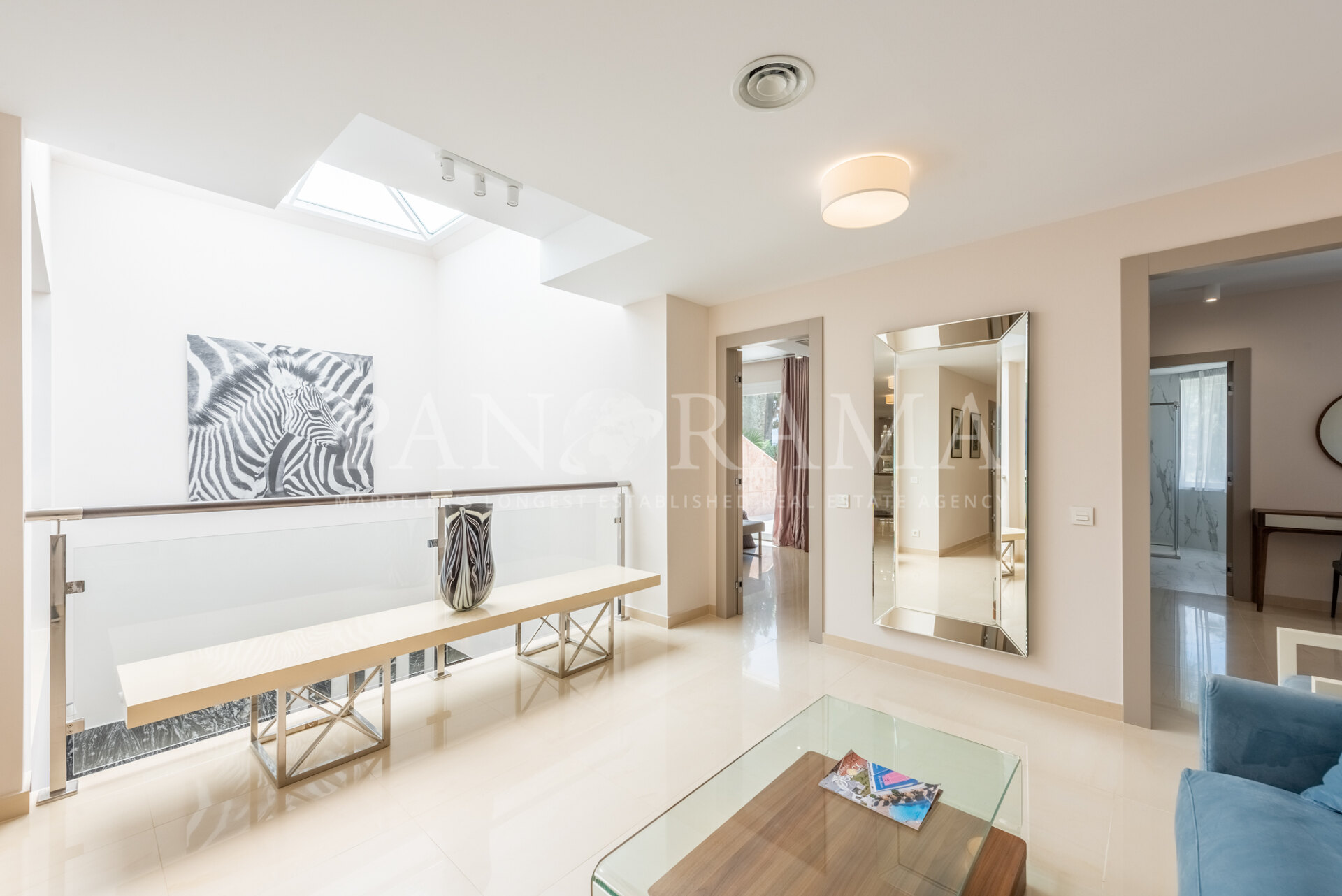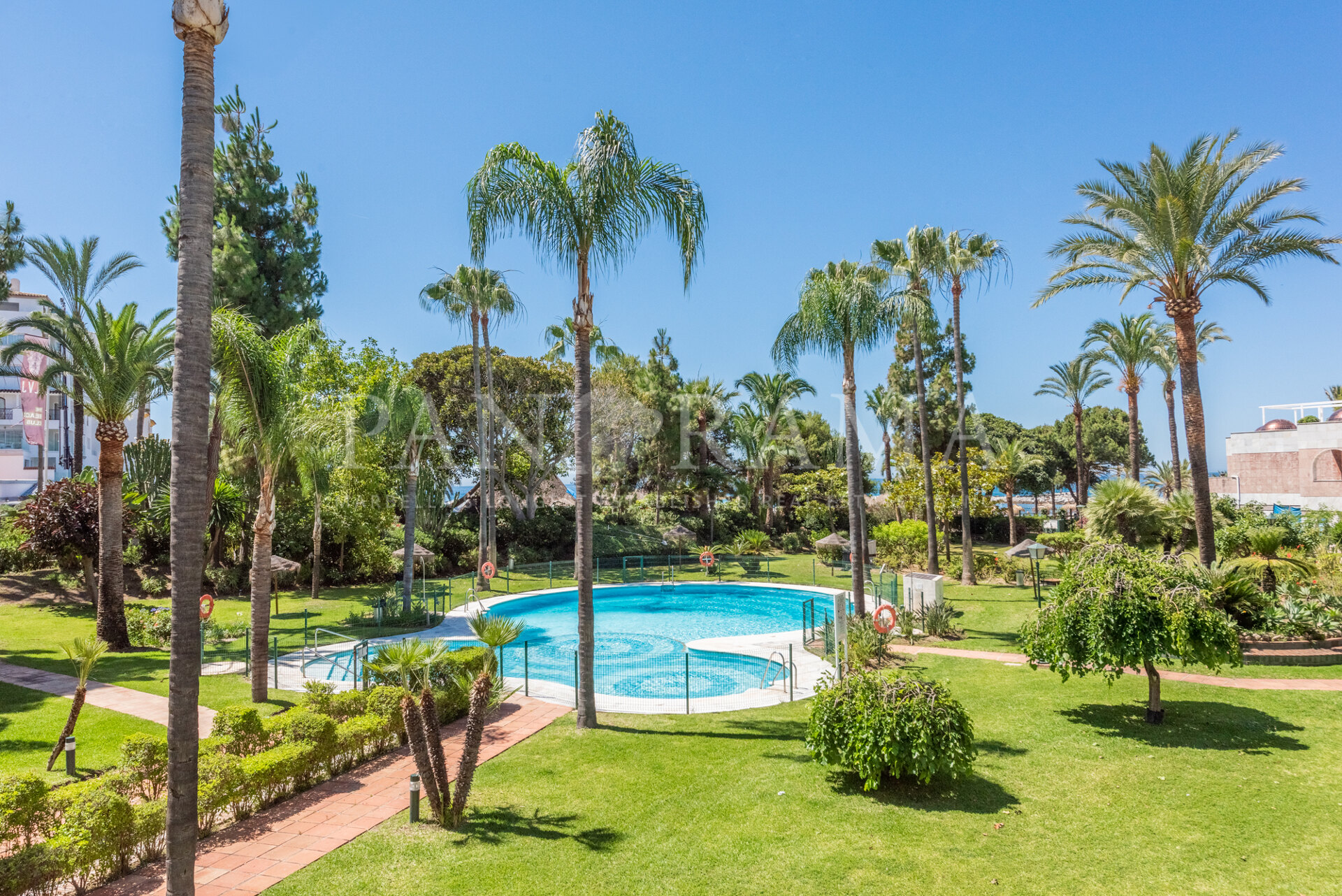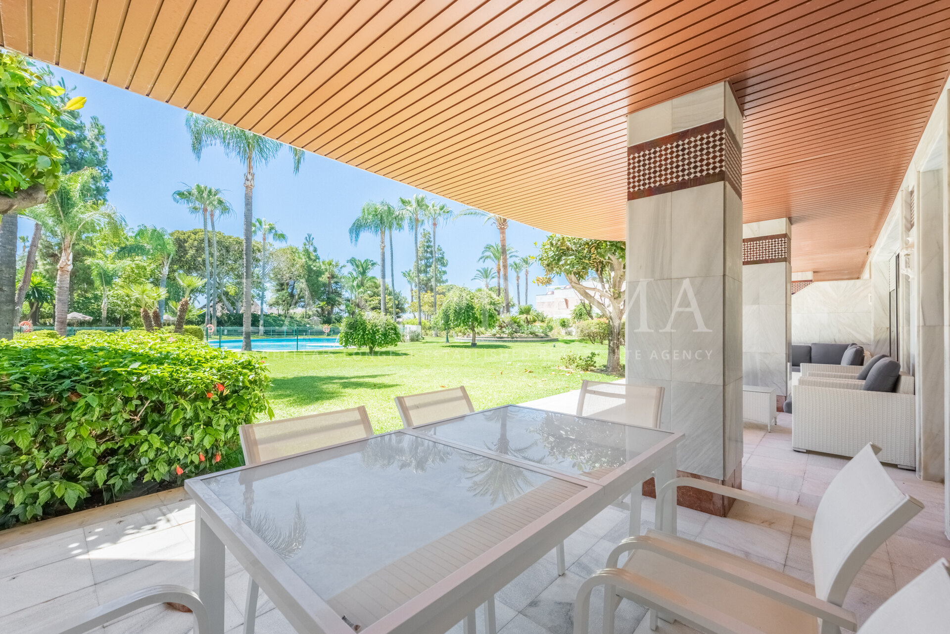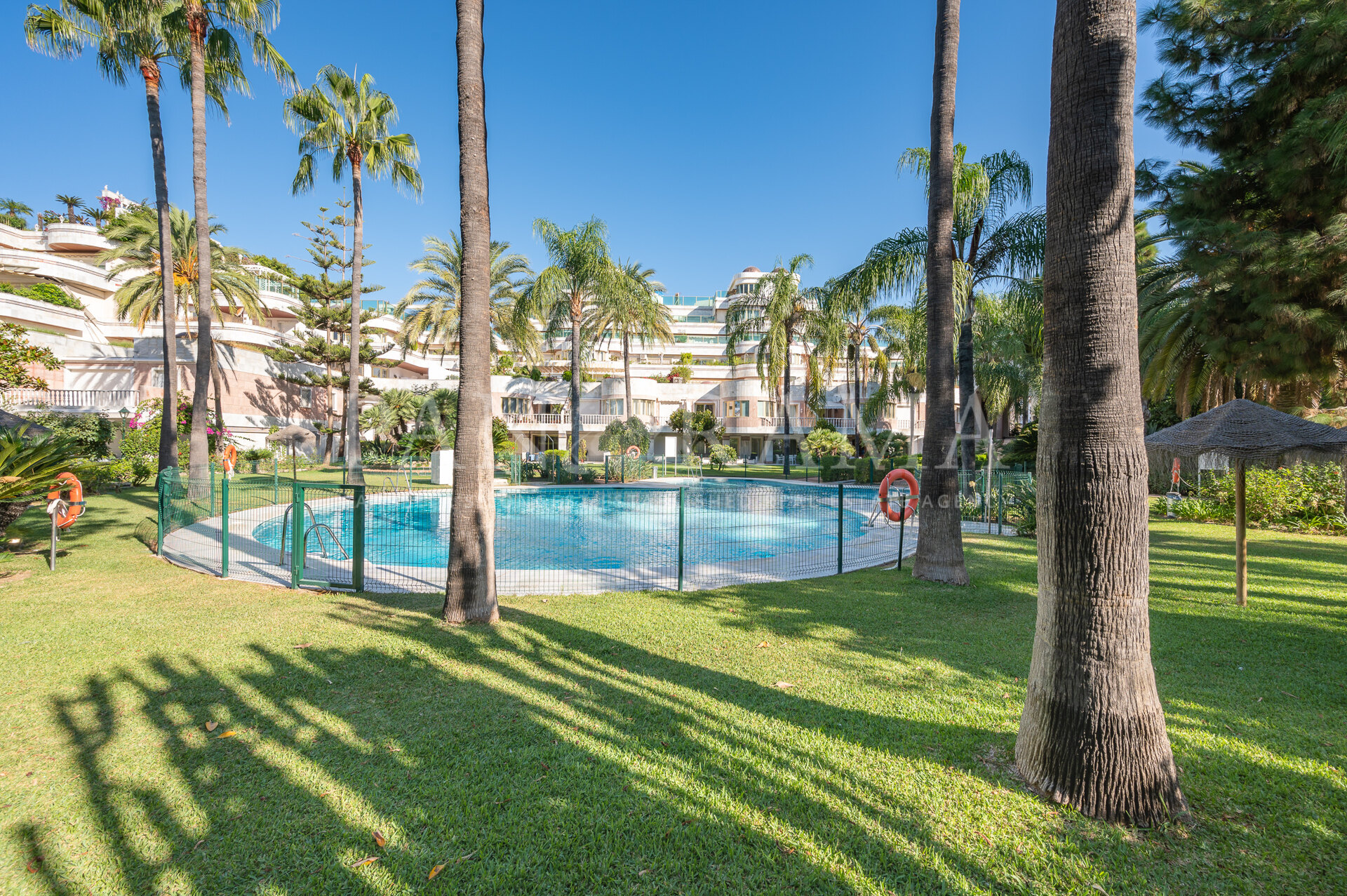 A luxurious double ground floor duplex apartment in Gray D’Albión, a beachfront luxurious complex of apartments. The complex offers beautiful tropical gardens with a communal pool, fountains and direct access to the promenade and beach. Two apartments have been joined together to form this beautiful renovated property distributed over two levels with six bedrooms and six bathrooms, impressive entrance hall, guest toilet, stairs leads to the lower floor to a very spacious and bright open-plan living area with a lounge, dining area, kitchen and direct access to a lovely terrace opening on to the communal gardens with views to the pool views, laundry room, two en-suite bedrooms and a Turkish Bath. The upper level consists of an impressive en-suite master bedroom with a Jacuzzi and dressing area, private terrace with partial sea views. There are three more en-suite bedrooms, one of which has access to a private terrace with garden and pool views. Features include: underfloor heating in the bathrooms and direct access to the communal garage with parking space for four cars. Set in a great location, walking distance to everything including cafes, restaurants, shops and all of the amenities of Puerto Banús at hand.