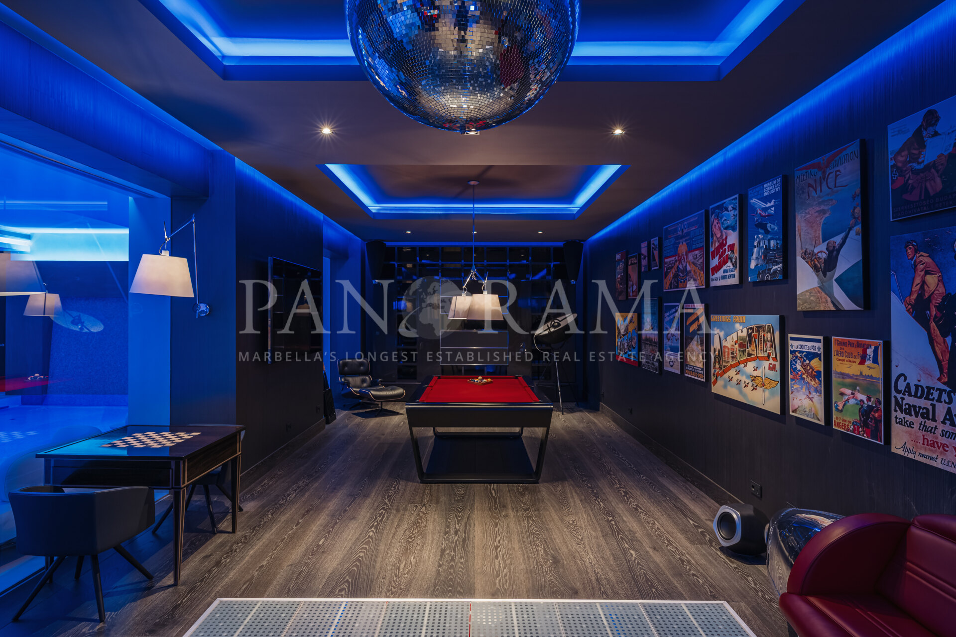 The basement and semi-basement levels feature entertainment areas, including a private cinema room, a games room, and a spa with a gym, heated indoor pool, jacuzzi, sauna, and Turkish bath. Additionally, it has an independent apartment for guests or staff, with two bedrooms, a bathroom, a living room, and a kitchen, as well as a garage with capacity for six cars.
