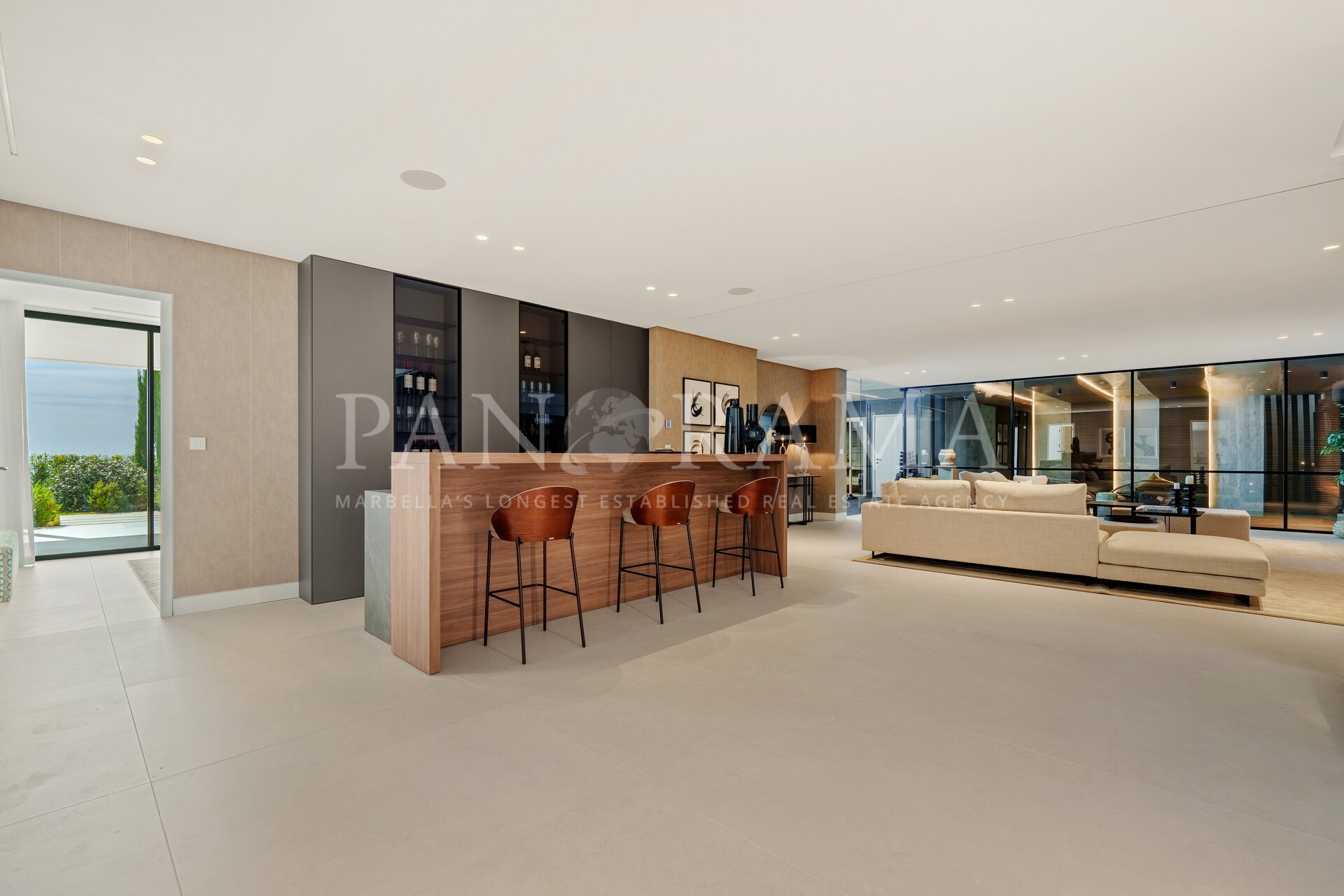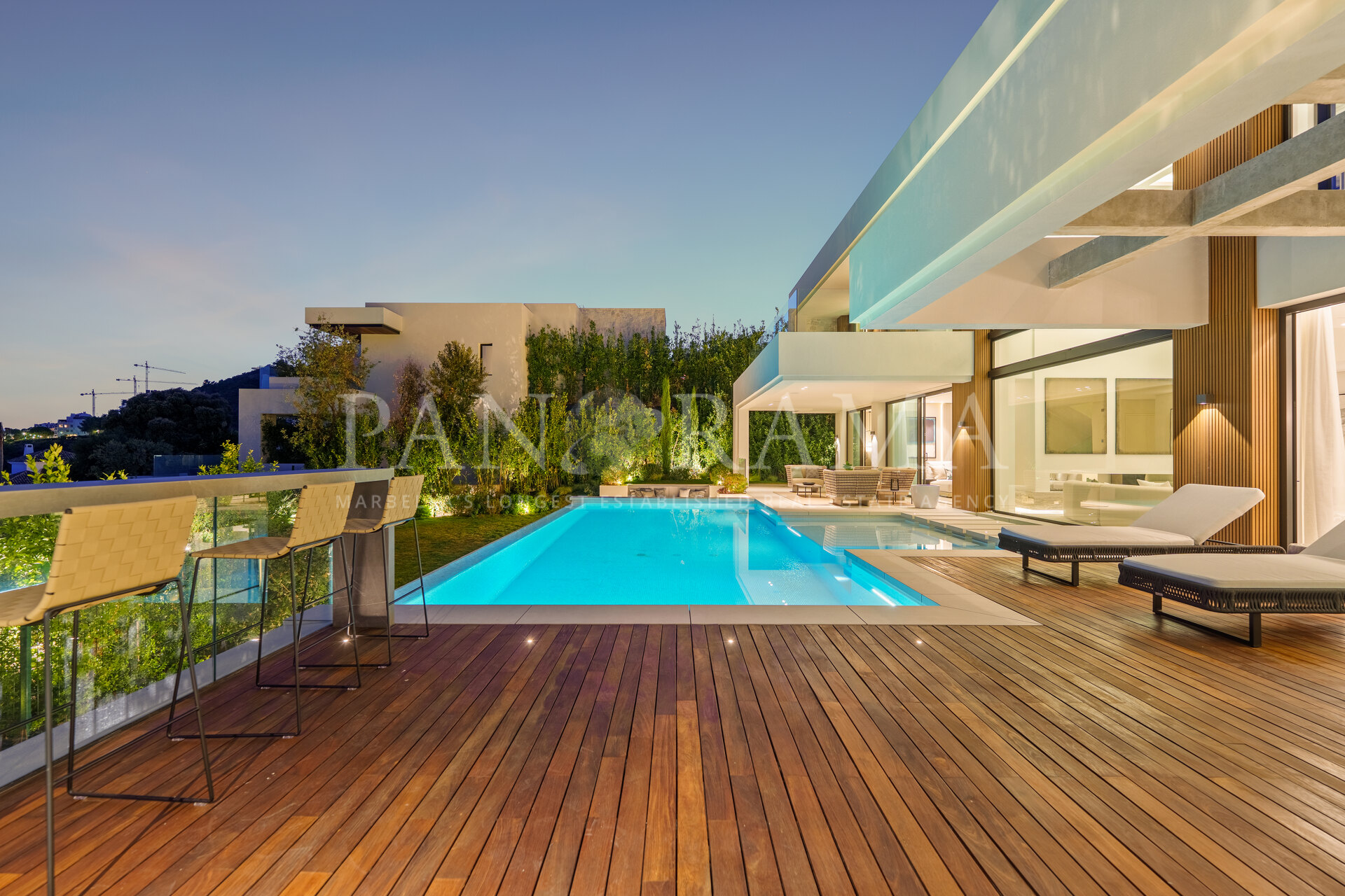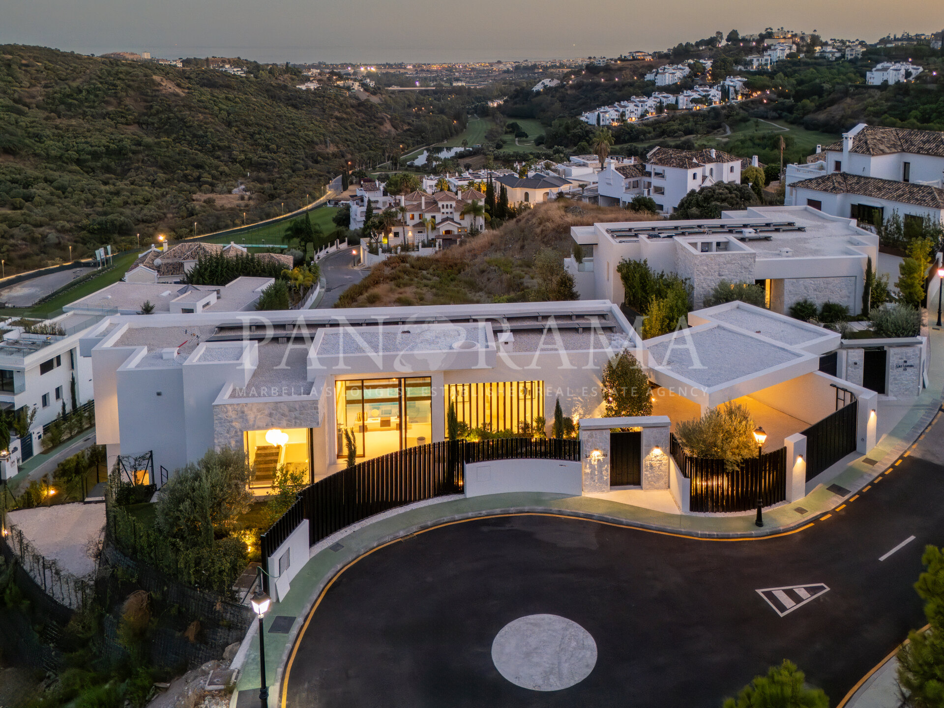 This exceptional six-bedroom contemporary villa is located within the prestigious gated community of Lomas de La Quinta, Benahavís. Set on a generous 1,579 m² plot, the property combines modern design, luxurious comfort, and complete privacy in an elevated position that captures stunning panoramic views of the Mediterranean Sea and the surrounding mountains. The architecture is both elegant and functional, designed with clean lines and expansive glass surfaces that maximise light and showcase the beauty of its natural surroundings.