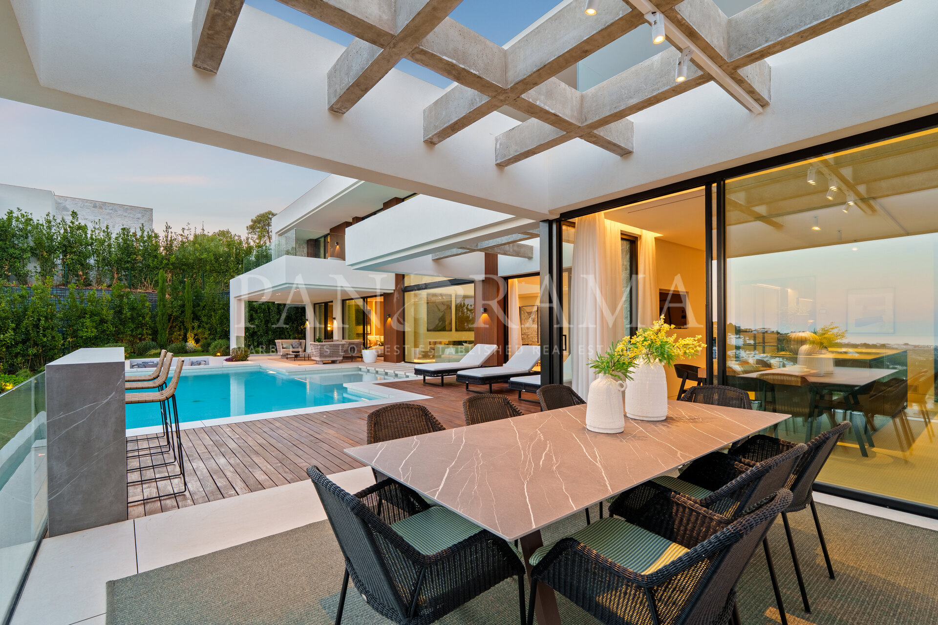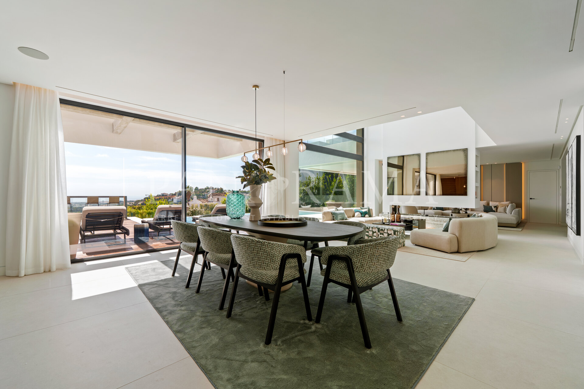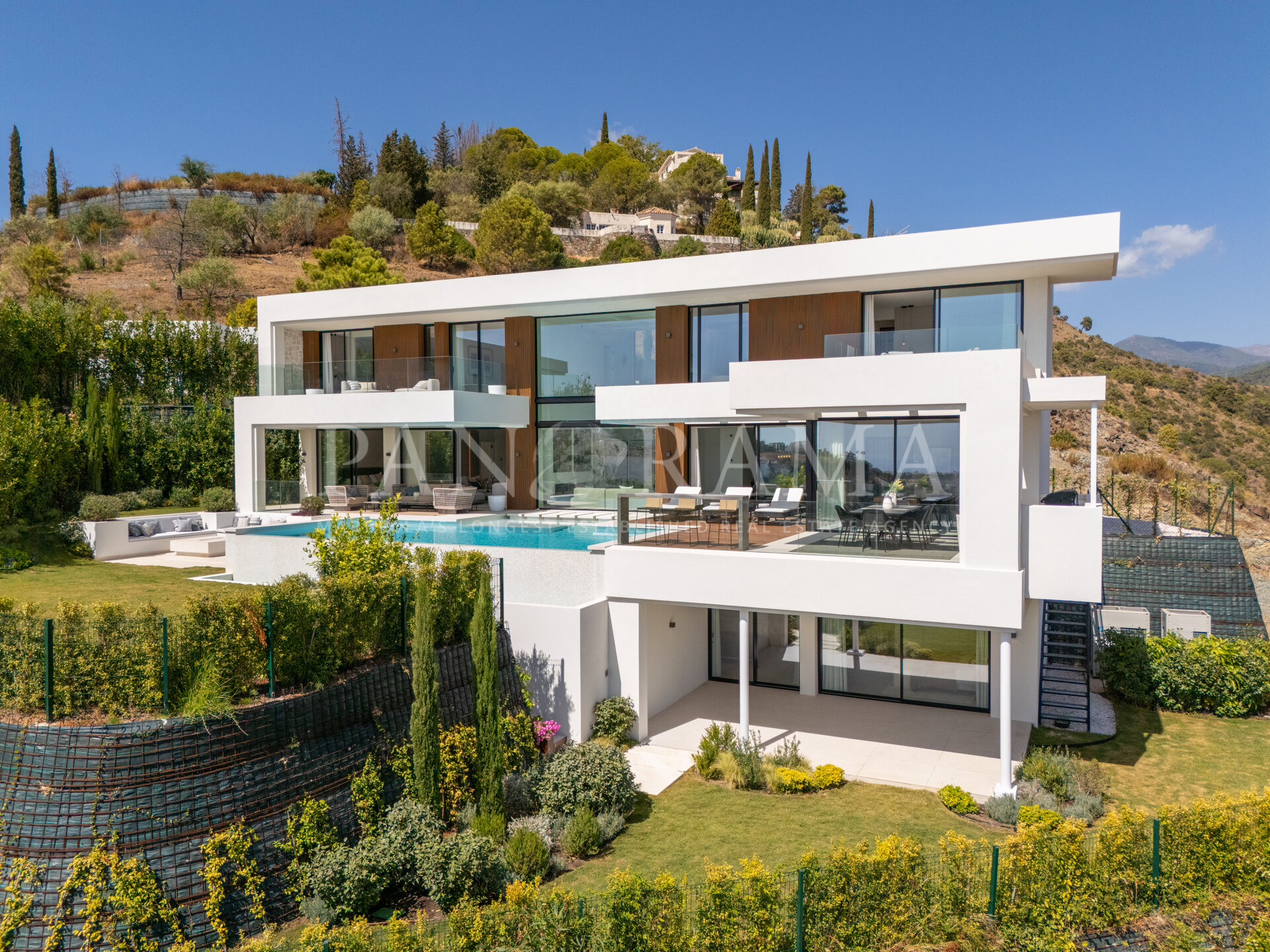 This exceptional six-bedroom contemporary villa is located within the prestigious gated community of Lomas de La Quinta, Benahavís. Set on a generous 1,579 m² plot, the property combines modern design, luxurious comfort, and complete privacy in an elevated position that captures stunning panoramic views of the Mediterranean Sea and the surrounding mountains. The architecture is both elegant and functional, designed with clean lines and expansive glass surfaces that maximise light and showcase the beauty of its natural surroundings.
