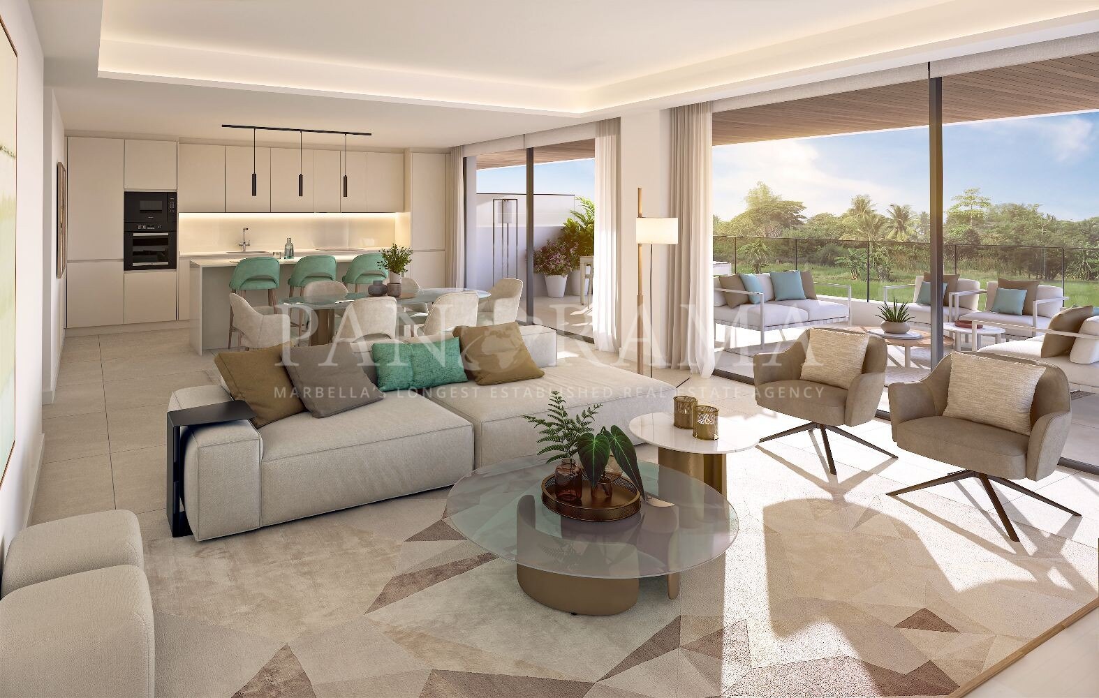 The sleek, modern kitchen is fitted with premium appliances and high-quality cabinetry, thoughtfully integrated into the open-plan layout to create a seamless flow between cooking, dining, and relaxing spaces. Elegant finishes throughout the home, including stone flooring, minimalist lighting, and sophisticated color tones, add to the overall sense of luxury and ease.