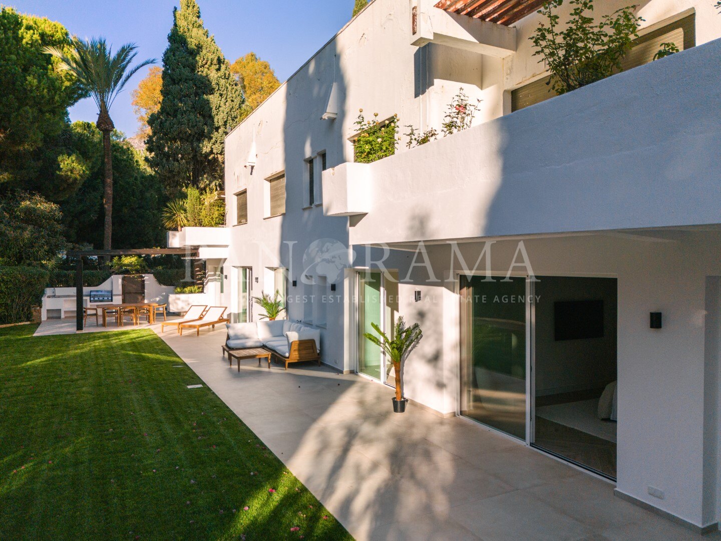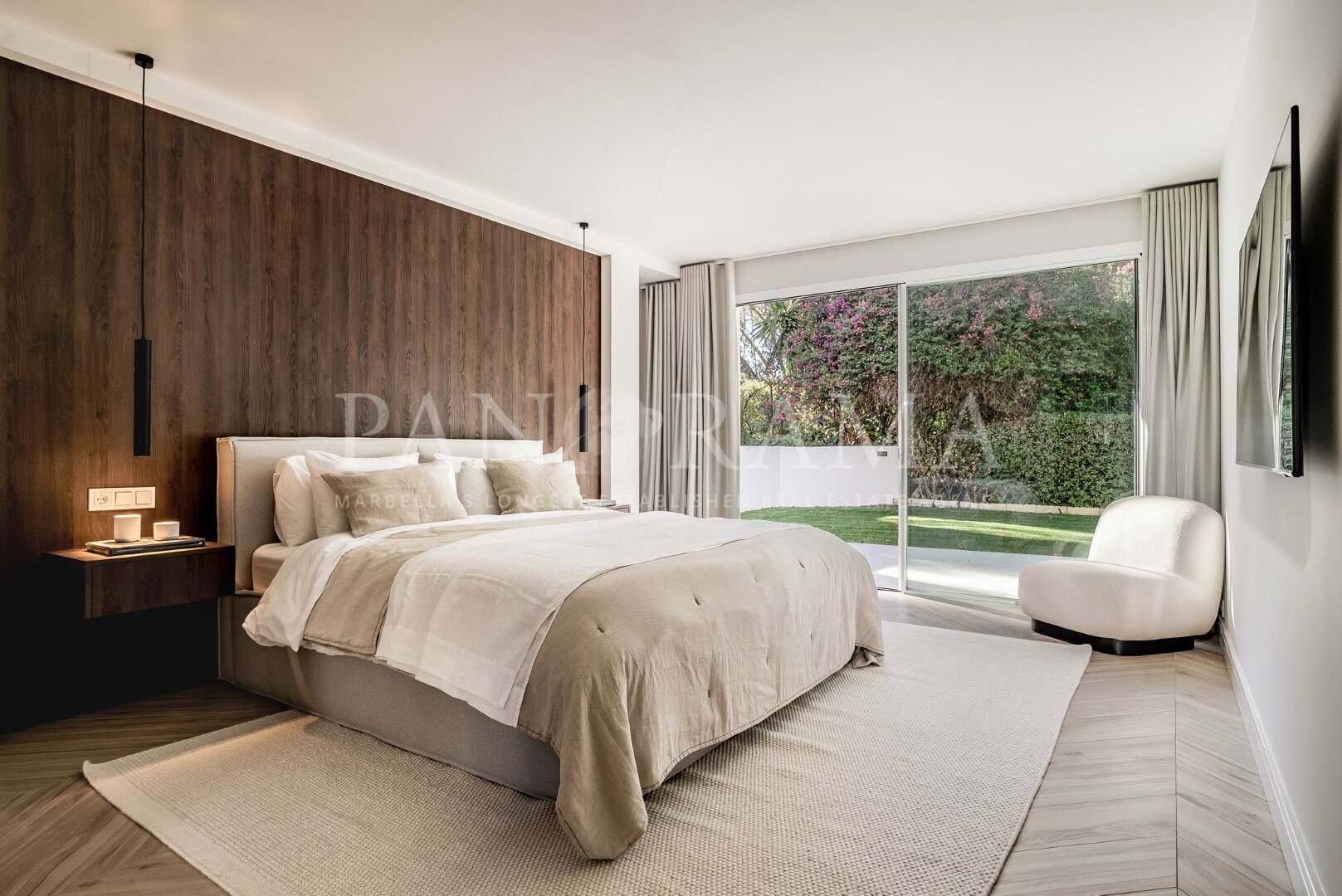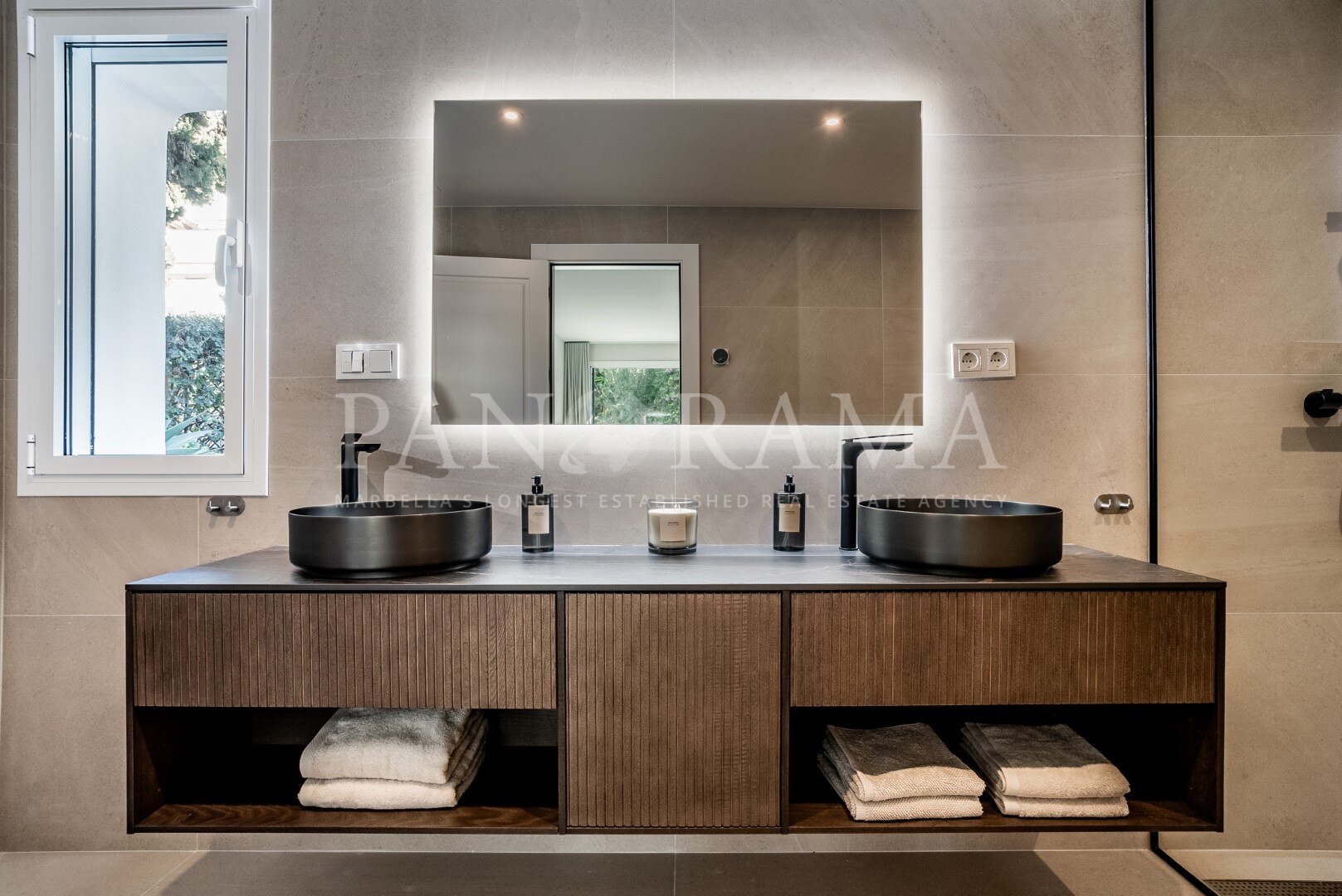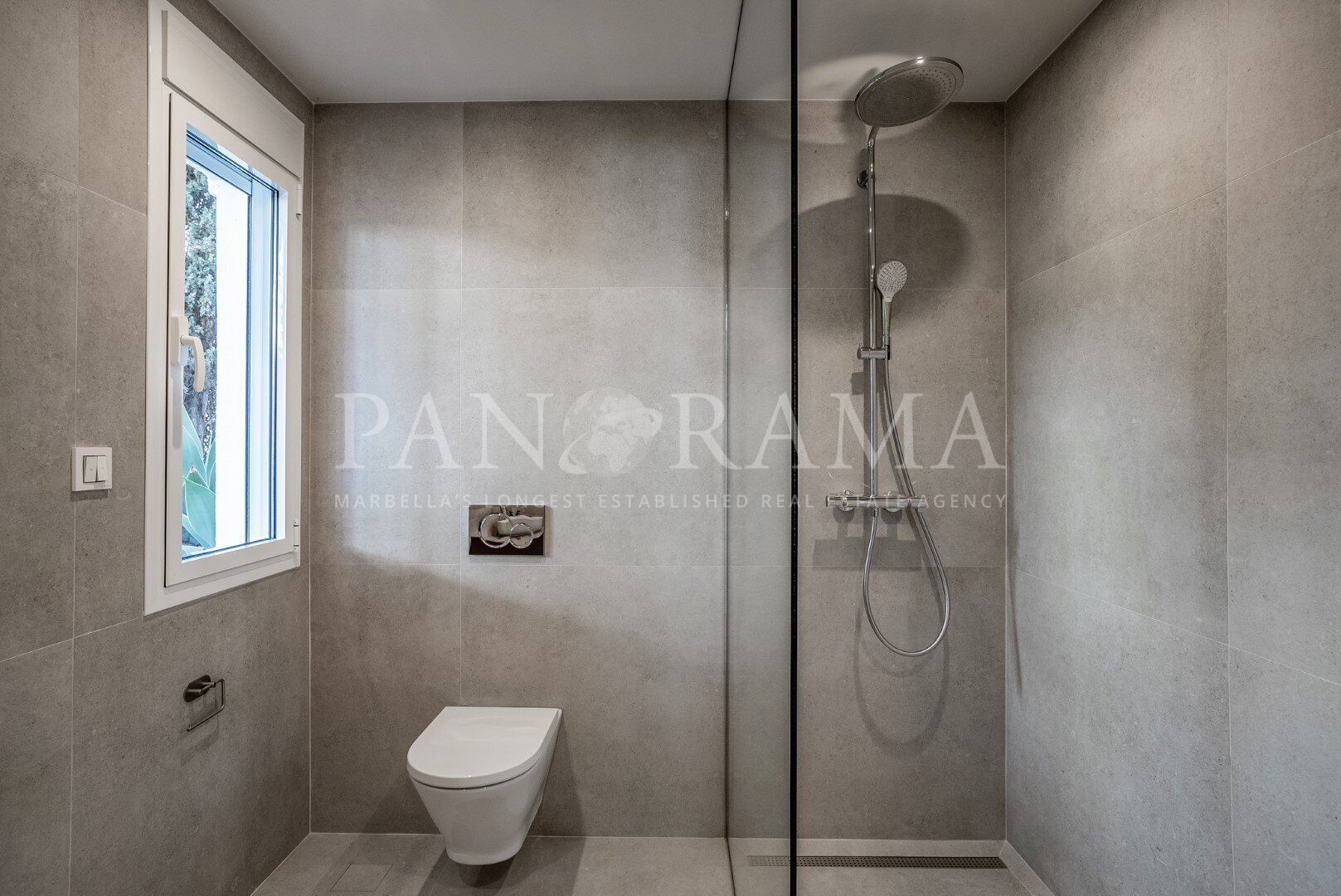 Upon entering the property, you are immediately welcomed into expansive social spaces. The open-plan design allows the living room, kitchen, and dining area to flow effortlessly together, making it the perfect setting for entertaining or simply enjoying daily life in a serene, elegant environment. The use of large floor-to-ceiling windows enhances the sense of space and light, while also establishing a seamless connection between the interior and the lush garden beyond. This indoor-outdoor atmosphere defines the home, creating a tranquil retreat in the heart of Marbella.