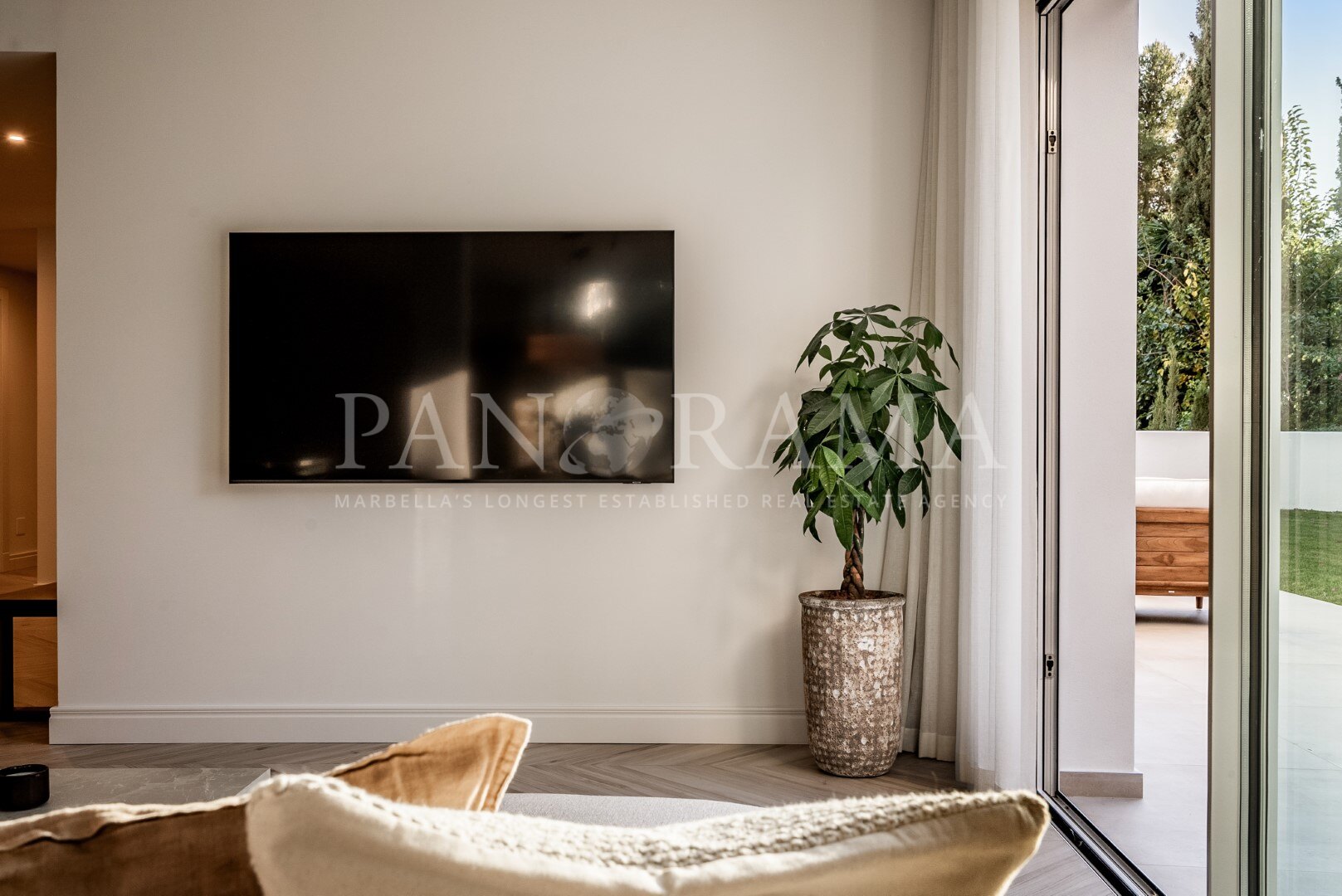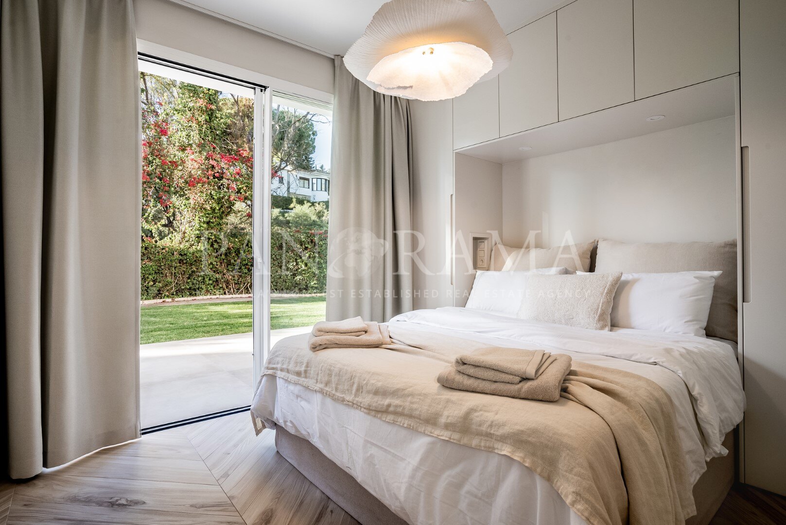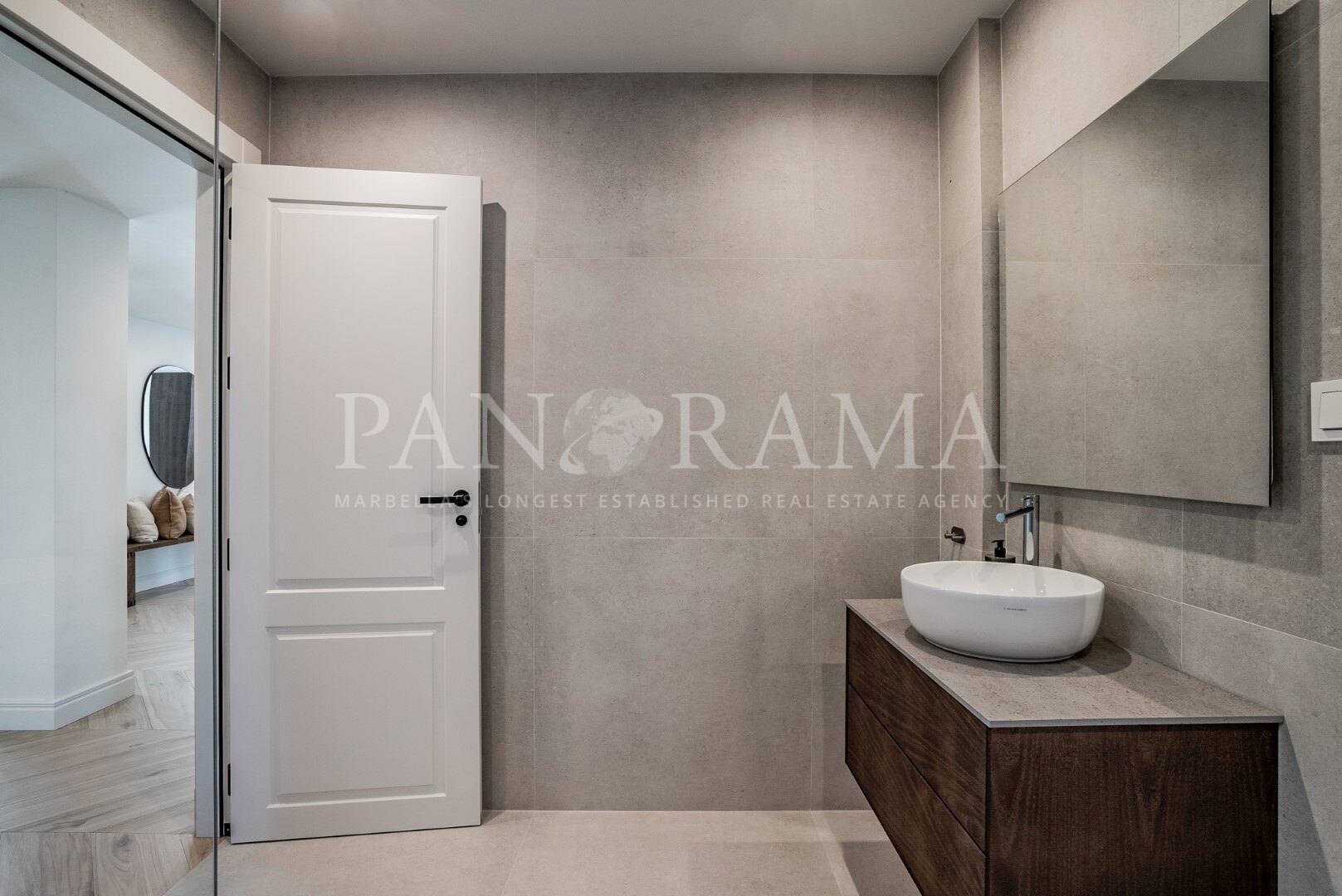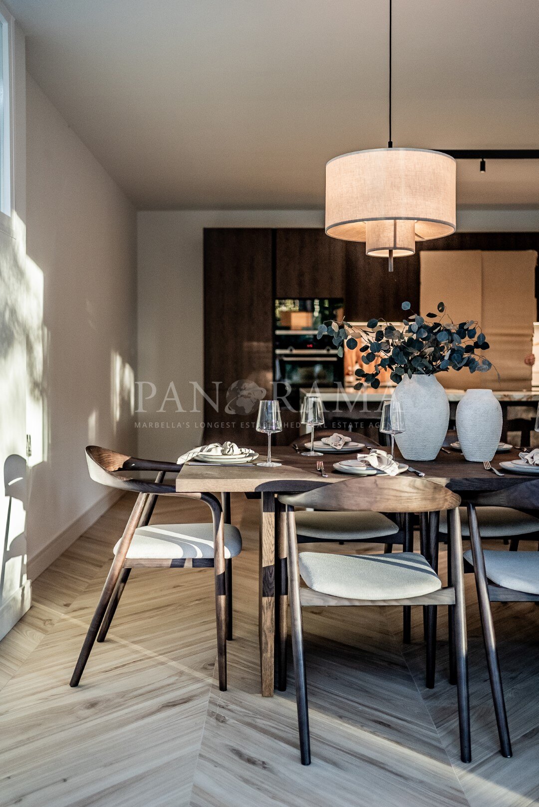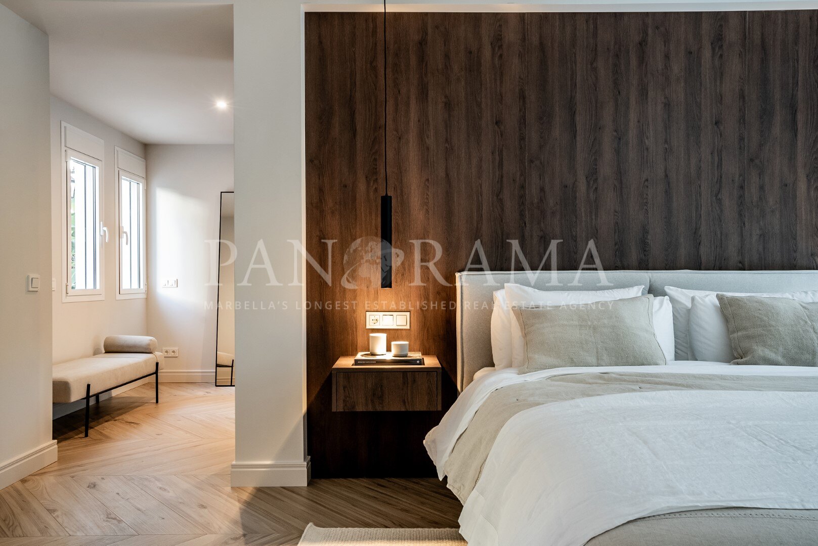 Exceptional, fully renovated duplex ground floor apartment, ideally located within the prestigious Kings Hill complex on Marbella’s coveted Golden Mile. Combining refined elegance with the comforts of modern living, this one-of-a-kind residence offers a rare blend of apartment convenience and villa-style outdoor living.