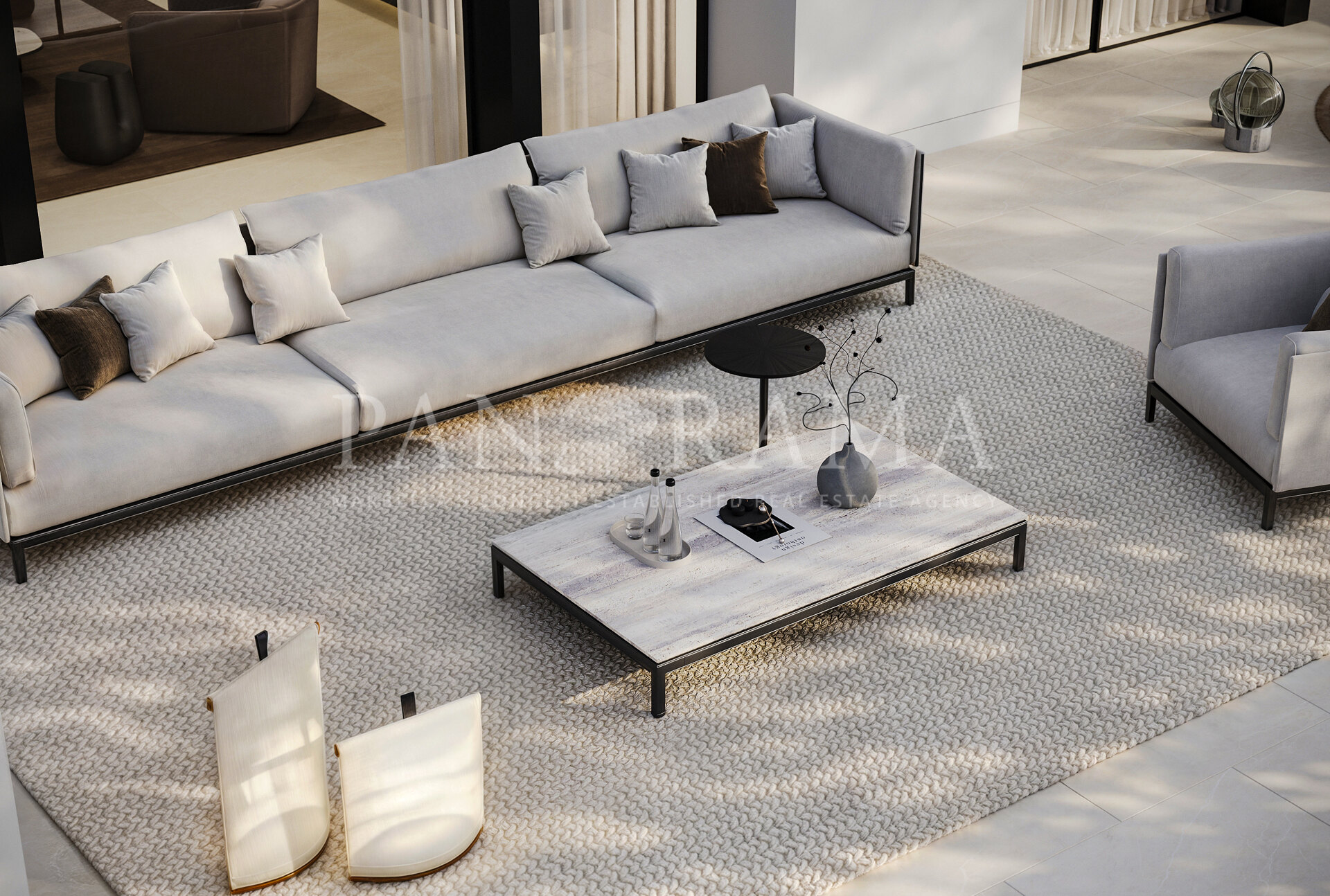 Designed by the acclaimed Tobal Arquitectos, the villa showcases impeccable craftsmanship and a modern aesthetic. High ceilings and open layouts create an airy, light-filled ambiance, while the villa’s elevated position offers stunning views of the Mediterranean Sea and surrounding mountains.