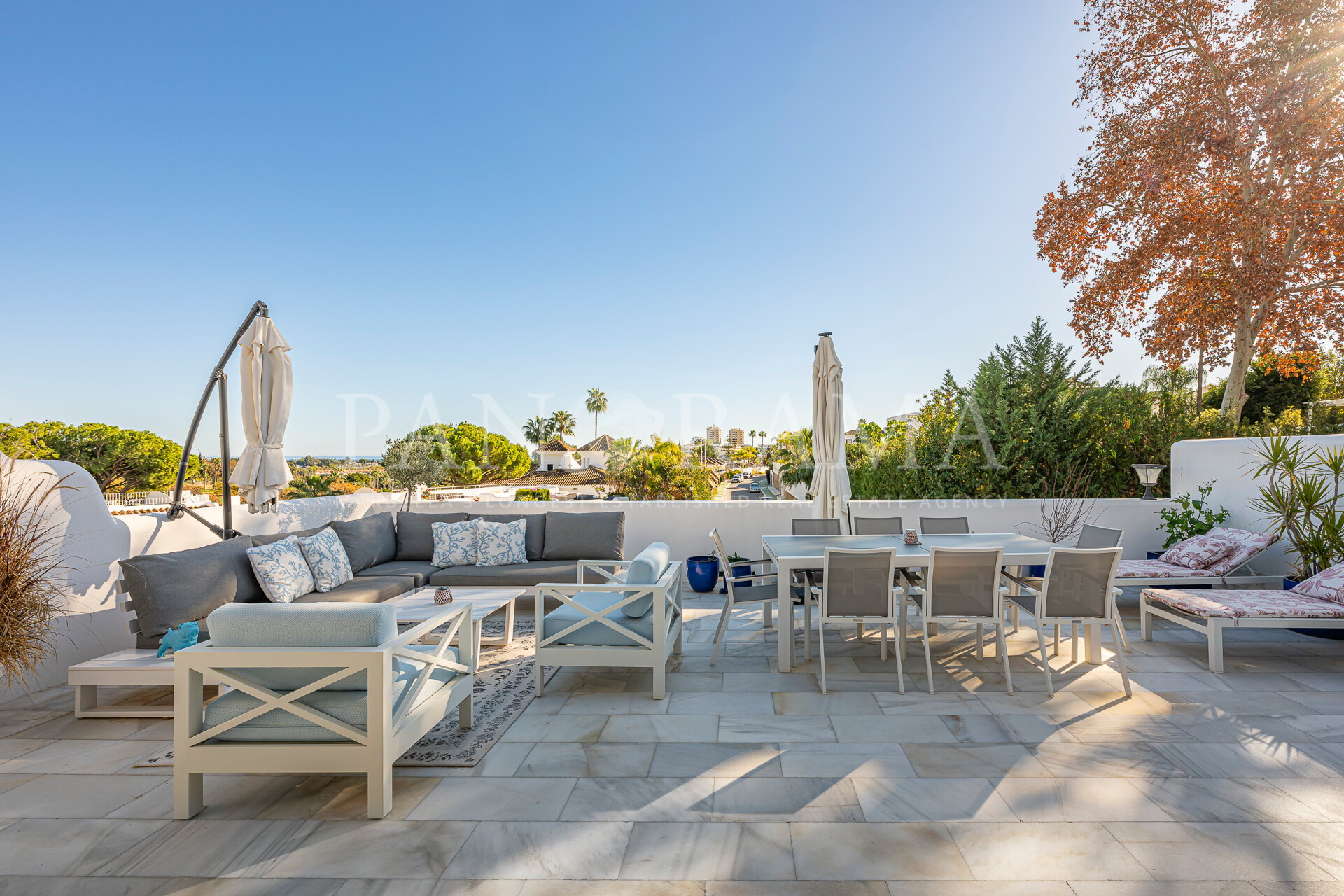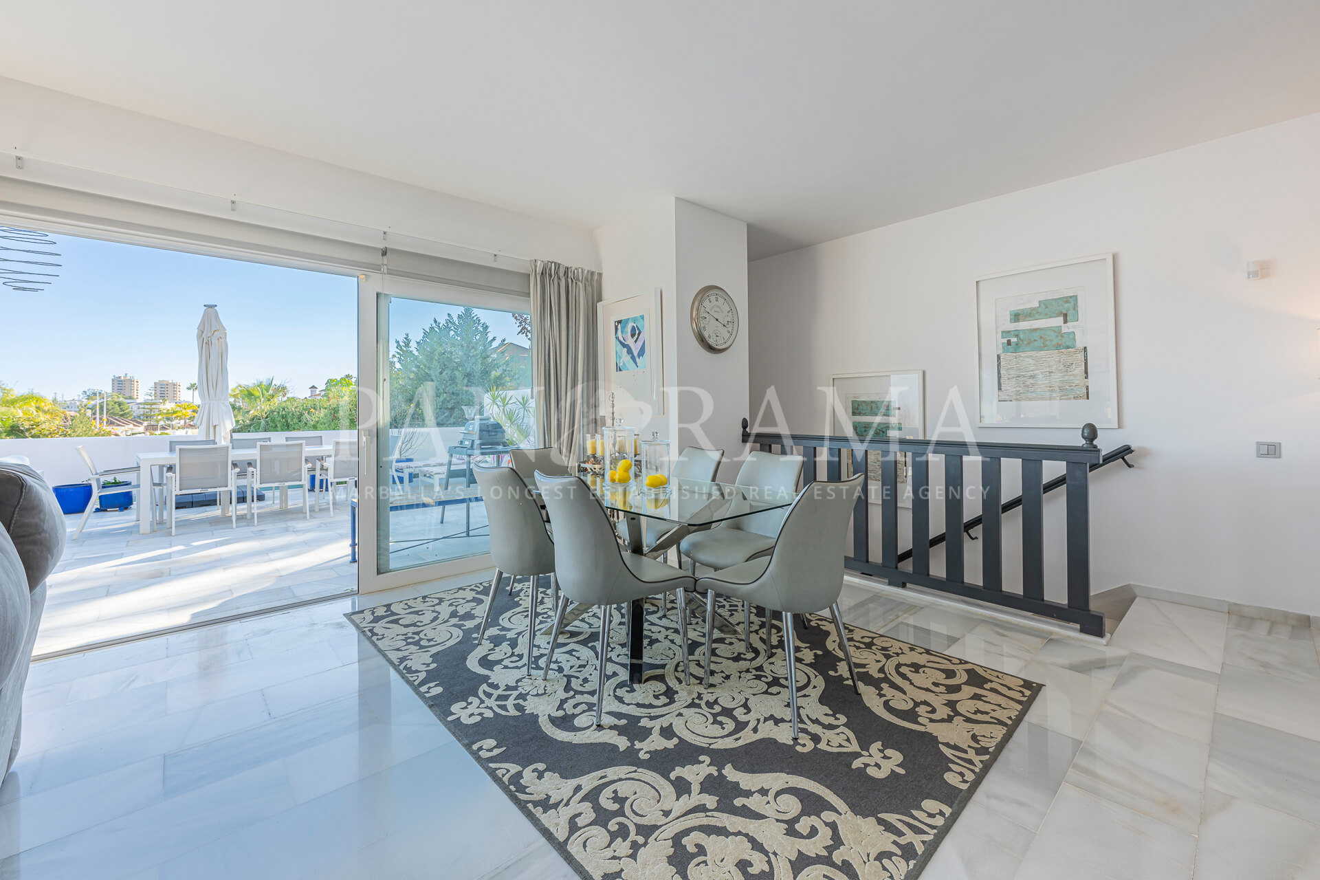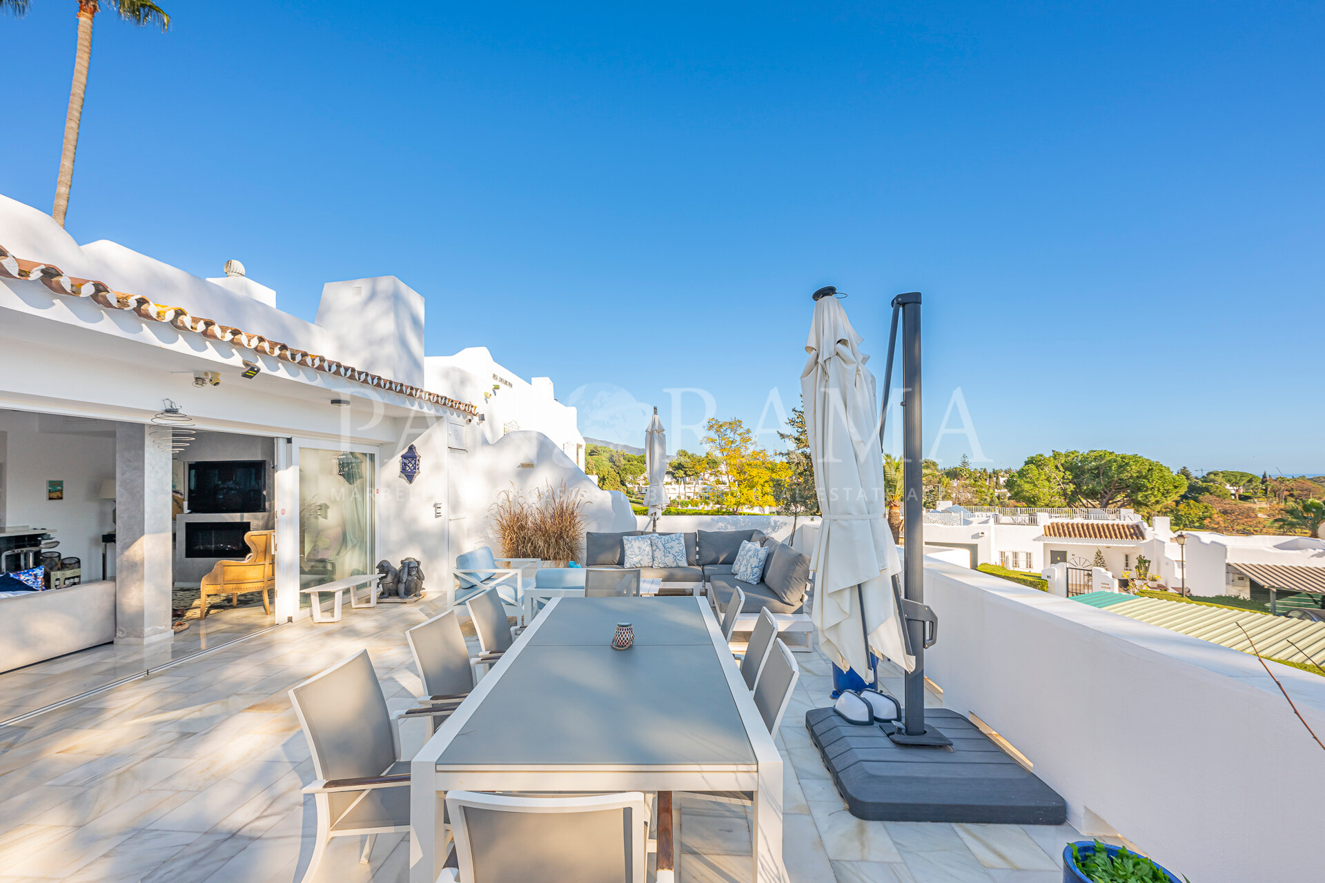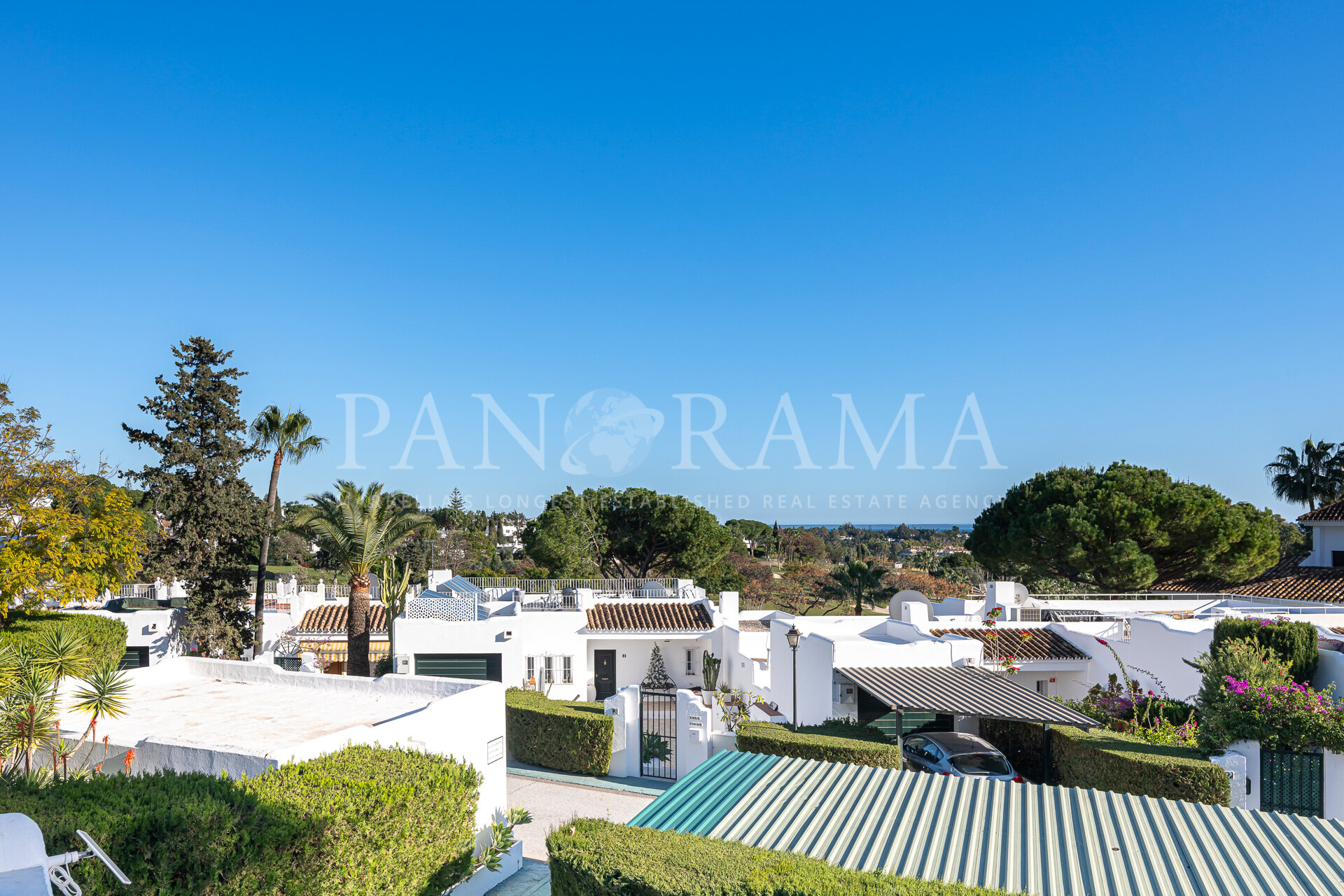 Spectacular corner townhouse, located in an exclusive complex on the frontline of golf in the sought-after area of Nueva Andalucía, offers a unique opportunity to enjoy a luxurious lifestyle in one of the most desirable areas of the Costa del Sol. Its privileged location ensures easy access to all amenities, transport links, golf courses, shops, the city centre, and schools. Additionally, it stands out for its stunning views of the sea, mountains, and impeccably maintained communal gardens.