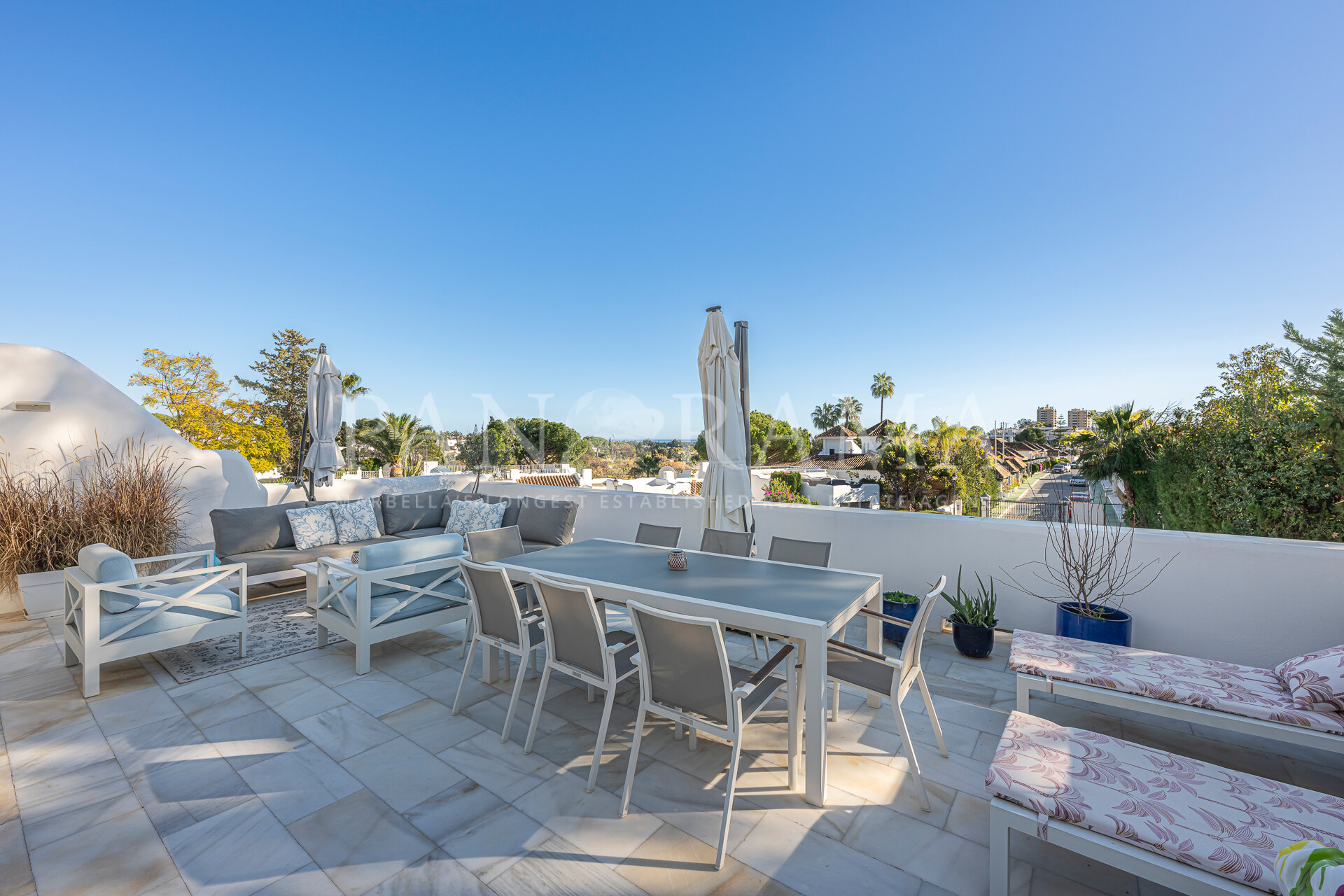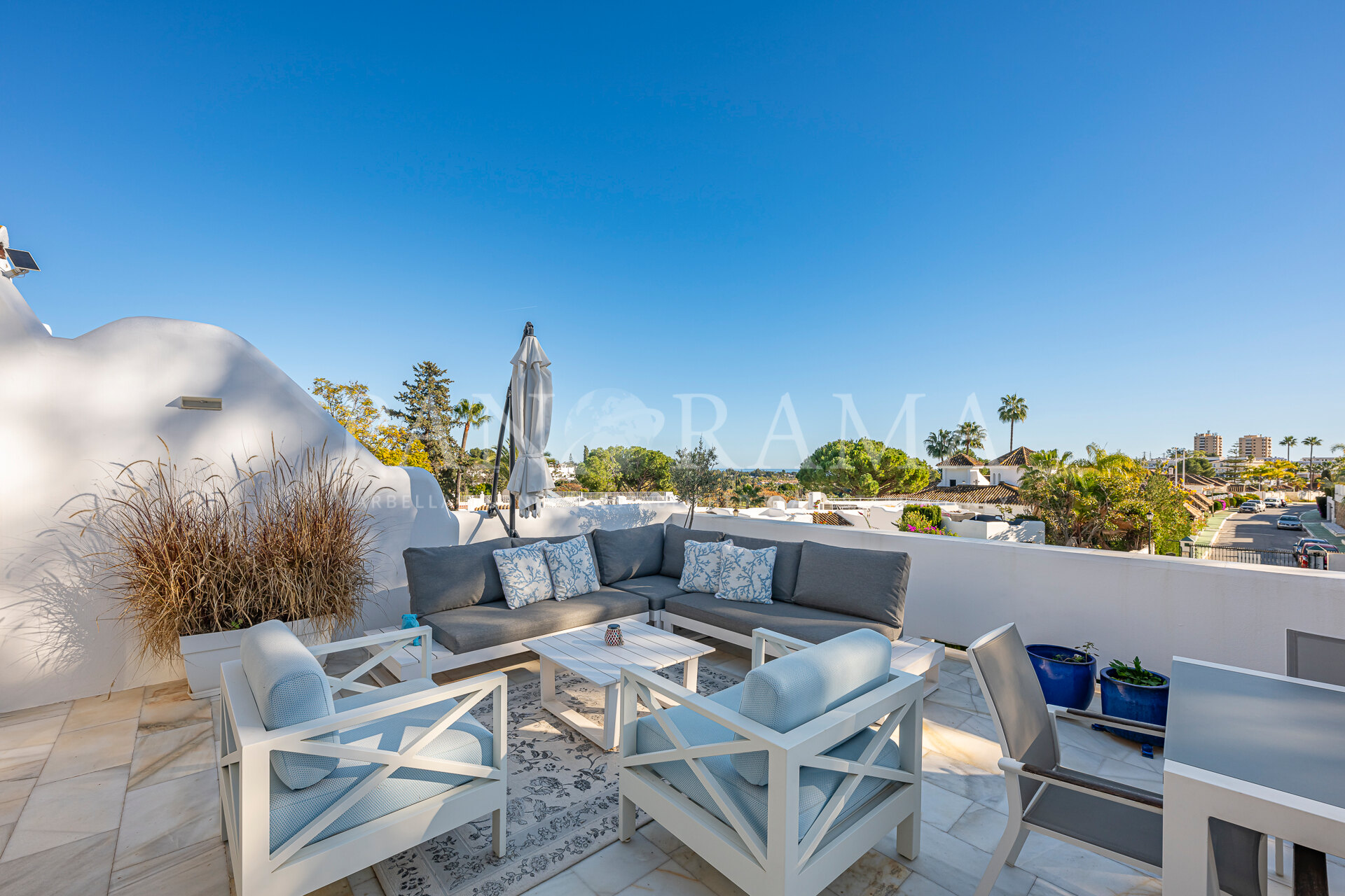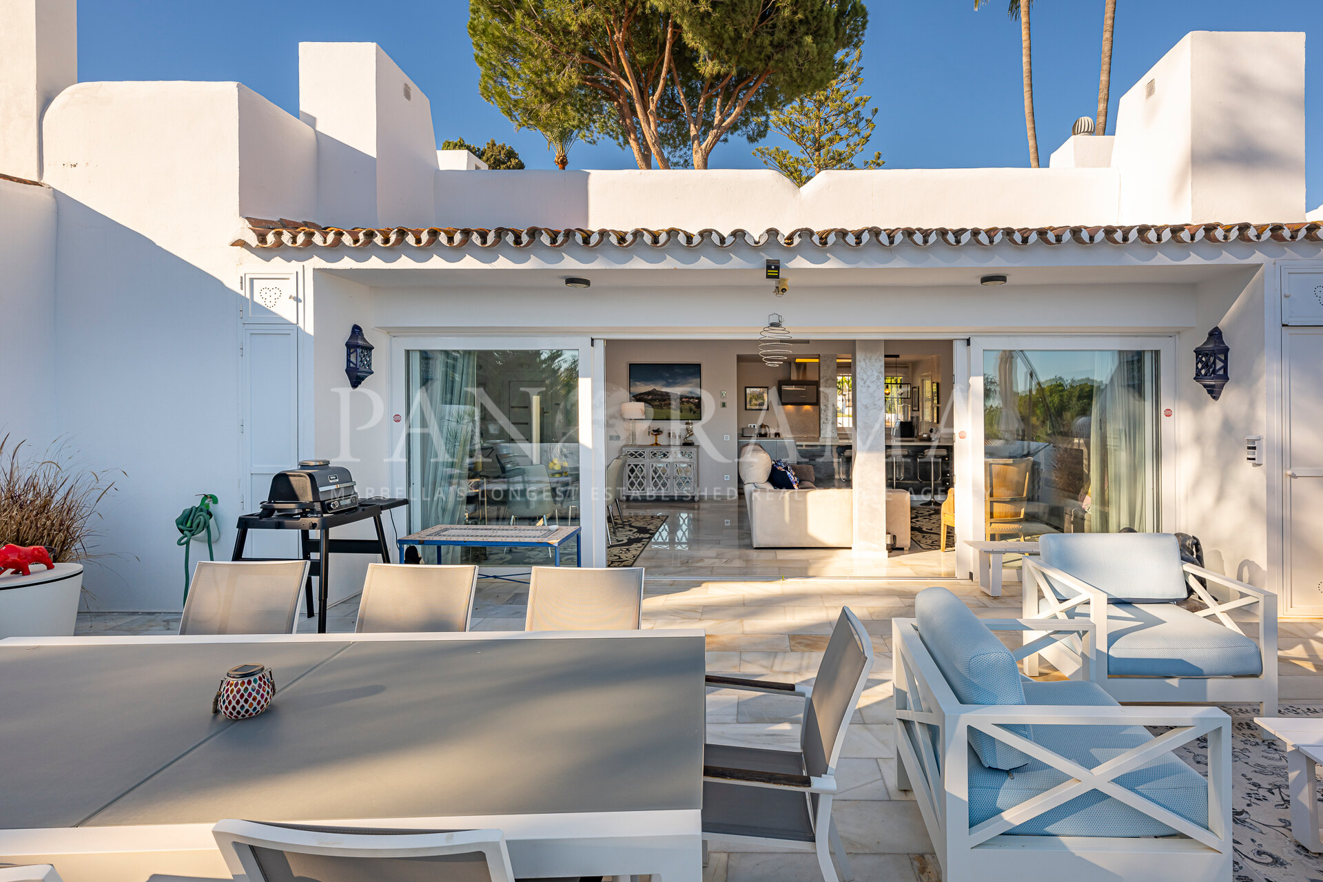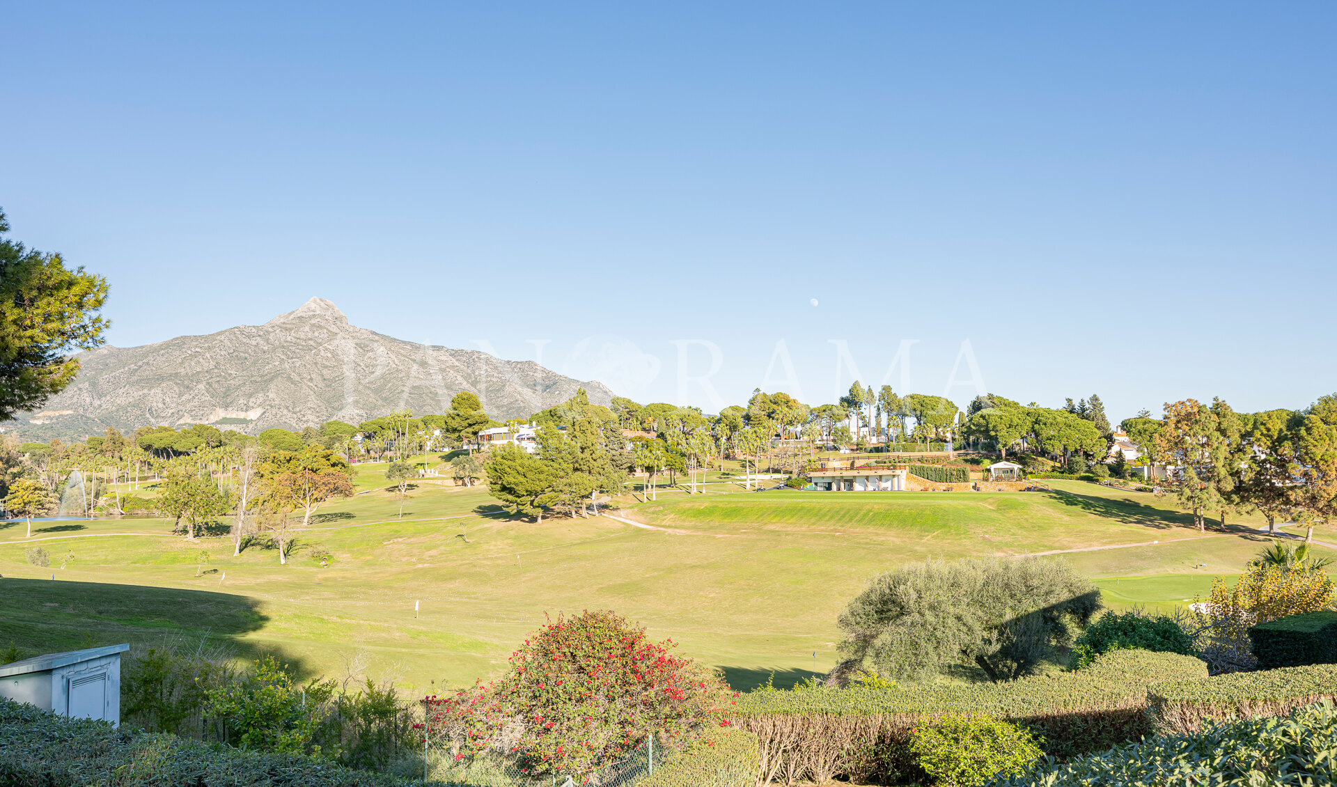 Spectacular corner townhouse, located in an exclusive complex on the frontline of golf in the sought-after area of Nueva Andalucía, offers a unique opportunity to enjoy a luxurious lifestyle in one of the most desirable areas of the Costa del Sol. Its privileged location ensures easy access to all amenities, transport links, golf courses, shops, the city centre, and schools. Additionally, it stands out for its stunning views of the sea, mountains, and impeccably maintained communal gardens.