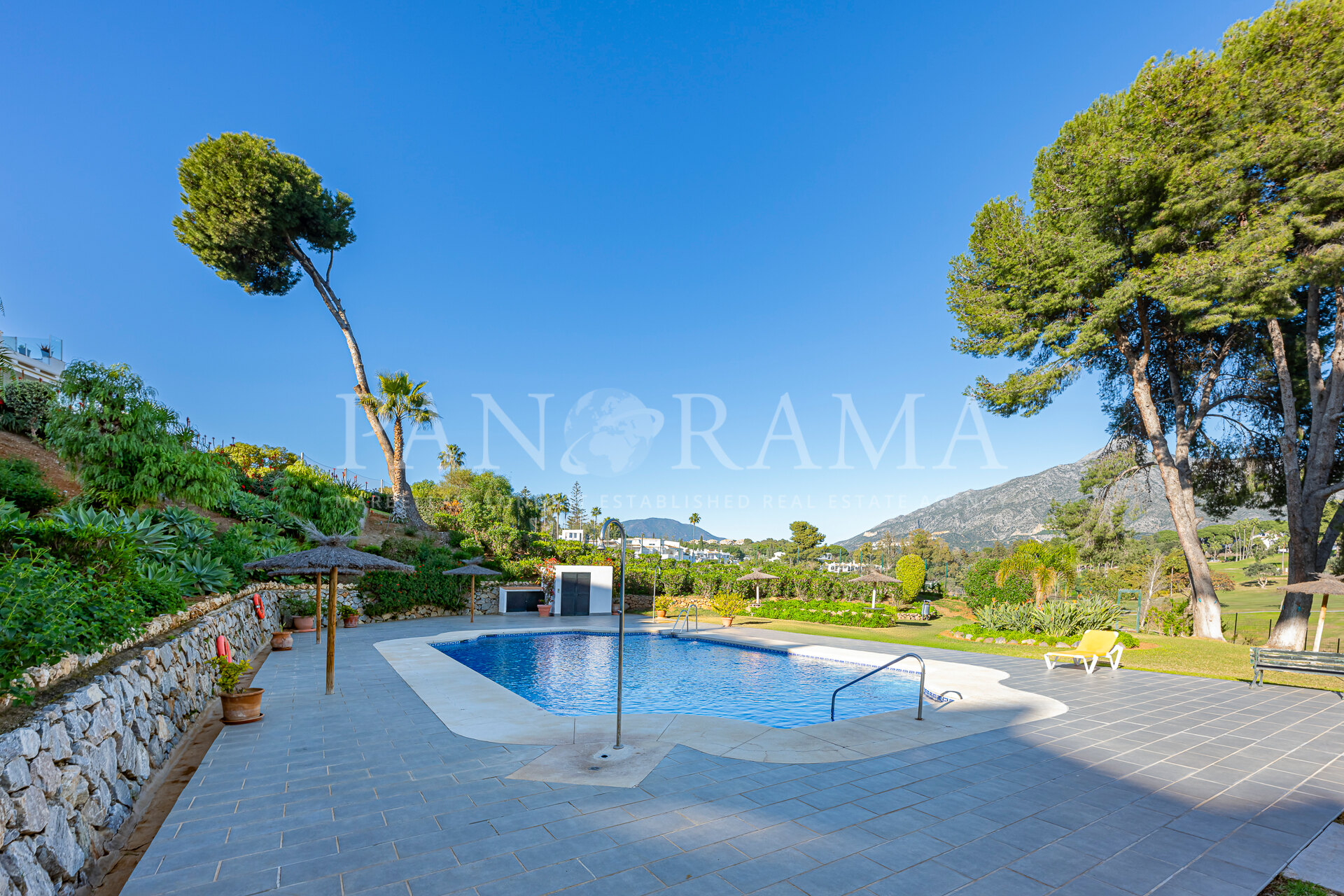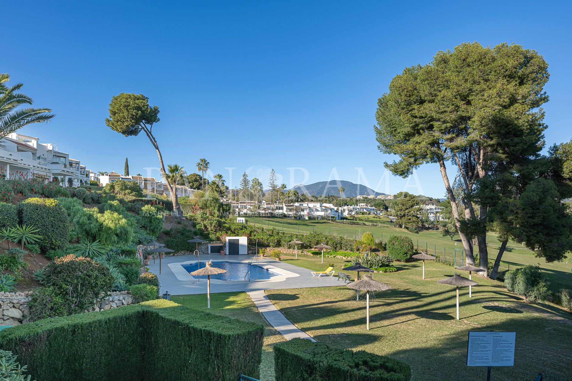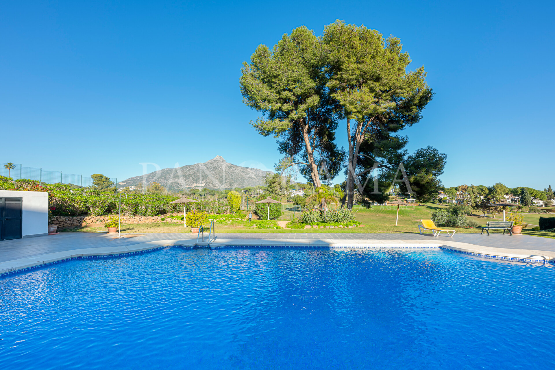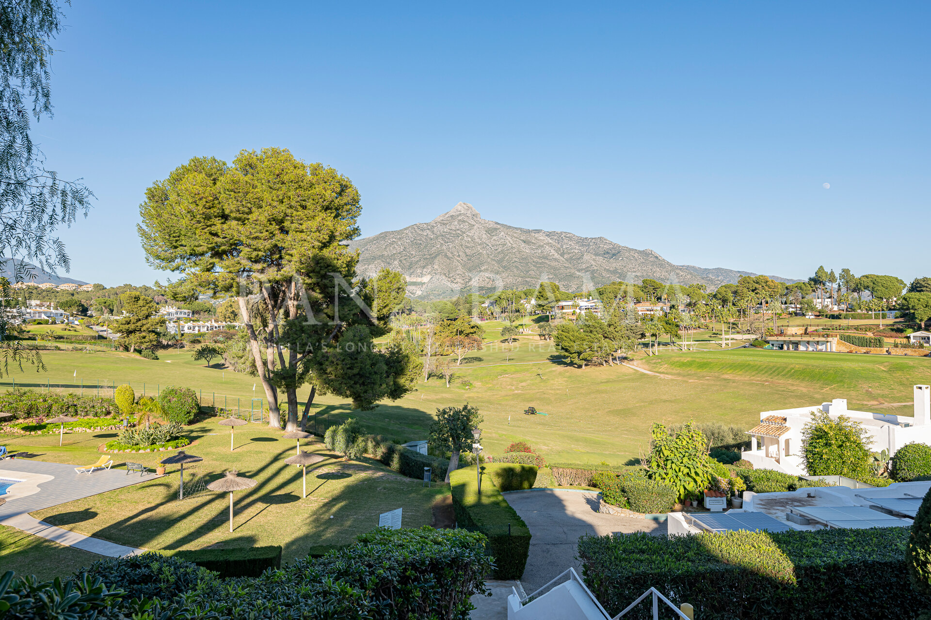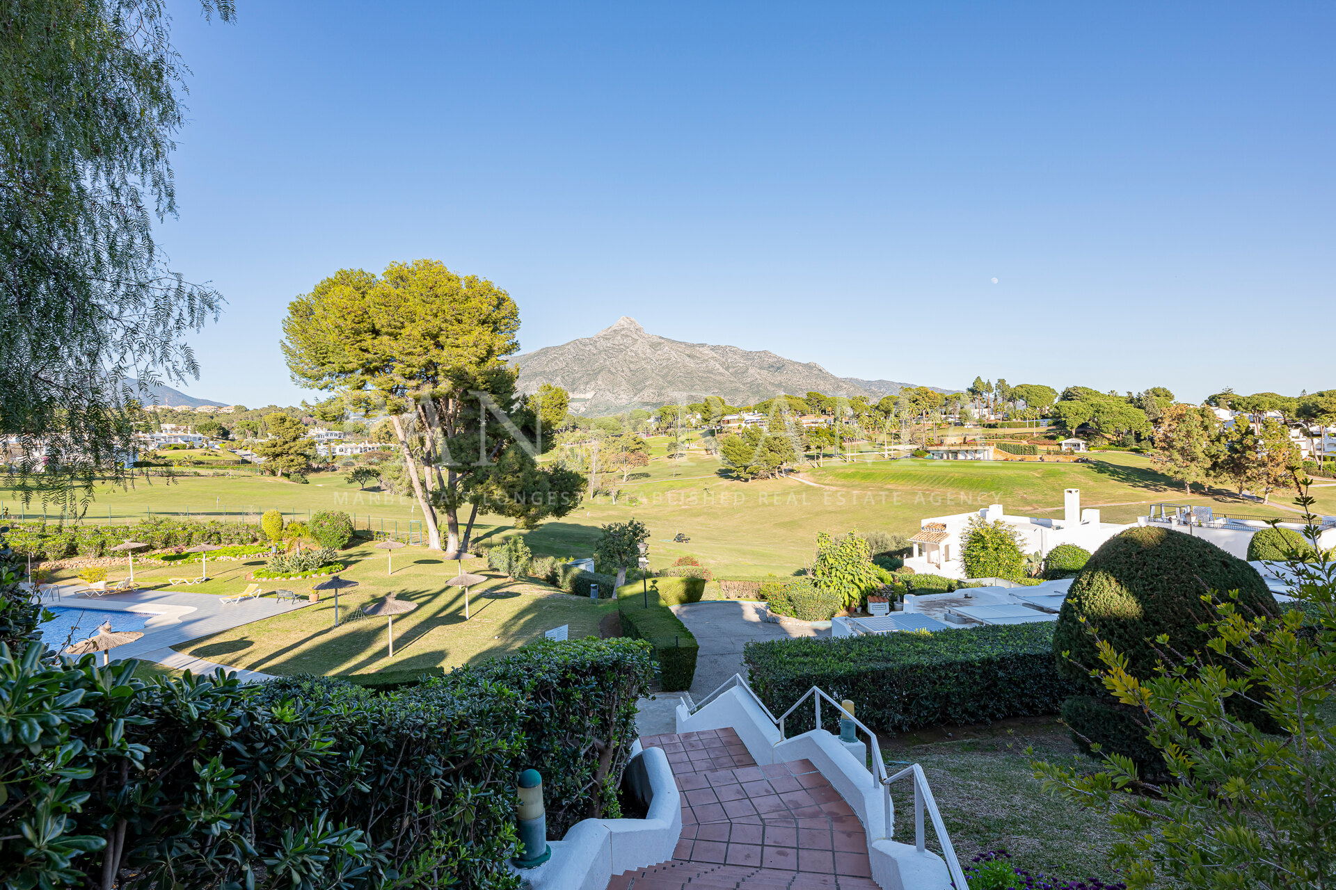 Spectacular corner townhouse, located in an exclusive complex on the frontline of golf in the sought-after area of Nueva Andalucía, offers a unique opportunity to enjoy a luxurious lifestyle in one of the most desirable areas of the Costa del Sol. Its privileged location ensures easy access to all amenities, transport links, golf courses, shops, the city centre, and schools. Additionally, it stands out for its stunning views of the sea, mountains, and impeccably maintained communal gardens.