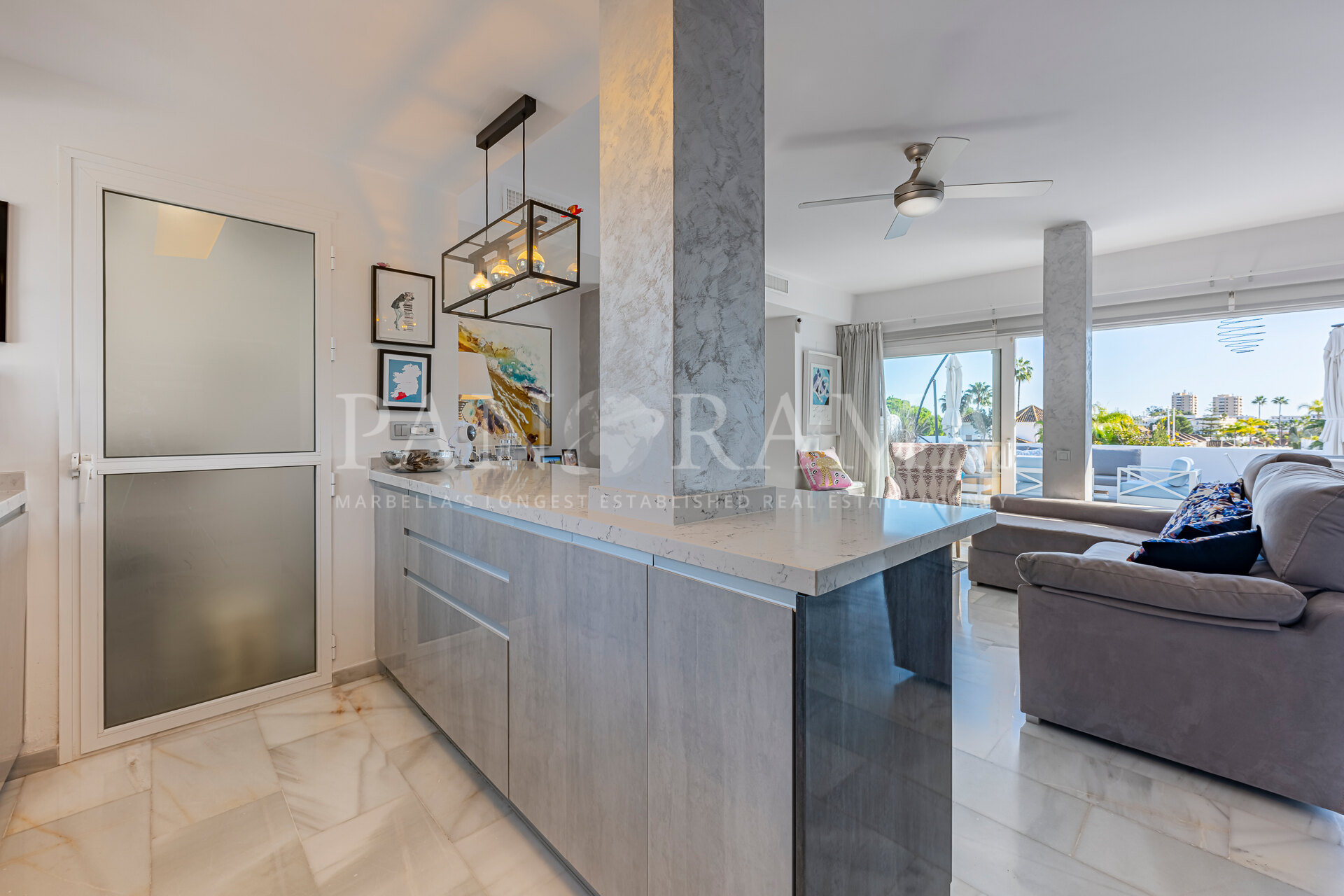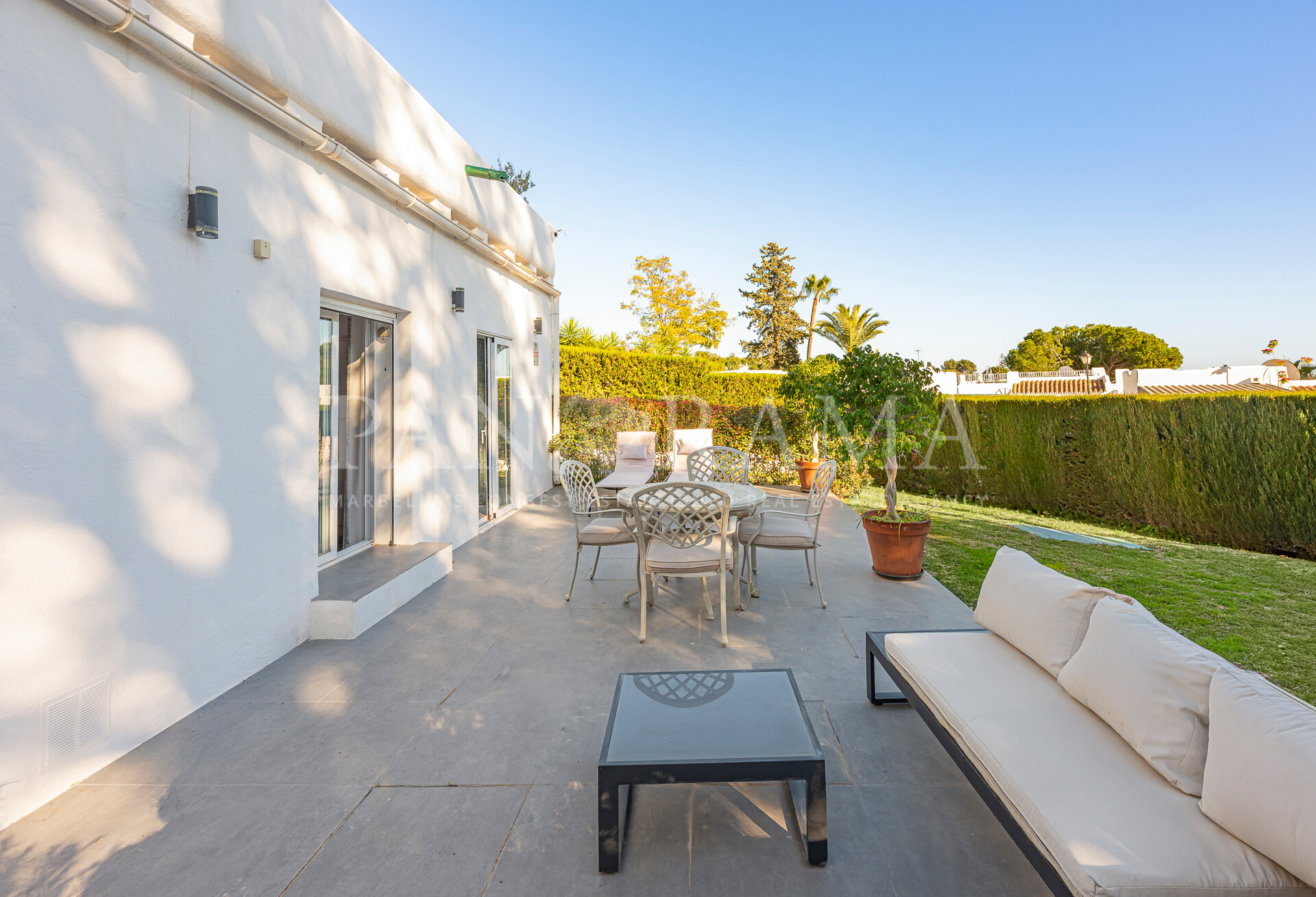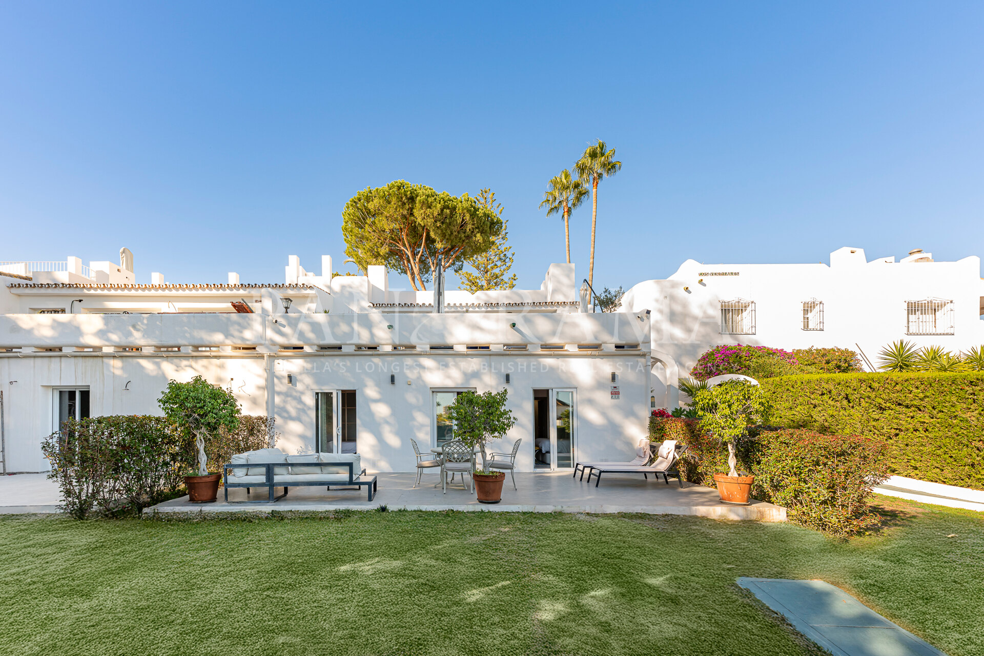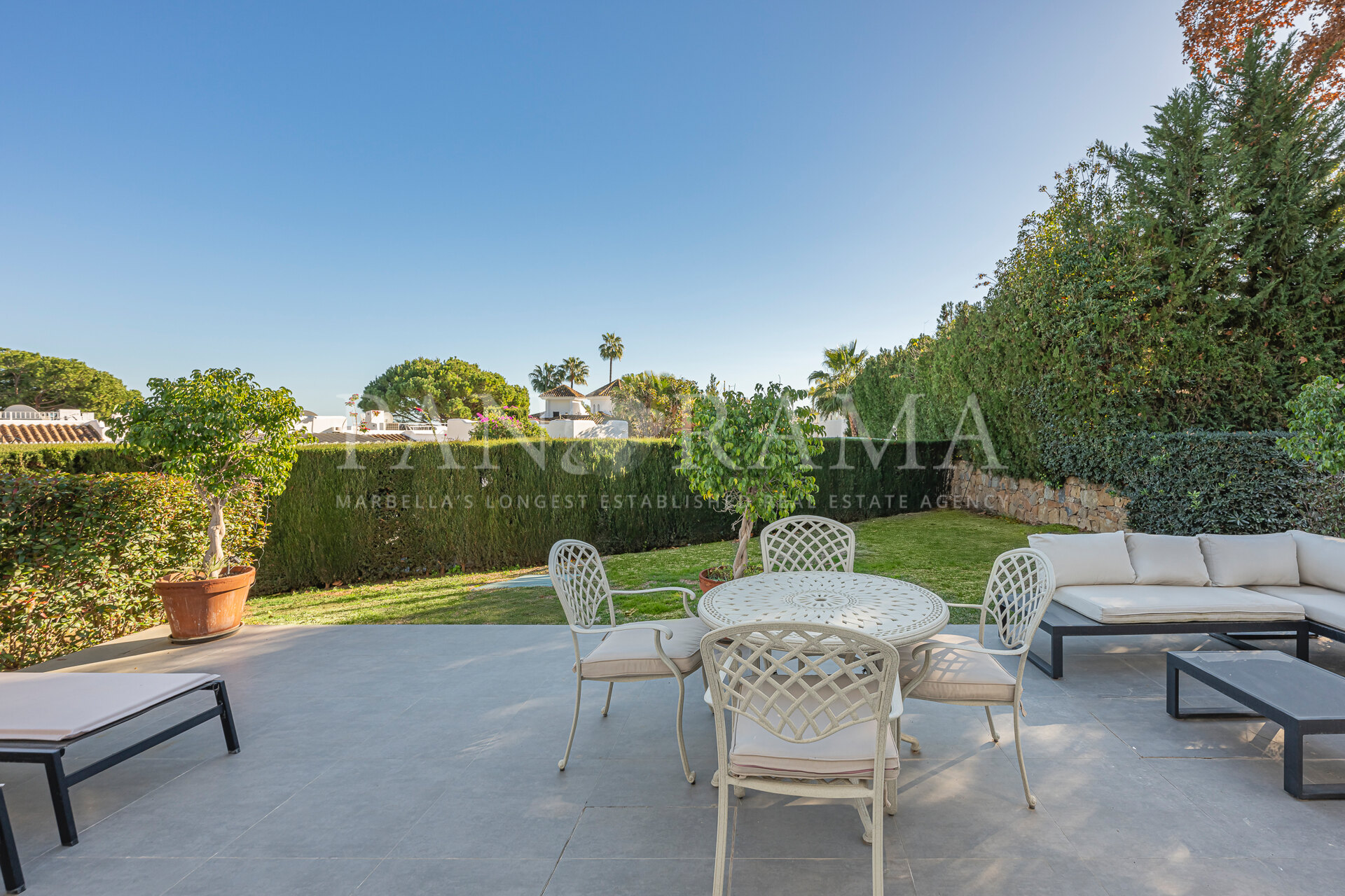 Spectacular corner townhouse, located in an exclusive complex on the frontline of golf in the sought-after area of Nueva Andalucía, offers a unique opportunity to enjoy a luxurious lifestyle in one of the most desirable areas of the Costa del Sol. Its privileged location ensures easy access to all amenities, transport links, golf courses, shops, the city centre, and schools. Additionally, it stands out for its stunning views of the sea, mountains, and impeccably maintained communal gardens.
