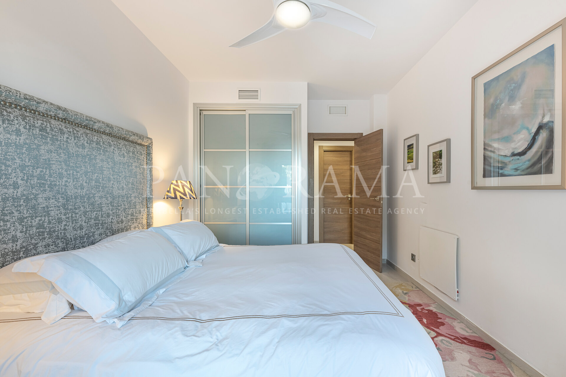 On the ground floor, there are three spacious bedrooms, all with direct access to the private terrace leading to the communal gardens. One of the bedrooms includes an en-suite bathroom, while the other two share an additional bathroom, providing comfort and practicality for the entire family.