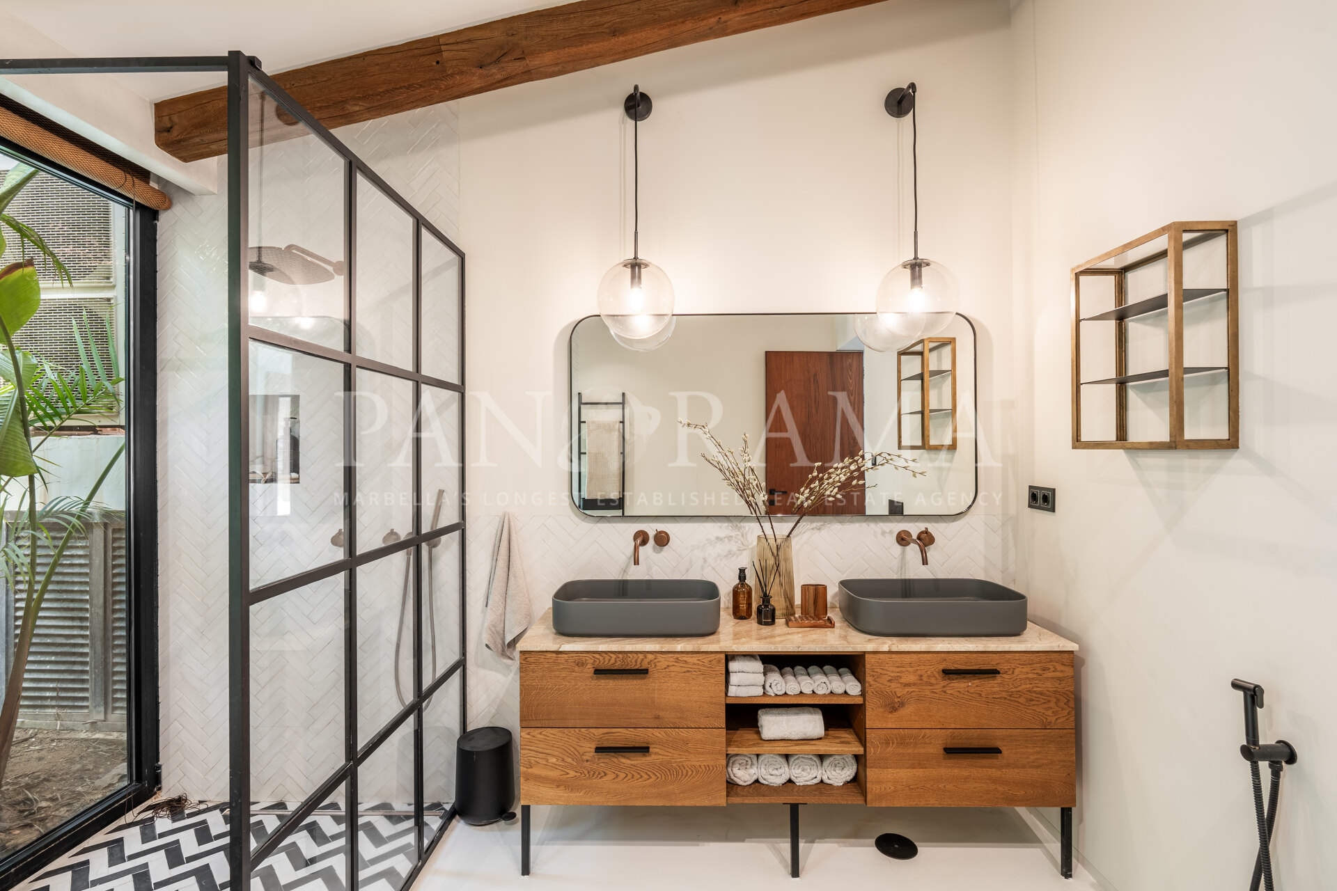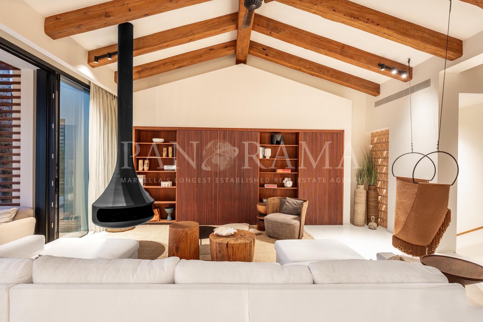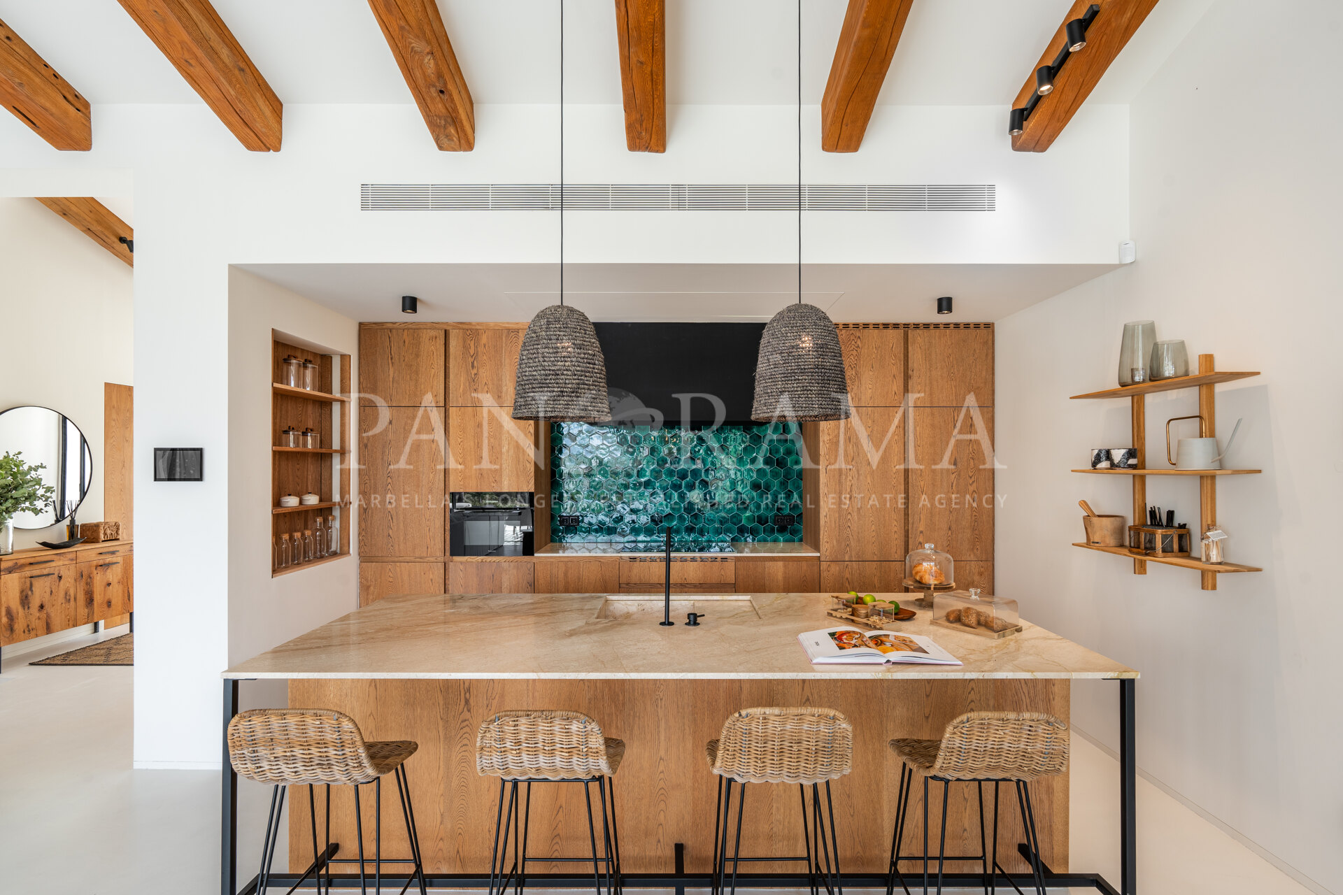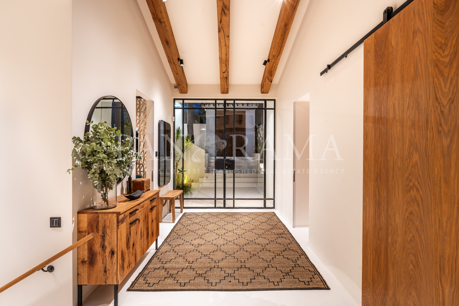 Nestled in the heart of Nueva Andalucía’s renowned Golf Valley, this villa occupies a prime location on the front line of one of the area’s top golf courses. Situated in a prestigious gated community, it offers a peaceful and private retreat, enveloped by lush greenery and a privacy wall. The villa exudes a unique blend of rustic charm and modern elegance, with spacious interiors that are both cozy and airy, thanks to its expansive windows and high ceilings. The design masterfully combines Andalusian character with contemporary style, incorporating high-quality materials and artistic touches.