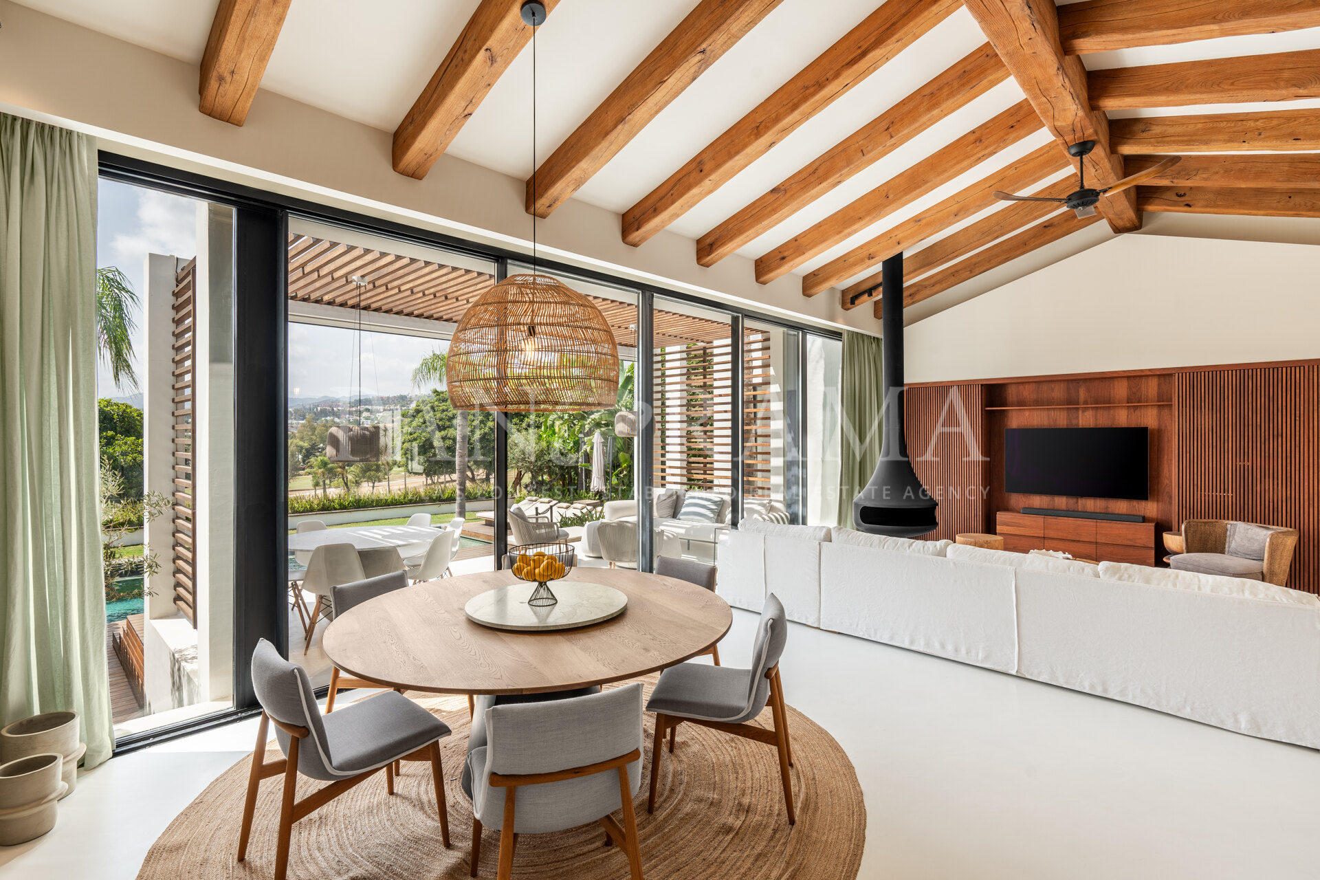 The entire villa is designed to maximize views of the mountains, the Los Naranjos golf course, and the beautiful surroundings. Large windows, many of which slide completely into the walls, create a seamless indoor-outdoor experience, allowing you to appreciate both the home’s interior and its natural landscape at once. This striking feature is evident from the moment you enter: the glass front door offers an immediate view of the golf course and the mountains beyond.
