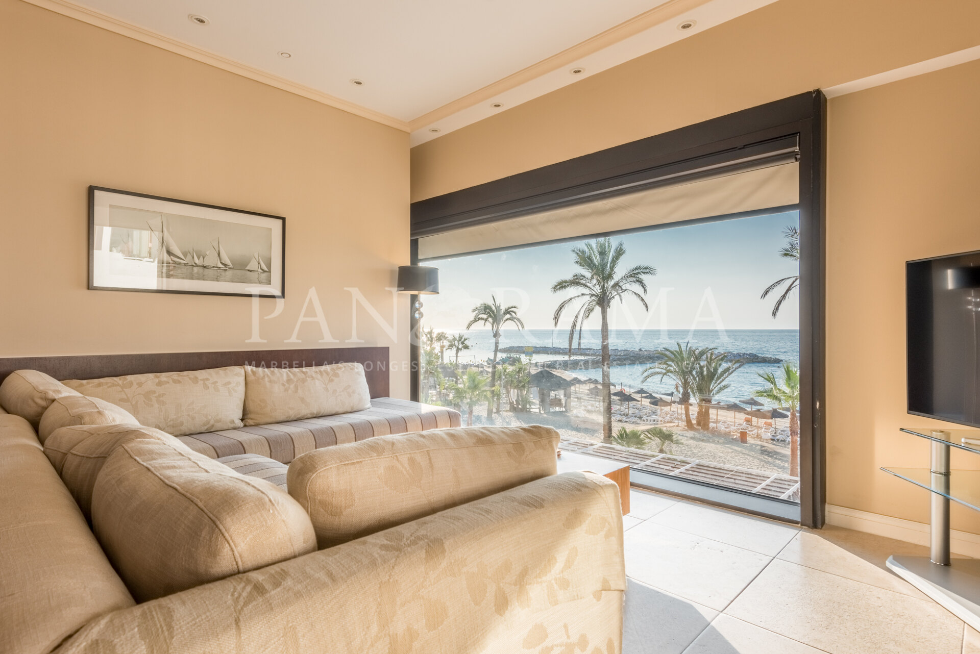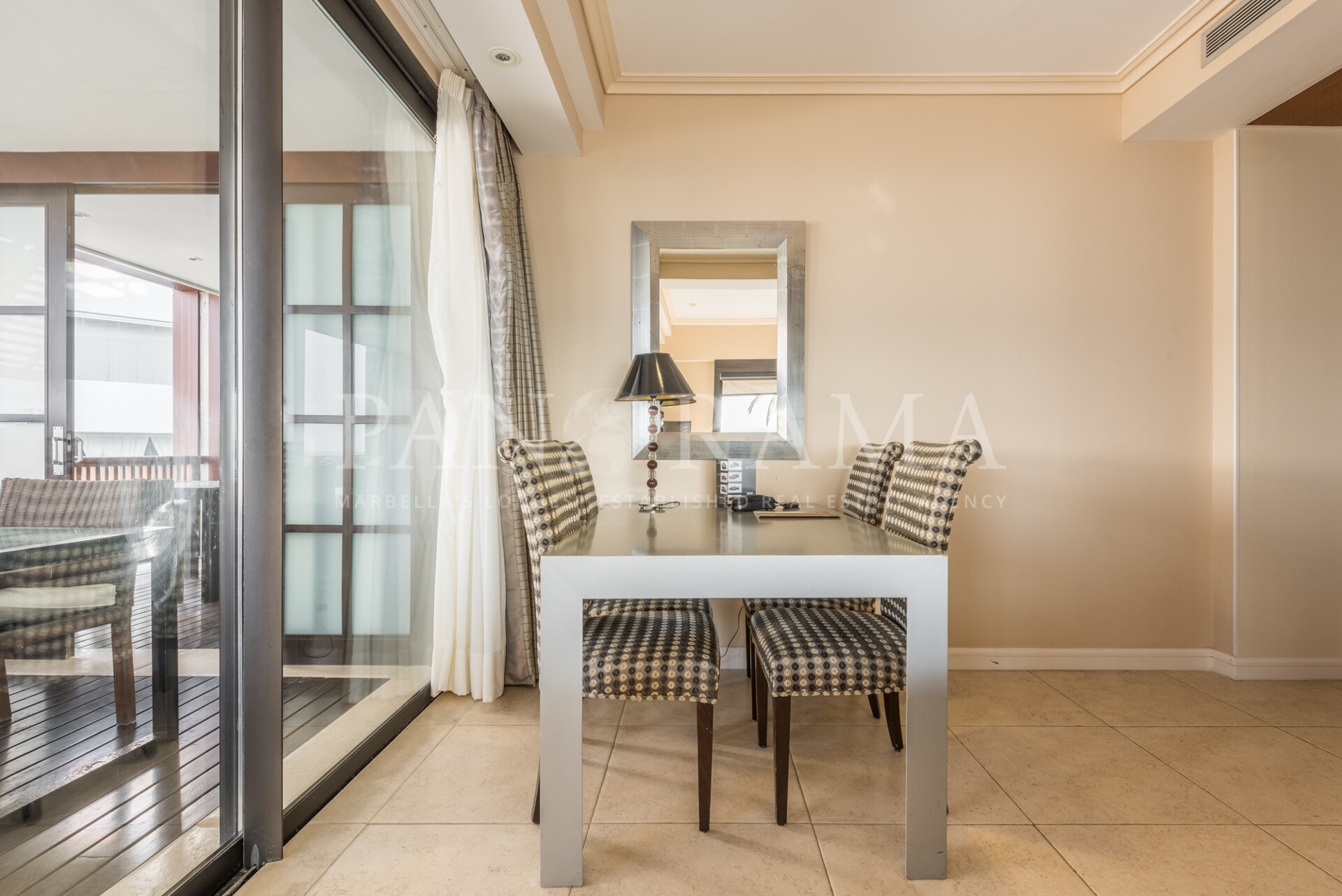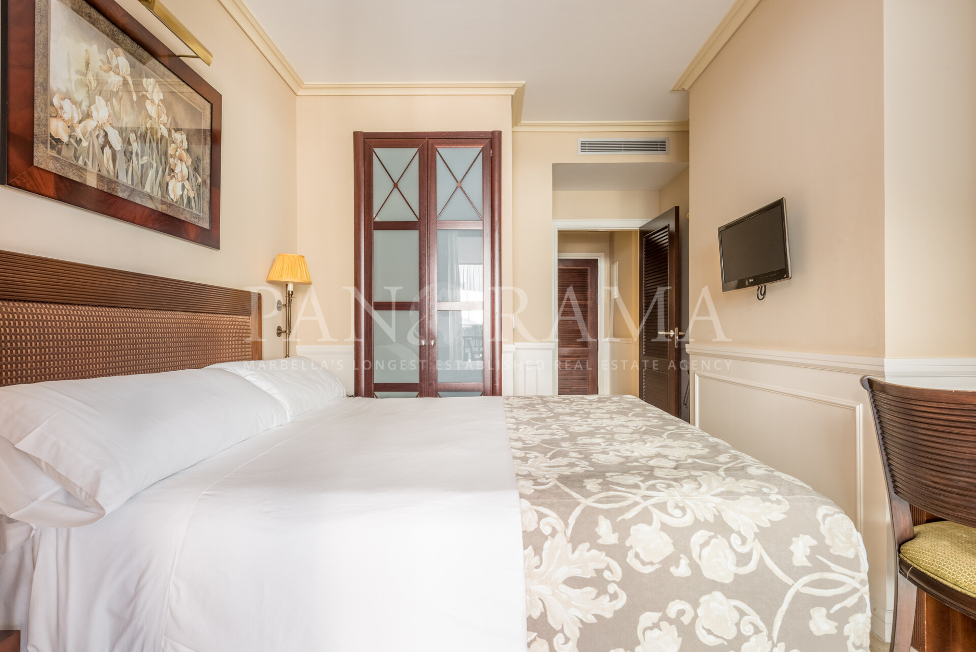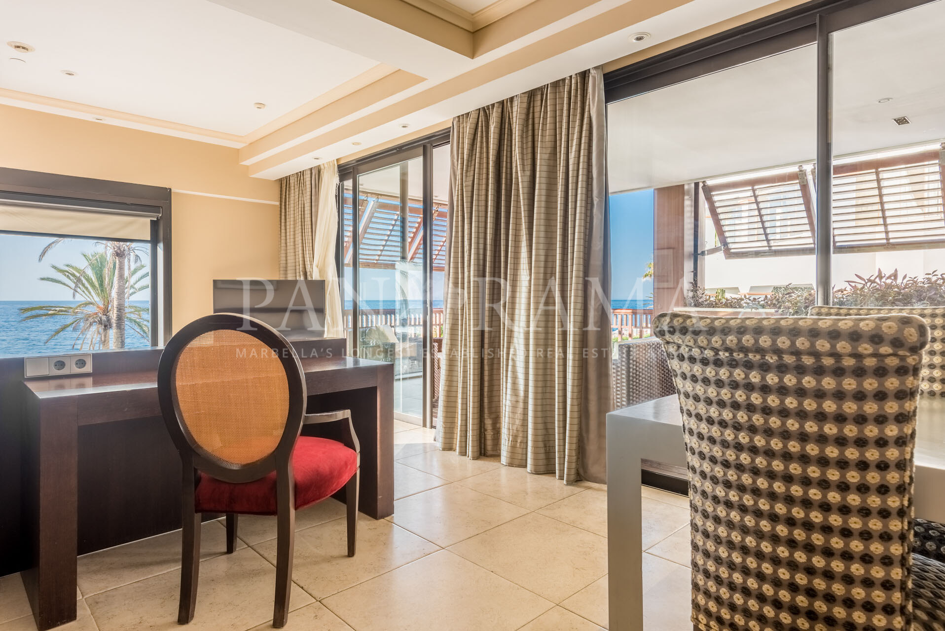 Spectacular beachfront apartment in Guadalpín Banús, Puerto Banús (Marbella), with 3 bedrooms, 3 en-suite bathrooms and superb sea views. The apartment has been converted by the current owners into 3 separate rooms, all with their own private terraces, in order to achieve maximum rental return from this great investment opportunity which is fully managed by Hotel Guadalpín Banús. The main room, which also includes kitchenette and living area, offers frontal sea views from its terrace. The apartment is built in a modern style with an Indonesian influence and avails of the highest of quality finishes such as marble and hard wood flooring and matching carpentry throughout. In terms of installations the apartment has A/C hot and cold, telephone and international satellite television. Guadalpín Banús is a wonderful frontline five-star resort with a large communal pool, fitness centre, several restaurants, bars and also avails of 24-hour security and concierge service. It is also just a short stroll to the heart of the world famous Puerto Banús, where you find boutiques, restaurants, cafes, shops, and many more amenities to hand. Marbella Town with its picturesque historic quarters of cobblestone streets and old churches is also less than a 5-minute drive away. A fabulous property that doubles as the ideal location for personal use or as a savvy investment opportunity.