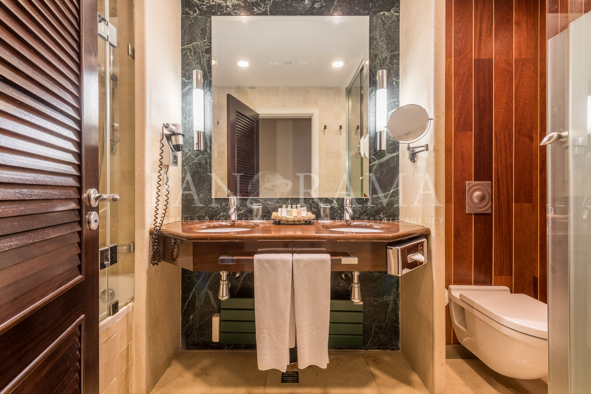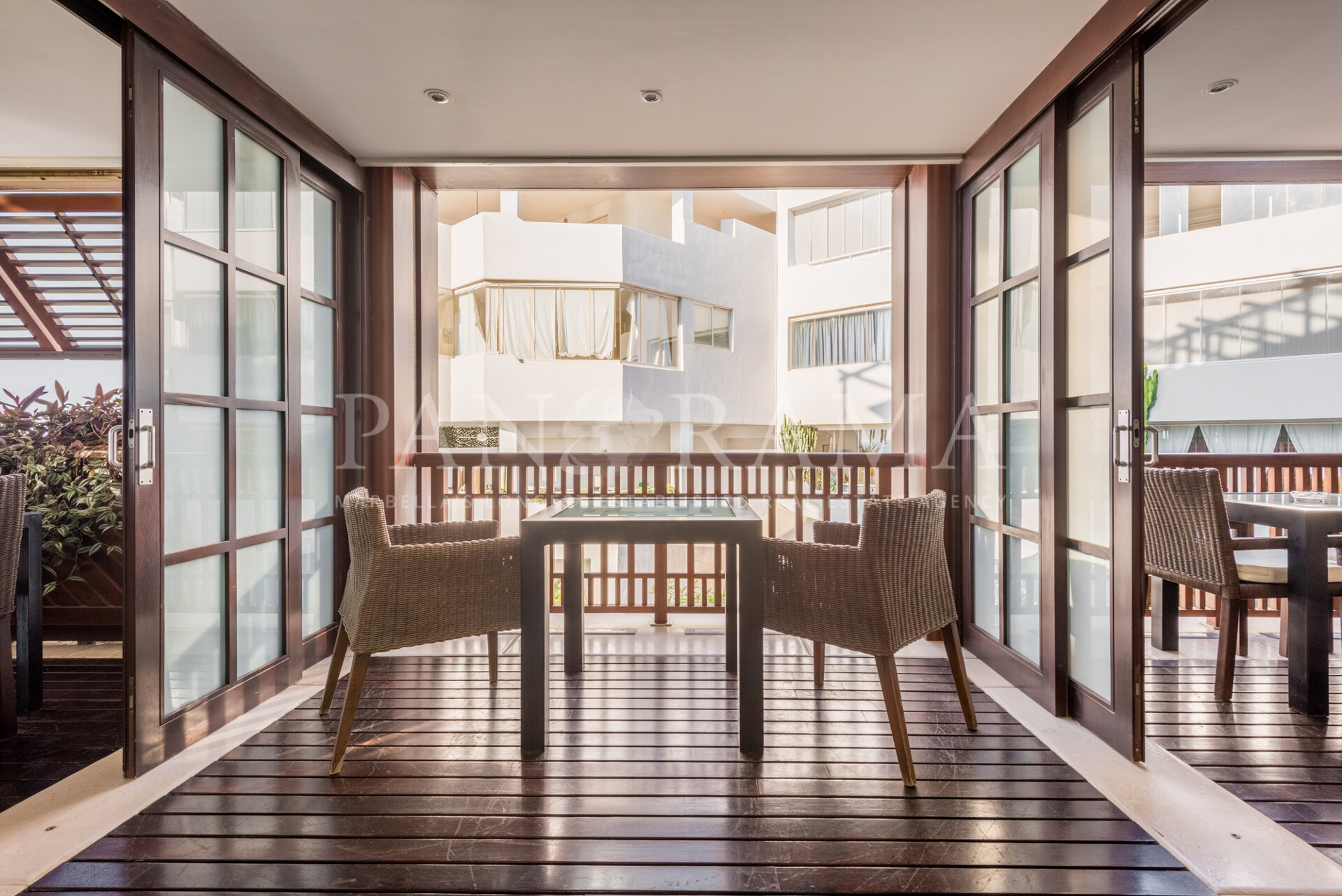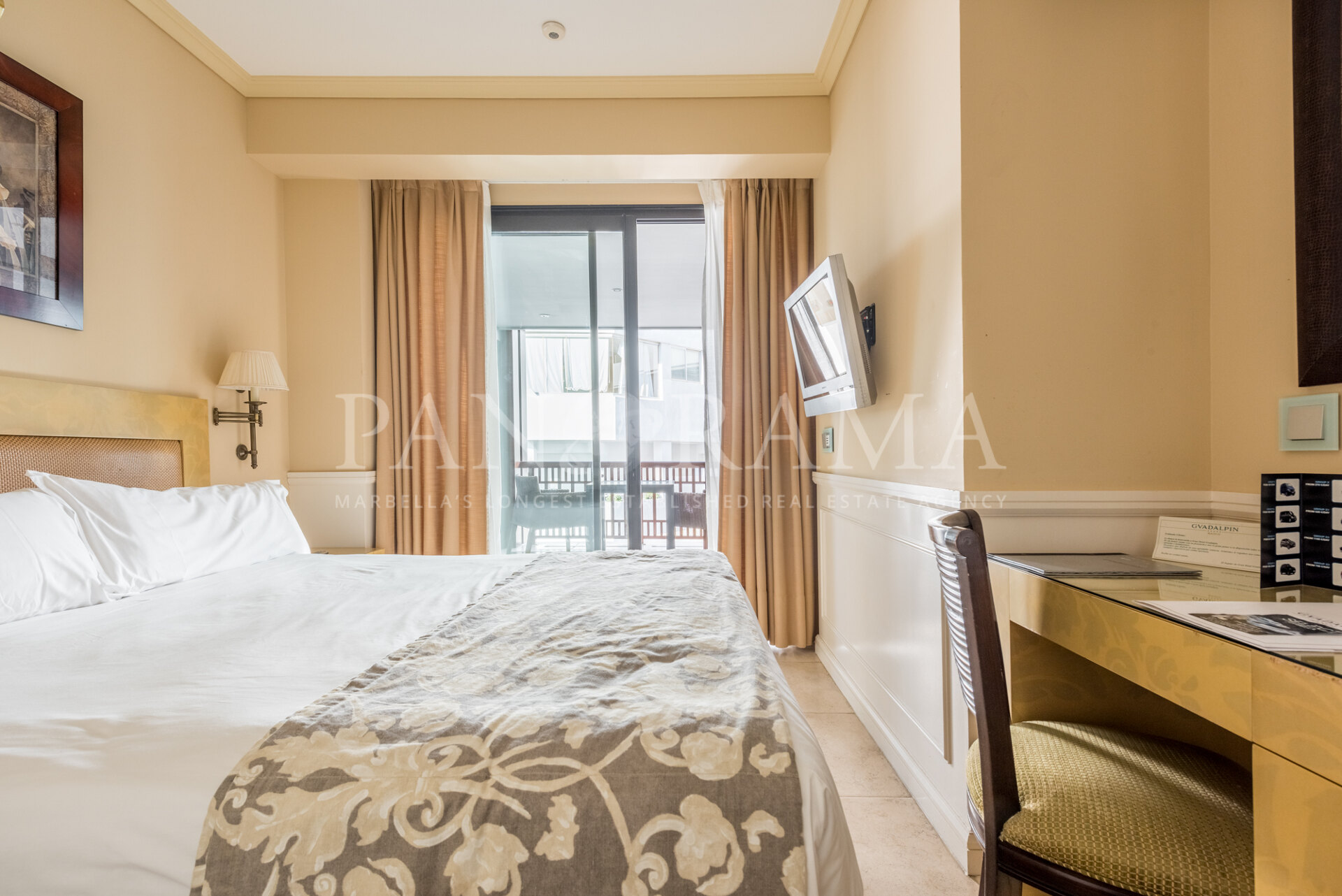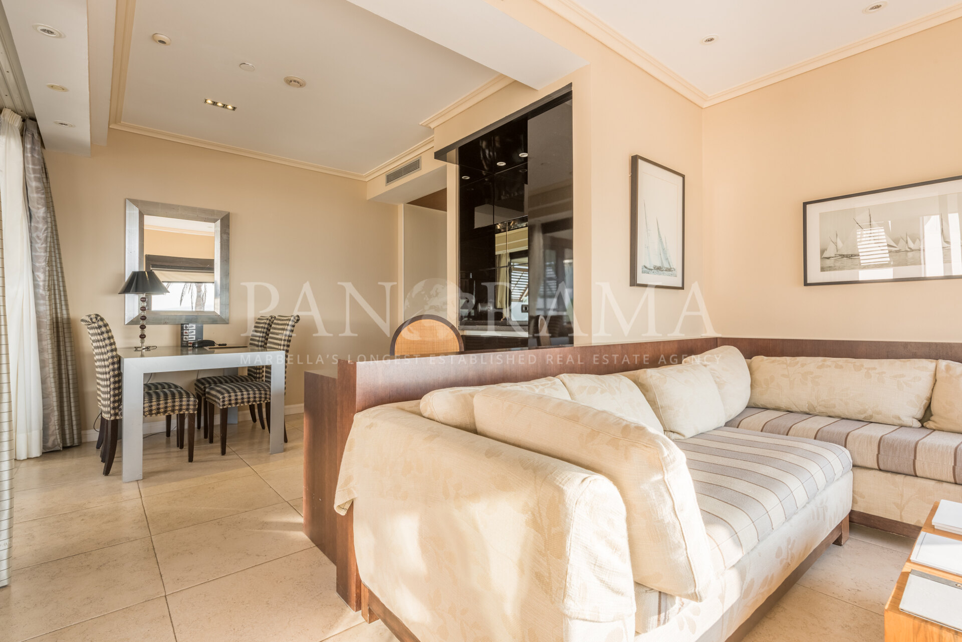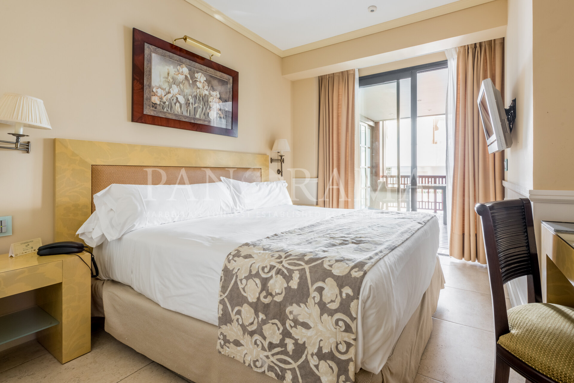 Spectacular beachfront apartment in Guadalpín Banús, Puerto Banús (Marbella), with 3 bedrooms, 3 en-suite bathrooms and superb sea views. The apartment has been converted by the current owners into 3 separate rooms, all with their own private terraces, in order to achieve maximum rental return from this great investment opportunity which is fully managed by Hotel Guadalpín Banús. The main room, which also includes kitchenette and living area, offers frontal sea views from its terrace. The apartment is built in a modern style with an Indonesian influence and avails of the highest of quality finishes such as marble and hard wood flooring and matching carpentry throughout. In terms of installations the apartment has A/C hot and cold, telephone and international satellite television. Guadalpín Banús is a wonderful frontline five-star resort with a large communal pool, fitness centre, several restaurants, bars and also avails of 24-hour security and concierge service. It is also just a short stroll to the heart of the world famous Puerto Banús, where you find boutiques, restaurants, cafes, shops, and many more amenities to hand. Marbella Town with its picturesque historic quarters of cobblestone streets and old churches is also less than a 5-minute drive away. A fabulous property that doubles as the ideal location for personal use or as a savvy investment opportunity.