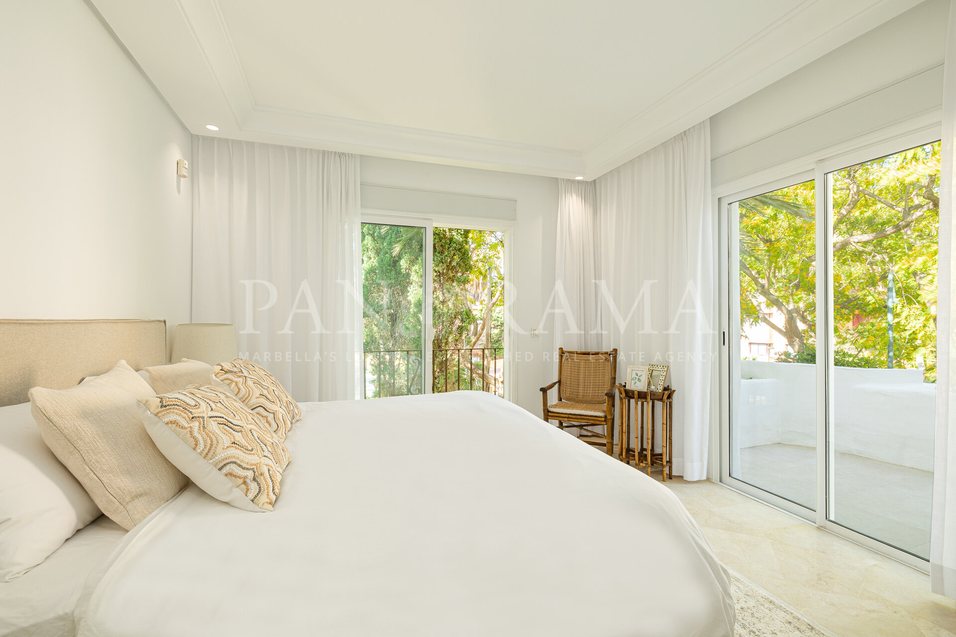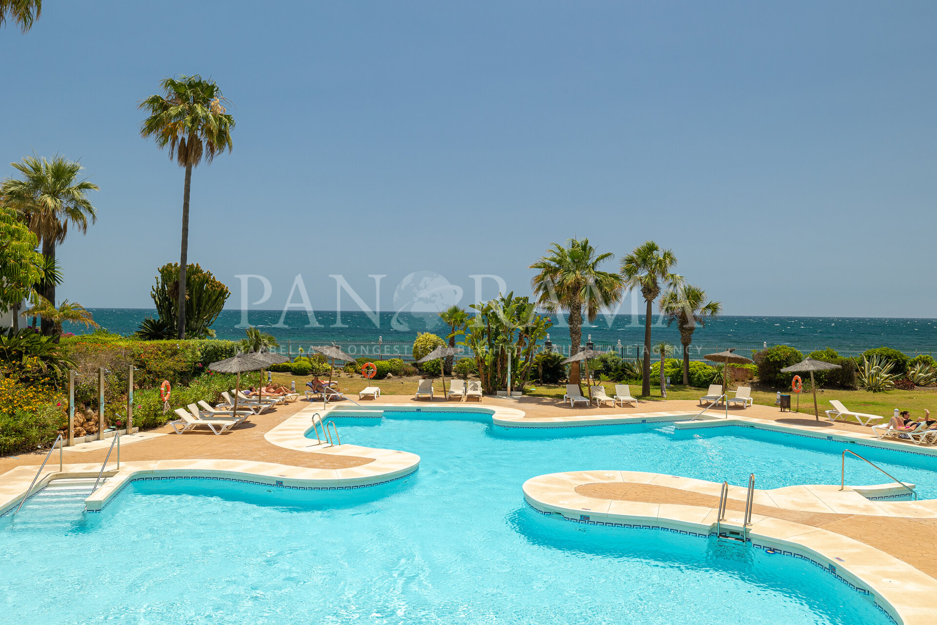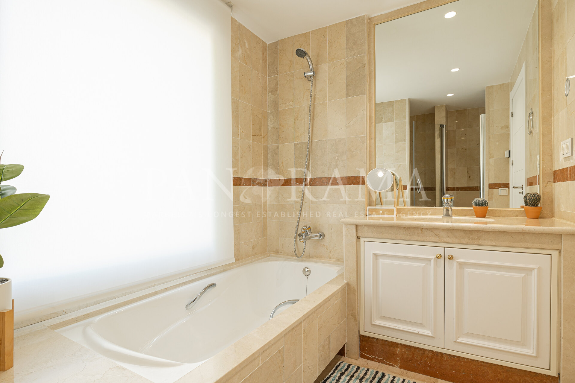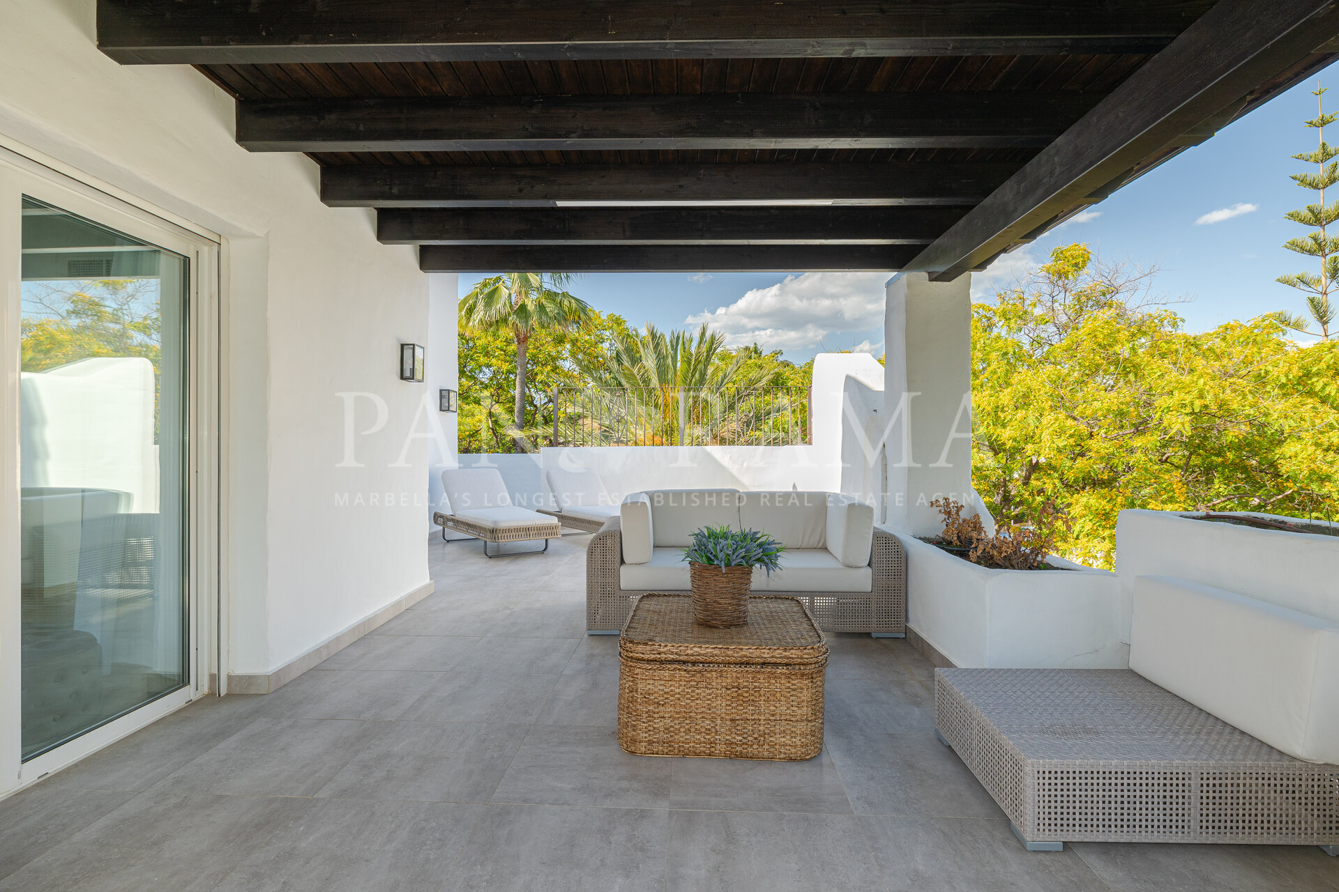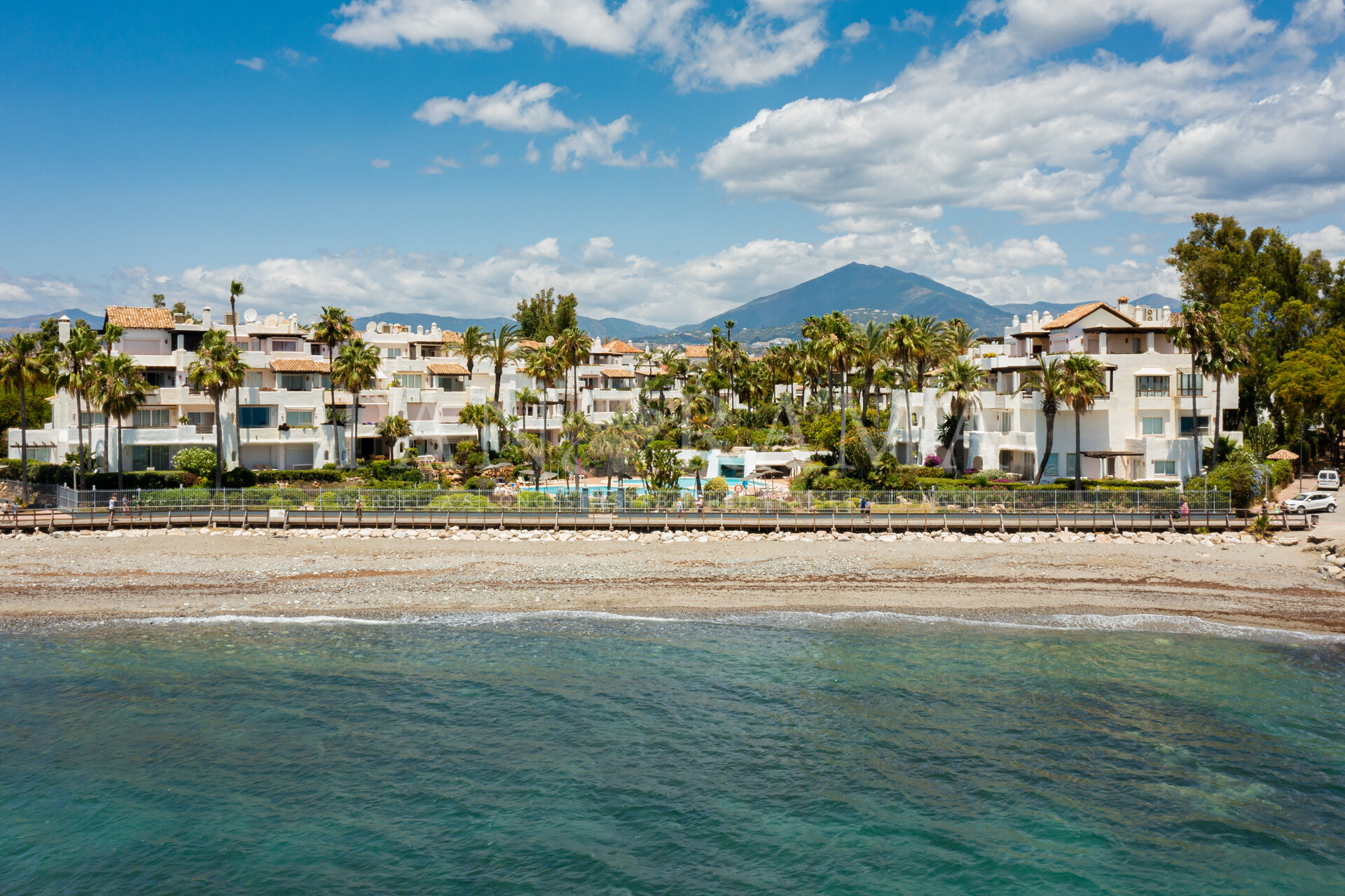 Corner duplex penthouse located in an established area within a short walk to Puerto Banús and San Pedro de Alcántara. Designed by the renowned architect Melvin Villarroel, Ventura del Mar is one of the most prestigious and ideally situated beachfront developments in Marbella. This luxurious complex offers 24-hour security and privacy, meticulously maintained tropical gardens with streams and ponds, a large outdoor swimming pool, and a games and relaxation area with a gym. Residents also have direct access to the promenade and the beach.